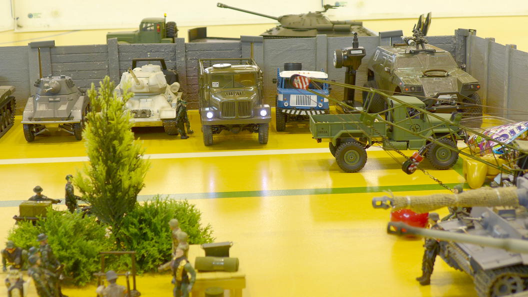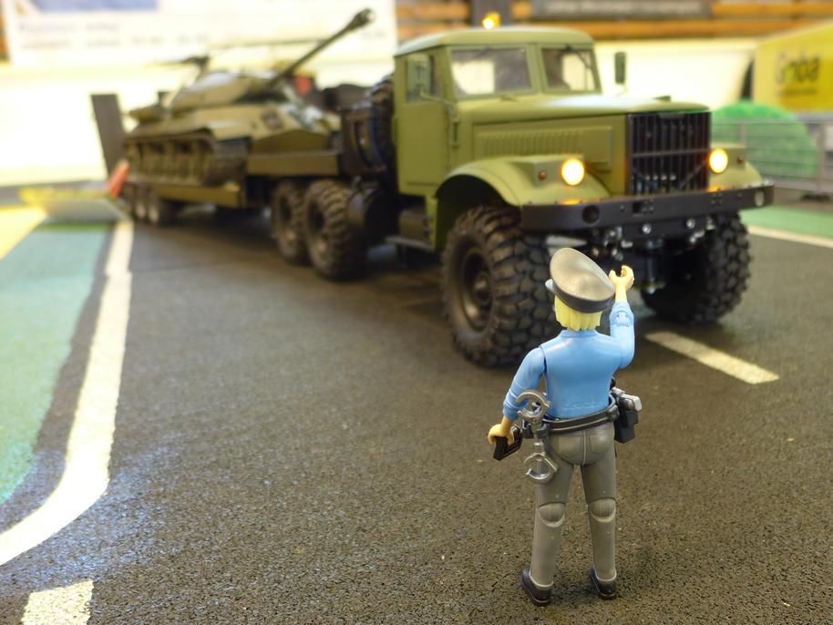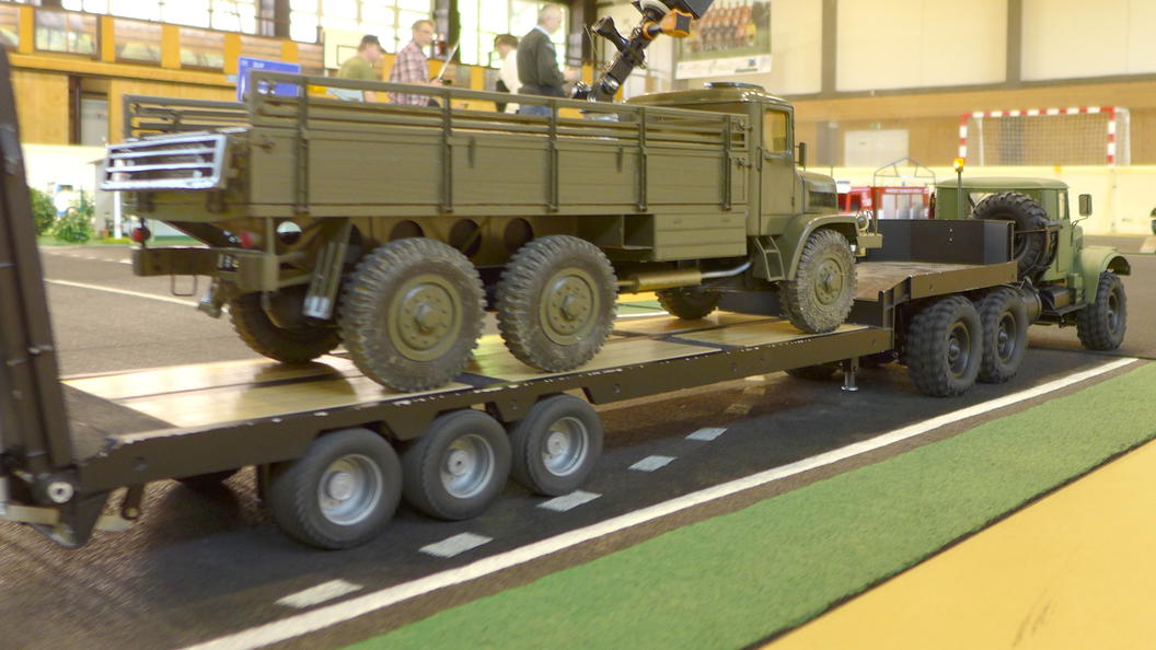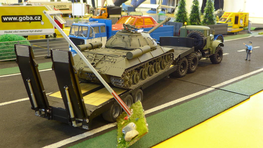 Kraz za sebou táhl podvalník, na kterém se za normálních okolností veze podobně originální model ruského tanku IS-3. Podvalník je pro nás samozřejmě vítaným zpestřením, Tatra se s oběma tanky přetahovala o možnost vjet na podvalník. Mimochodem, tankům to na žluté podlaze haly neuvěřitelně klouzalo. Chovaly se jak koza na ledě. Tatra na tom byla o dost líp.