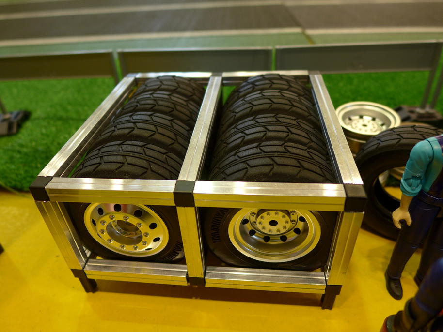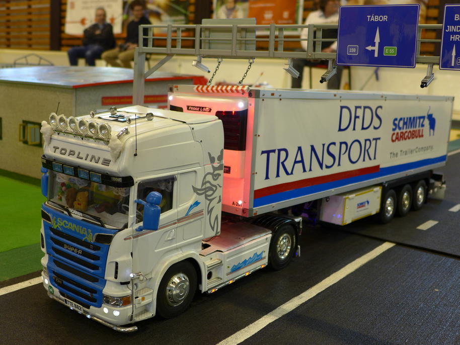 Závodní tahač a jeho vymazlené zázemí závodní stáje už jsme měli možnost obdivovat v Teplicích. Toto jsou originál závodní gumy (na těchto gumách model skutečně jezdí). Tahač předváděl atraktivní jízdu kontrolovanými drifty po kluzké ploše haly a všeobecně bavil diváky.