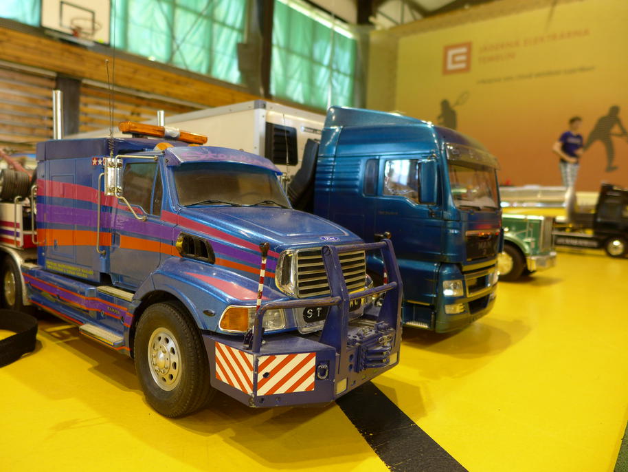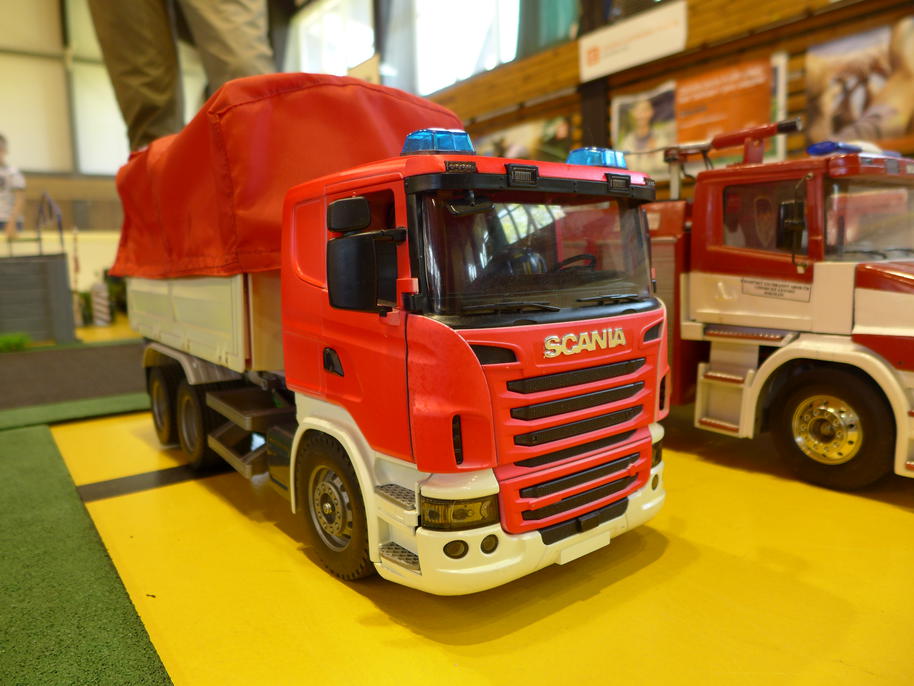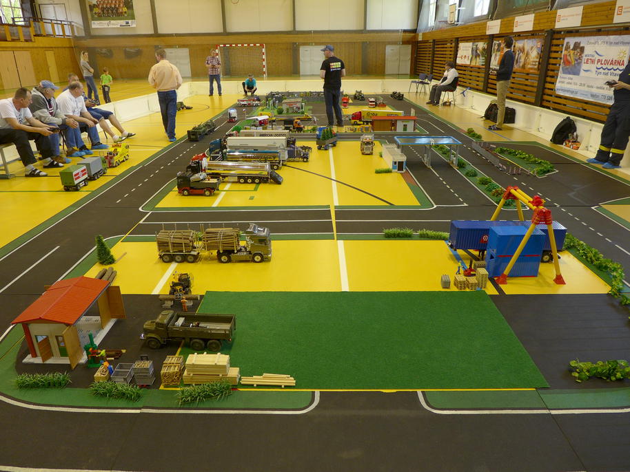 RC Truck sraz se konal v místní sportovní hale určené především míčovým sportům, kterým já osobně moc nerozumím. Je vybavena nějakou speciální žlutou podlahou, která by se neměla poškrábat. Proto zde platilo jedno nezvyklé opatření – modeláři i návštěvníci měli povinně použít přezůvky, nebo aspoň návleky na boty. Pro nás, zvyklé jezdit tím nejhorším terénem, poněkud překvapivý požadavek. Ale respektujeme nařízení ředitele ;) .