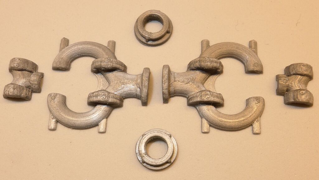 Zkompletovaný odlitek z resinu doplněný o madla a natřený stříbrnkou vypadá skoro přesně jako originál na skutečném vozu. Na jeho konec ještě přibyde samotné ústí vodního děla.