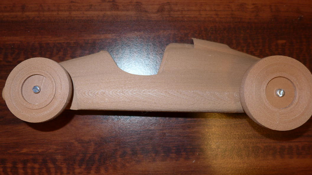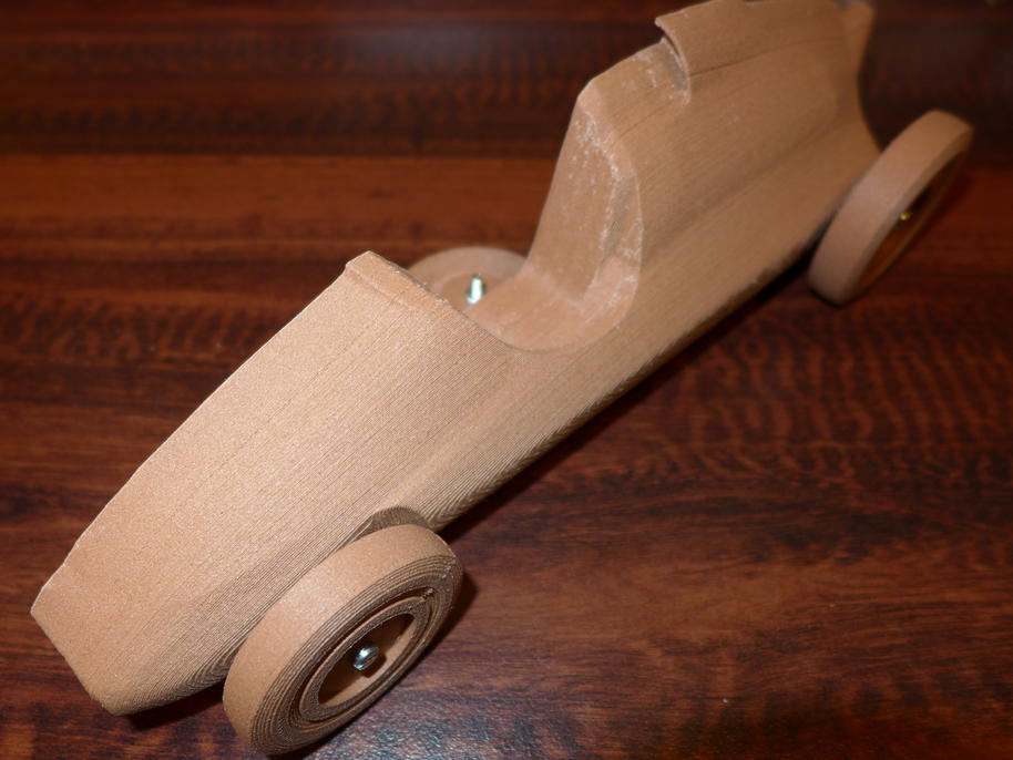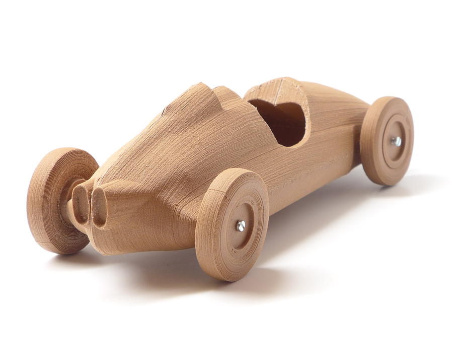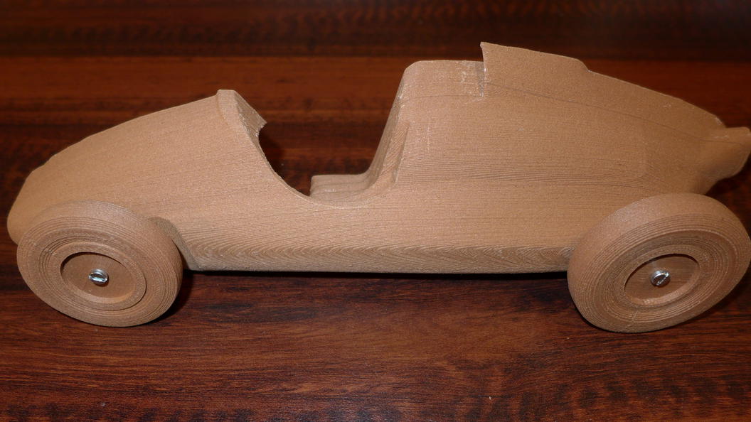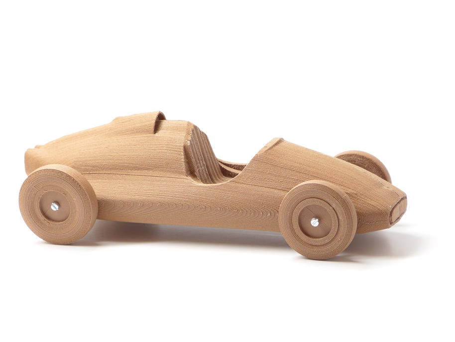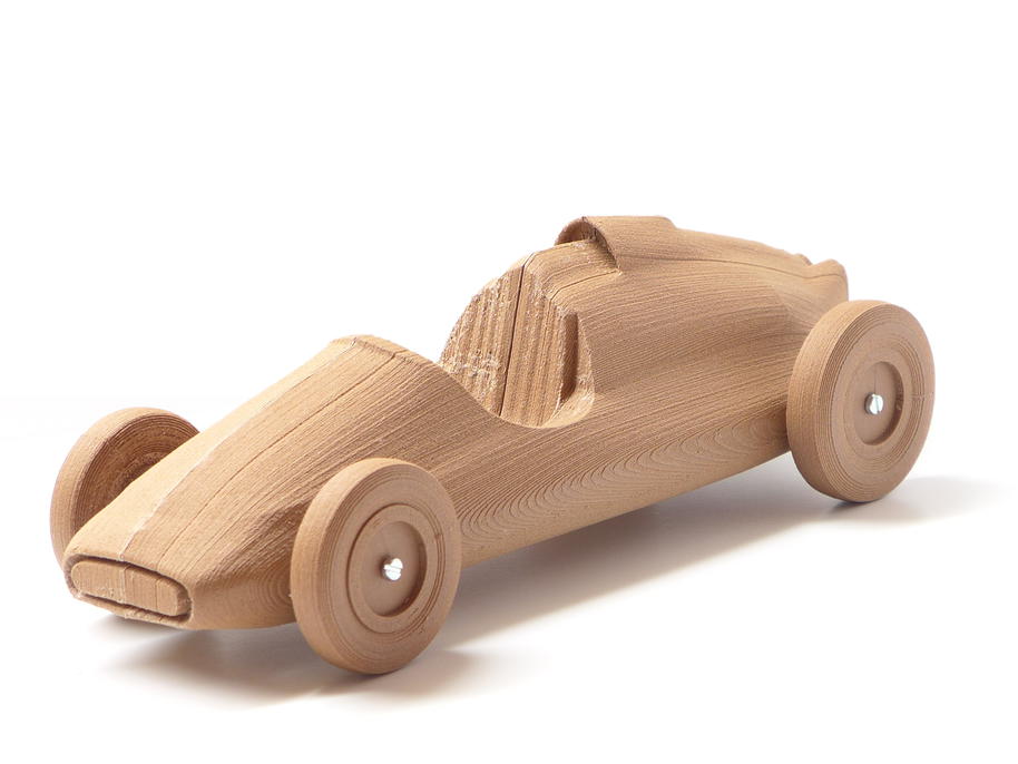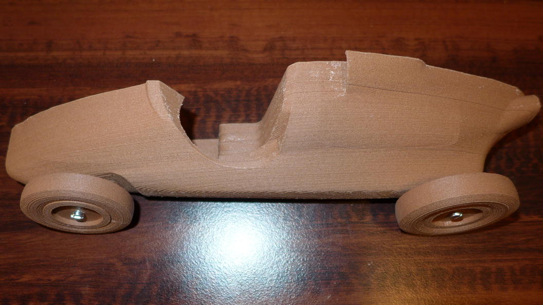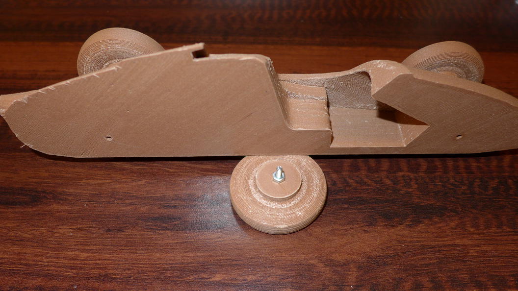 Jako slicer jsem použil KISSlicer, který dělá výborné a bezchybné podpůrné struktury. Tiskl jsem vrstvou 0.2mm (aby to vypadalo jako dřevo), kola rychlostí 20-30mm/s a karoserii nakonec 40-60mm/s. Teplota tisku 165-180°C, opět jsem s tím laboroval, abych zjistil, proč se struna seká.