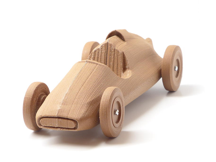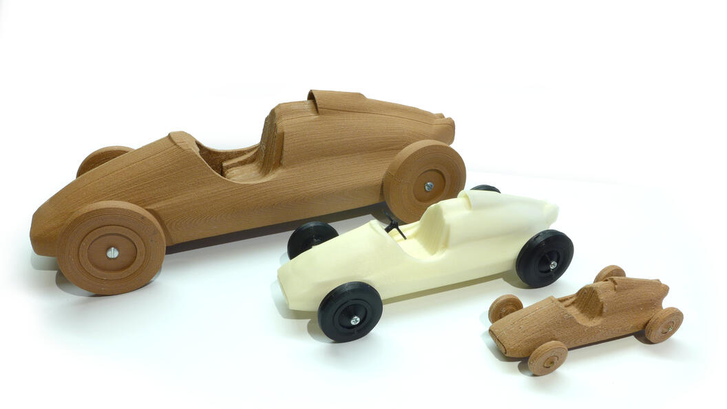 Když už existuje 3D model, tvořit výtisky v různých měřítkách je překvapivě snadné. Zde porovnání dřevěných výtisků v měřítkách 1:14 a 1:43 (ještě tištěno na Felixu) a modelu 1:24 tištěného na Prusa Mini.