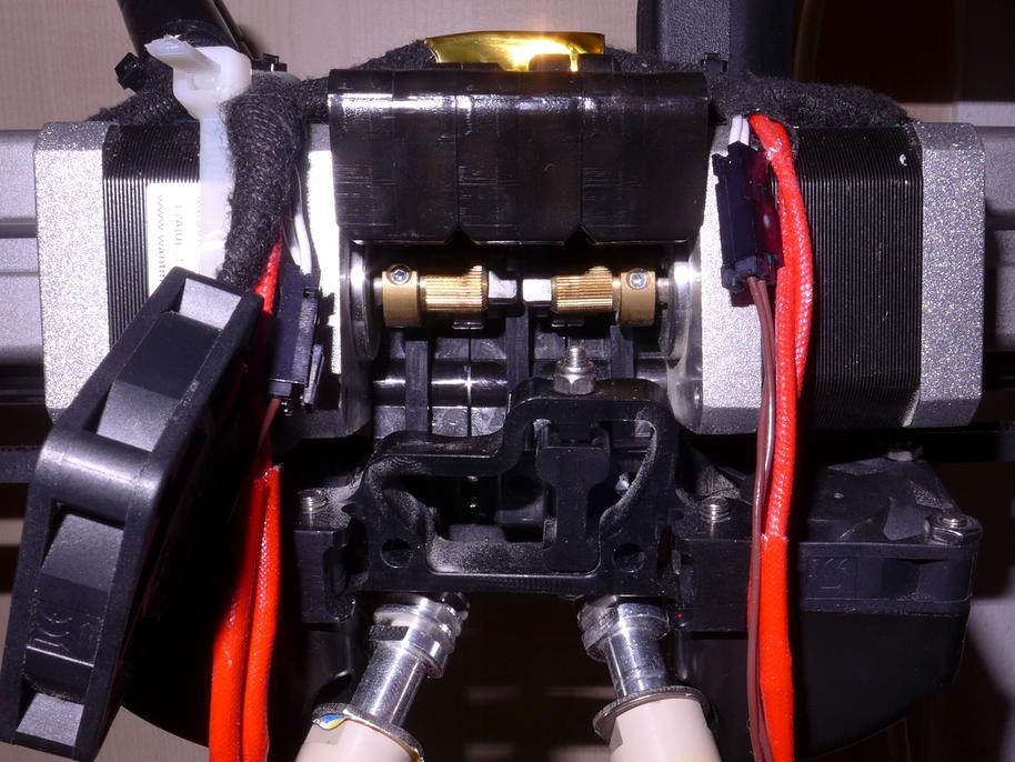 Oprava hlavy znamenala pečlivé proměření a odstranění všech zjištěných nedostatků. Zde je čelní pohled na odkrytovanou a částečně rozebranou hlavu. Je patrný nesprávný sklon druhého (pravého) podavače materiálu extruderu. Na detailu je pak patrná nesmyslná vůle mezi druhým a třetím plastem, díky čemuž nebylo možné druhý extruder nikdy pořádně utáhnout ... tedy dokud jsem nenamontoval upgrade v podobě kovového držáku (ten je naopak velmi pěkně zpracovaný a jsem s ním velmi spokojen). Je zde také vidět podložka tloušťky 0.5mm vložená mezi první a druhý plast na spodním stahovacím šroubu, čímž se deformovaný druhý plast narovnal.