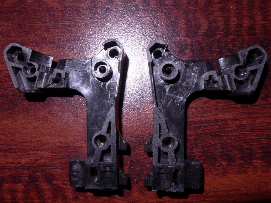 Hlavu jsem opět kompletně rozebral a začal opravovat jednotlivé díly. Jako první jsem vypodložil motor druhého podavače vůči třetímu plastu. Na fotkách je vidět, jak moc deformovaný třetí plast byl. Za ideálního stavu bych pod plast neměl dostat podložky žádné. Ovšem zde jsou nutné podložky tloušťky 0.3mm a 0.2mm. Už jen fakt, že vymezovací tloušťky nejsou stejné o lecčems svědčí :( . Možná by to ještě desetinku sneslo, teď po utažení hlavy a tisku je druhý motor ještě trošku skloněný.