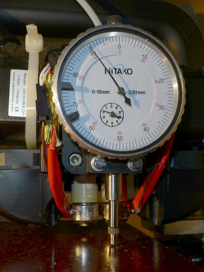 Nemožnost řádně zkalibrovat vzdálenost plochy od extruderů mě přivedla na myšlenku, že by se po proměření dala plocha rovnat softwarově. Strojařům určitě nemusím sáhodlouze měřidlo na fotkách představovat – jedná se o standardní úchylkoměr. Pro mne (jakožto ne-strojaře) se ale už od dětství jednalo o velice zajímavý předmět, který umí hýbat rafičkou při velmi jemném pohybu měřicího hrotu. Nyní jsem si konečně pořídil vlastní kousek ... pěkně mechanický, aby mi do toho elektronika nekecala :) .