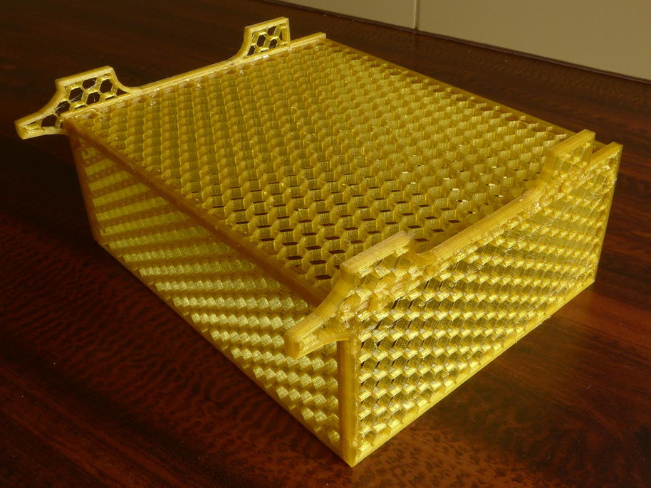 A proč něco takového vlastně tisknout? Šlo o test, zda můj GCODE postprocessor (musím tomu vymyslet jméno :) ) vyřeší korektně ohnutou plochu mého Felixe . Dno krabičky má totiž rozměry 225x180mm, což je téměř celá tisková plocha. Jinými slovy jsem byl poprvé schopen potisknout celou plochu Felixe s perfektním položením všech vrstev. Nový upgrade Felixe to shodou okolností už taky řeší přímo ve firmwaru ... ale tohle byla pro mě výzva a z výsledku mám zase radost.