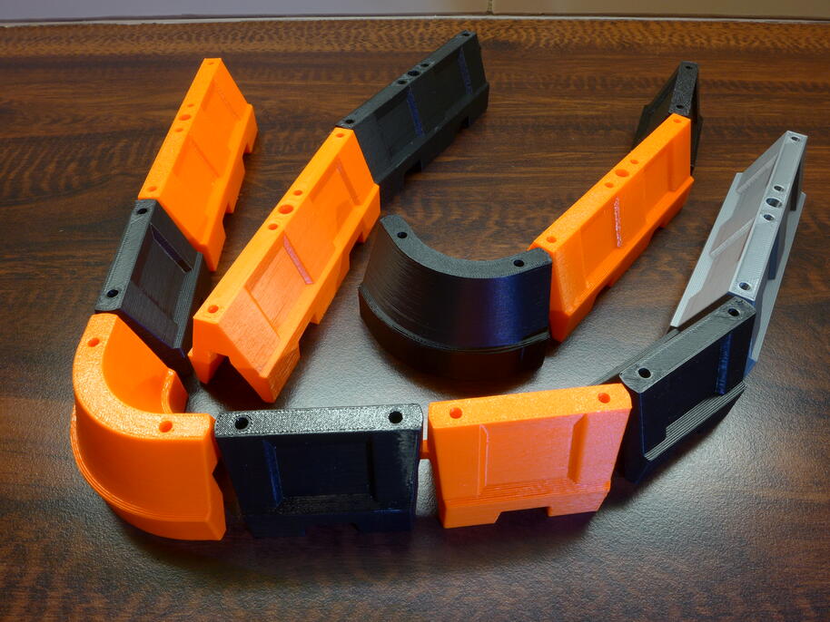 Nakonec bylo svodidel výrazně více, přibyla červená a bílá varianta z PLA ... byla toho plná Tatra ;) . Dlouhé svodidlo se bez deformace z ASA zatím vytisknout nepodařilo, je to předmětem dalšího ladění technologického postupu tisku.
