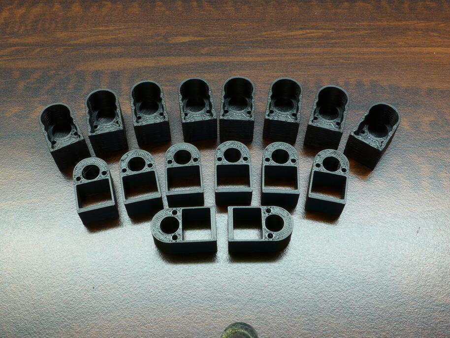 První sada "Průša-style" – výtisky z firemních barev černé a oranžové – ASA, PETG a stříbrného PLA (ověřovací výtisk pro další experimenty) + další drobné konstrukční díly z ASA.