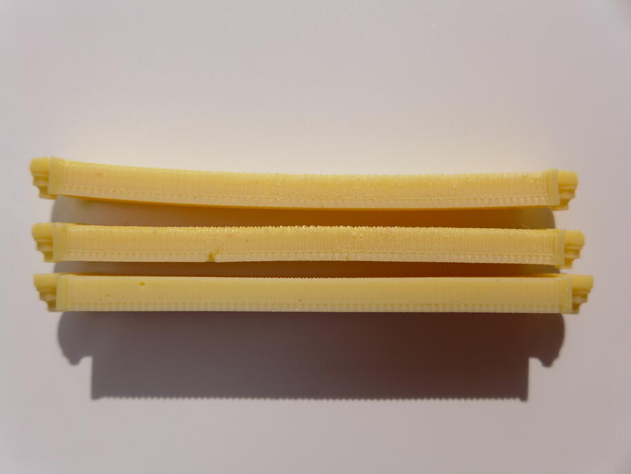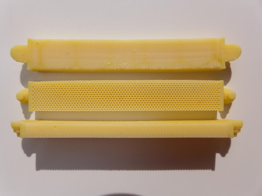 Ze zdrojového 3D modelu ubyla jedna řada šestiúhelníků a článek byl zespodu doplněn souvislou vrstvou, což mělo zajistit lepší výtěžnost a kvalitu SLA výtisků (předpokládali jsme tisk na plocho). Překvapivě se tak nestalo a výsledky dopadly ještě hůře než předtím.