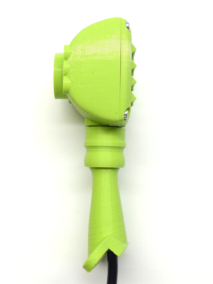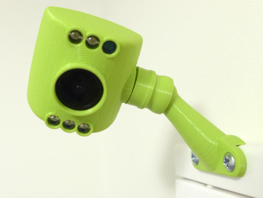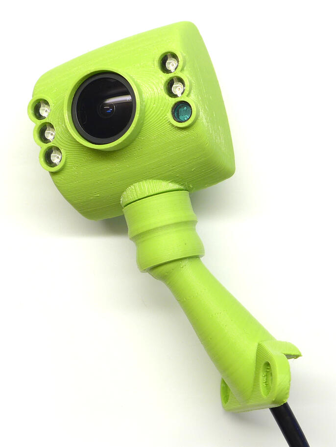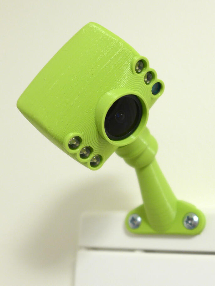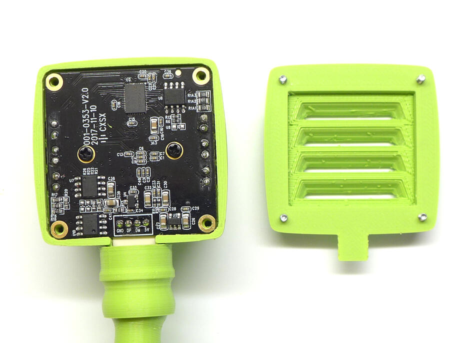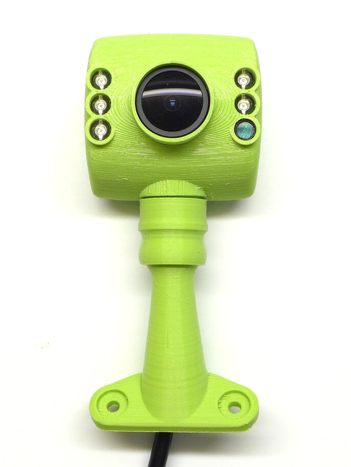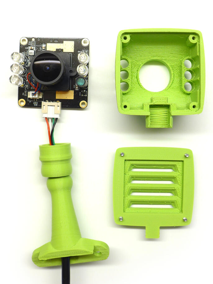 Krabičku jsem navrhl minimalistickou, organicky kulatou a s kuří nožkou, na které bude našroubována do cílového umístění. Nožkou prochází USB kabel. Ten je u kamerky zakončen JST konektorem, který lze snadno nedestruktivně rozebrat, čímž se minimalizuje díra, kterou je do nožky potřeba "vyvrtat". Celý obal je tvořen ze 4 kusů – hlavní pohledová část zakrývá celou destičku kameru včetně objektivu a LED přisvícení, zadní stěna je záměrně doplněna žebrováním pro lepší chlazení (očekával jsem, že se kamera bude hřát), celé je to dole spojeno do kulového čepu který je nasazen na nožce.