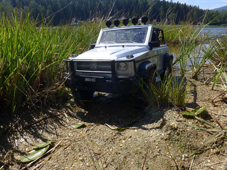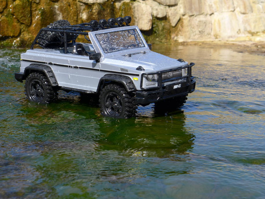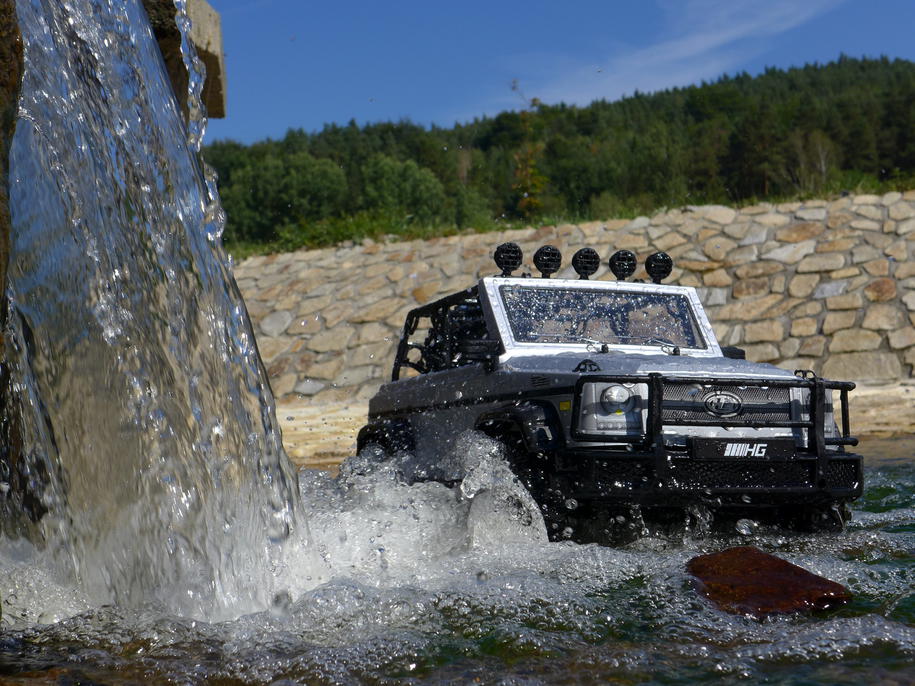 Axle crossing is reasonable, approach and departure angles are limited by the bumpers as by the real Mercedes G63. However, the bumpers can withstand really hard driving on the HG P402 .