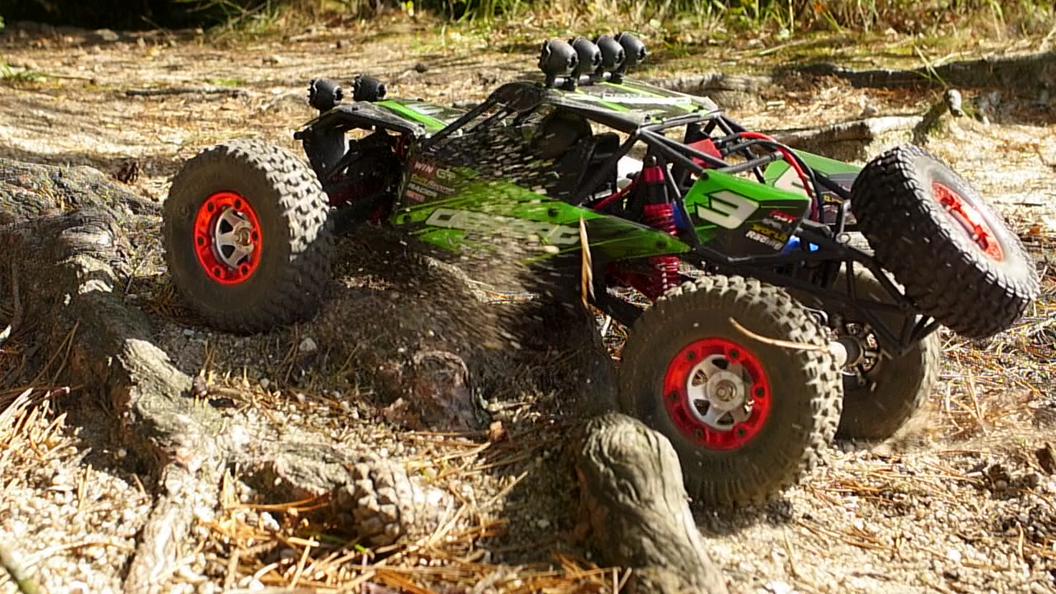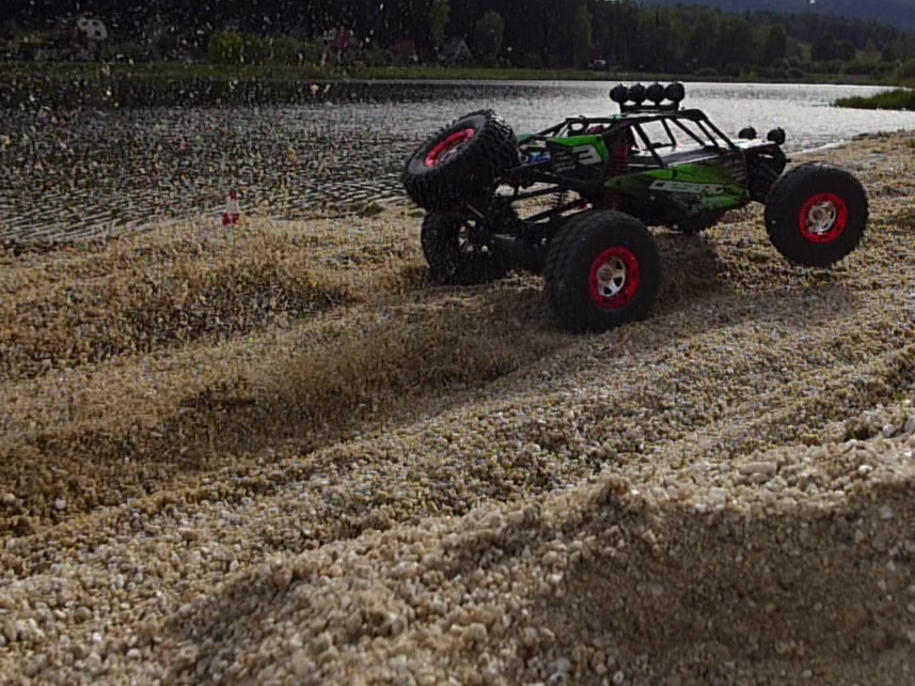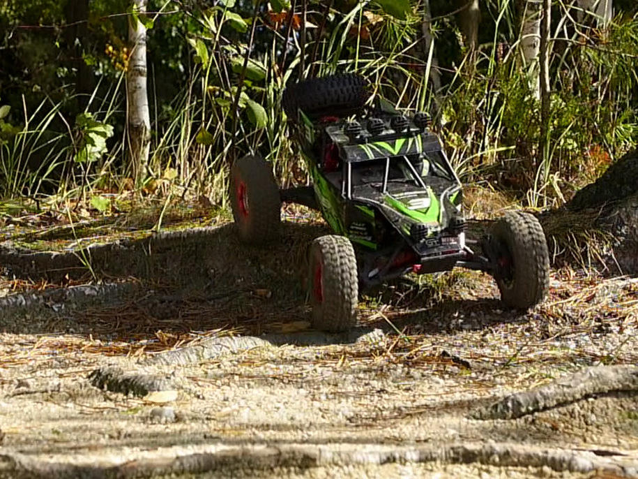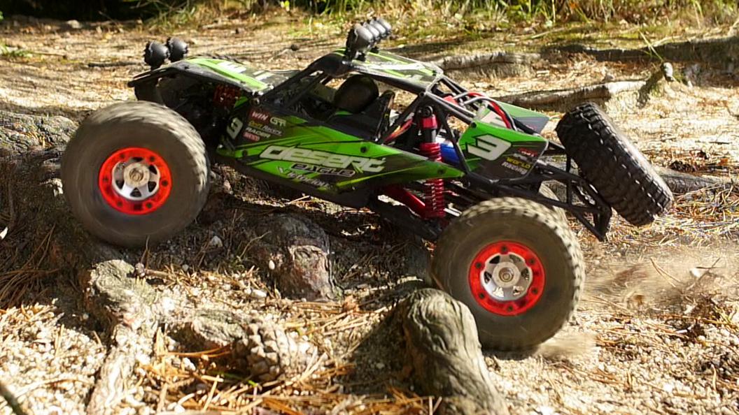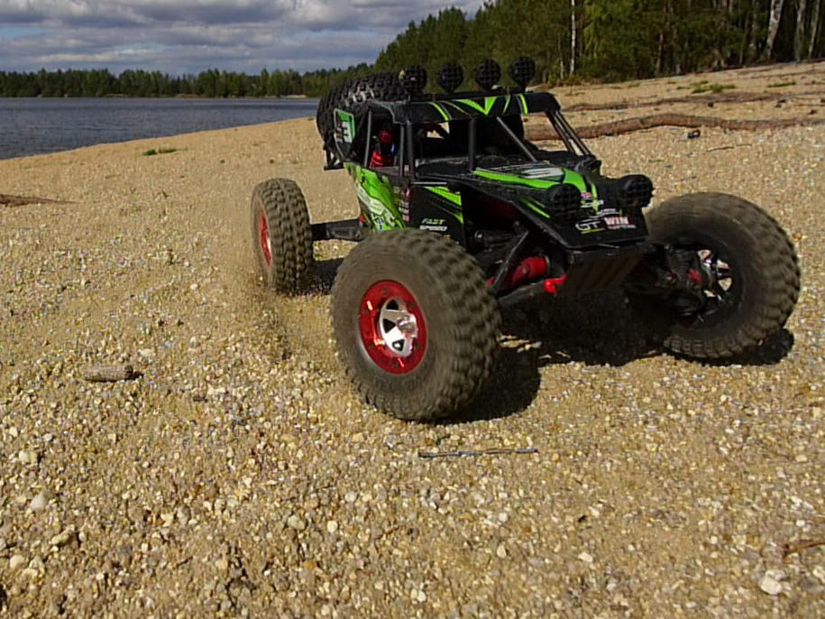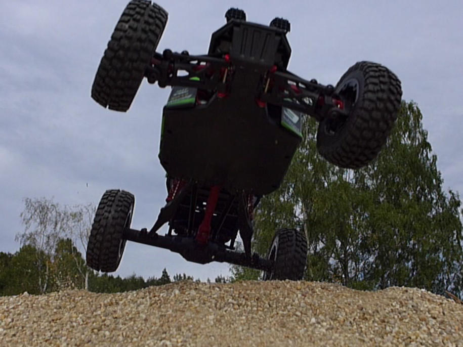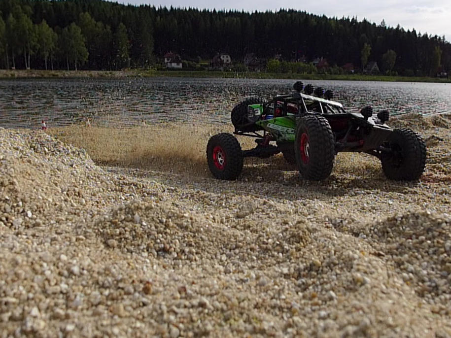 When I first saw this car, I knew this was not designed for slow and precise off-road driving. This is a raw off-road racer. It does basically only one thing – to run fast off-road. Even on the box they say it runs up to 40 km/h ... multiplied with scale that's almost 500 km/h! Such a real buggy would be a great and often deadly challenge to most drivers :). That's why the whole video is composed of slow-motion shots so that you can enjoy the functioning of the chassis in detail even at high speeds.