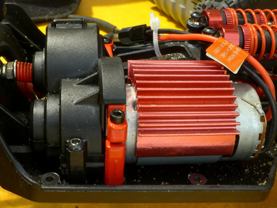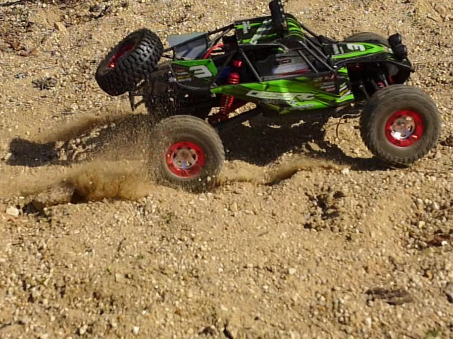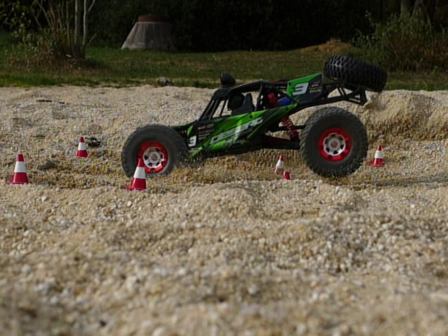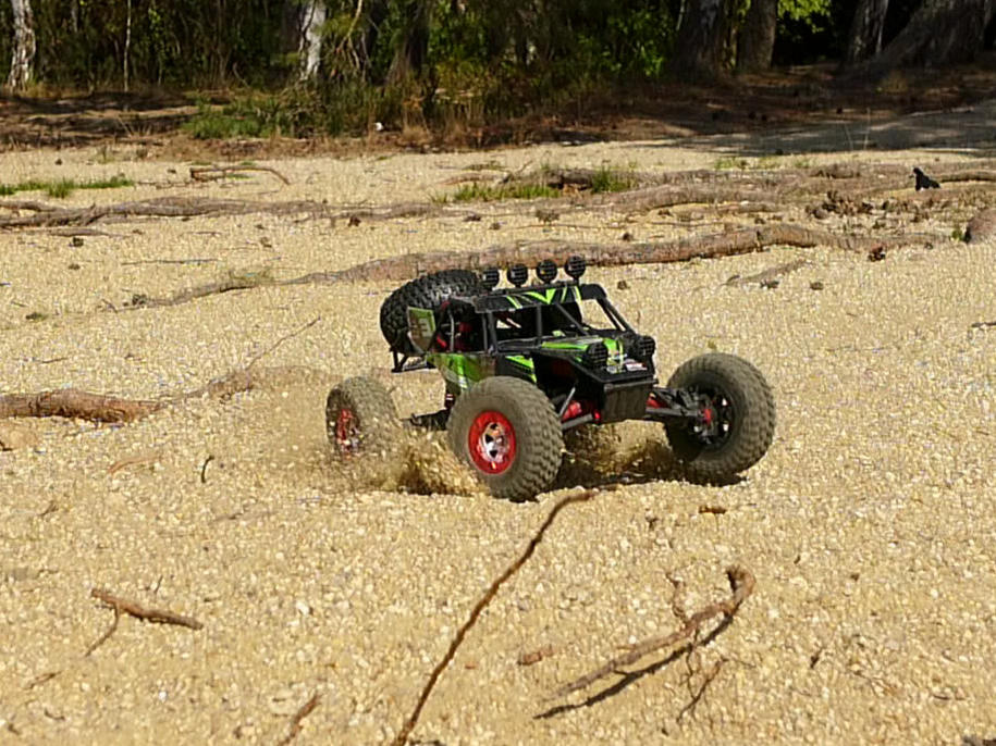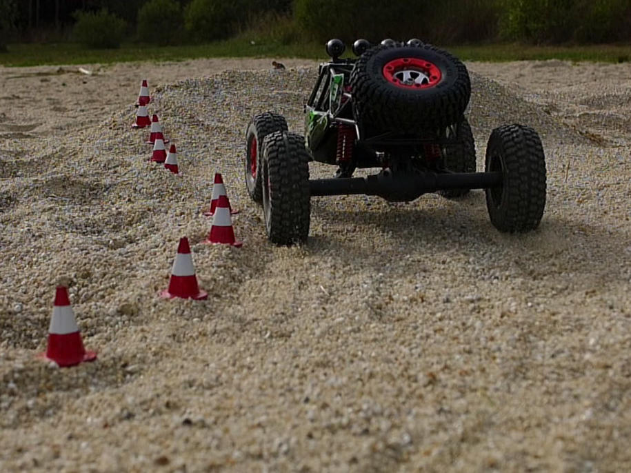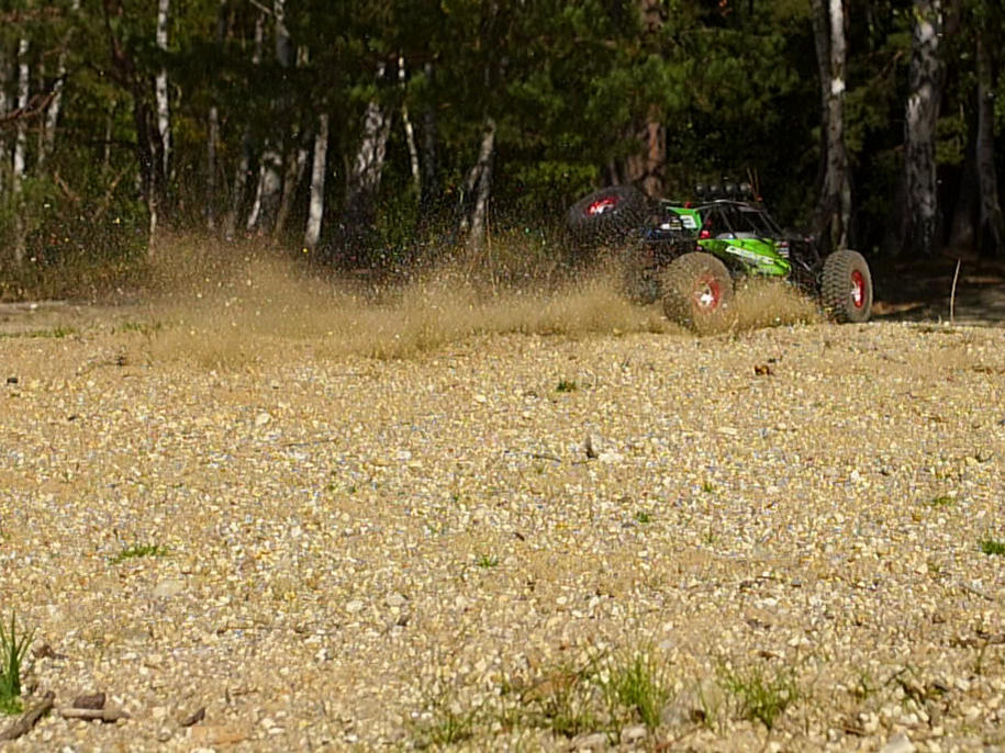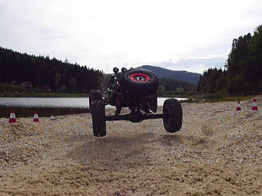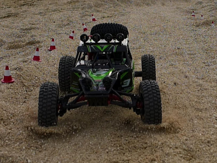- Steering – someone asked me if the steering is sloppy – so far I can say, that mechanicaly the steering is designed and manufactured well, the steering joints have no apparent loosenes (yet :) ), at least on my Feiyue-03 . Steering control has one interesting feature – you can limit the steering lock on the transmitter (the range of the steering servo). The steering geometry changes with suspension travel (this is inherent to independent axle design). The steering servo reacts jerky and has some delay (it stayed the same even after the water accident). Maybe it's normal, I do not know. When you do rock crawling you probably wouldn't care, you drive slowly and have a plenty of time. But controlling this "cruise-missile" is rather hard, especially in the rugged terrain of loose sand. It was more like a fight for survival at high speeds. You have a really short time for every reaction, notably when you try to drive to make it look attractive on the video – i.e. pedal to the metal, huge spray of sand flying off all the wheels, car at permanent skid :) . Therefore, following a narrow path precisely was almost impossible and many runs have had to be made and recorded.