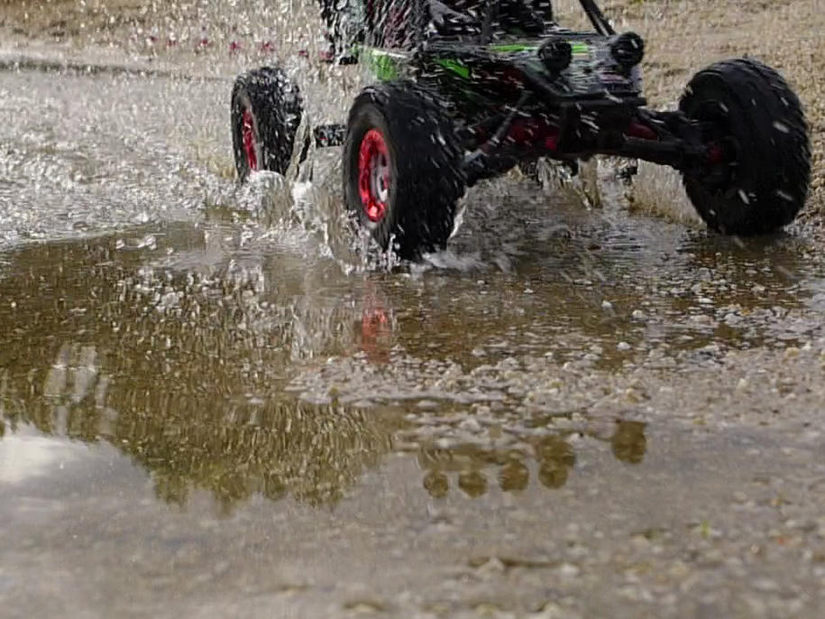 Water is a major threat – since the Feiyue-03 is very fast and its steering is not absolutely accurate (and I don't have that reactions :) ), one of the shallow water runs went wrong – the right front wheel got caught by deeper water and the whole car was flooded within a split second. You can see the situation on the video. It didn't look that bad, but you must consider the fact, that the front part of the car is open, so basically a water wave went throught the car all the way over the electric motor, servo and receiver too. The car managed to do a few more video shots, but then stopped completely. Unlike the HG P402 , the Feiyue-03 is NOT a "submarine" and if water gets inside you are in trouble.