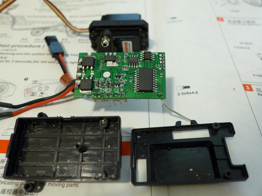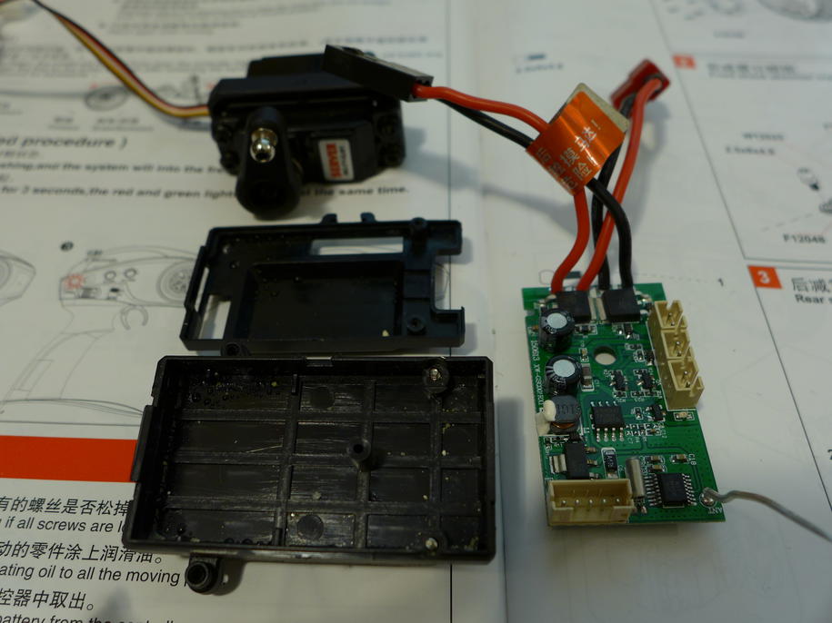 After returning home, I disassembled the electronics in the car including the receiver. When it all dried up, the car returned to normal behaviour except for driving reverse. Now the car does not want to drive reverse at all. If I press the gas lever to reverse position on the transmitter – nothing happens. And no matter whether the sensitivity is set to 50/50 or 70/30.