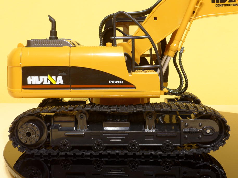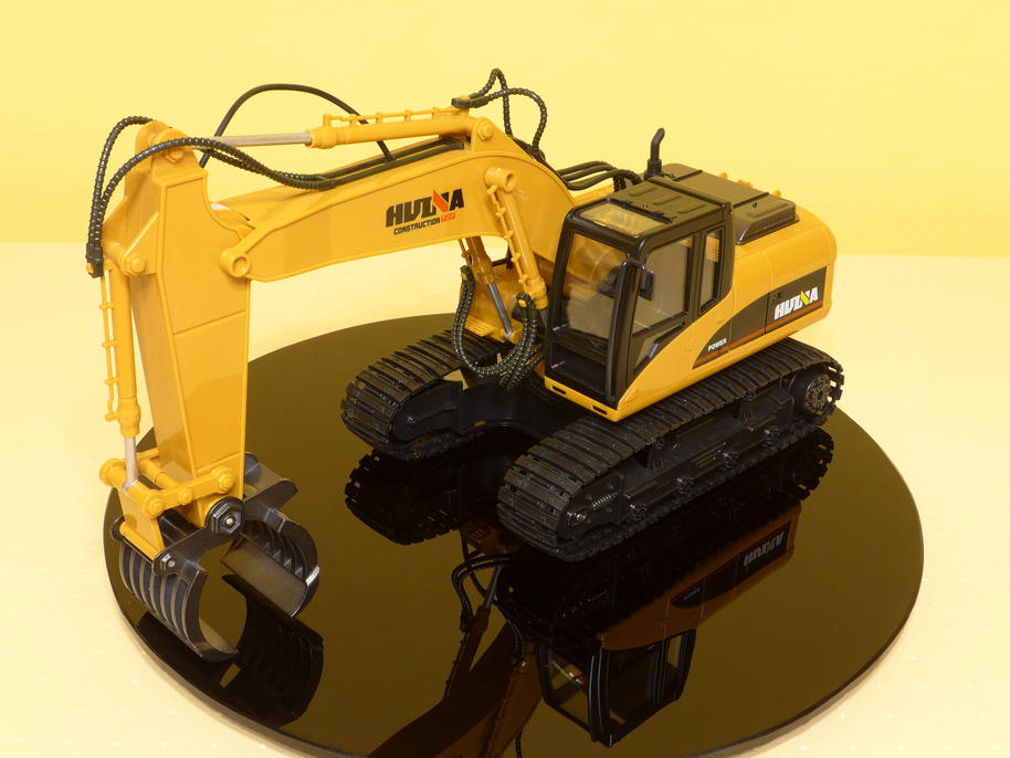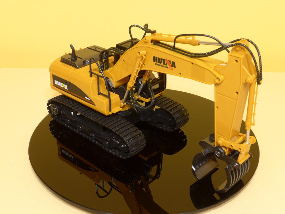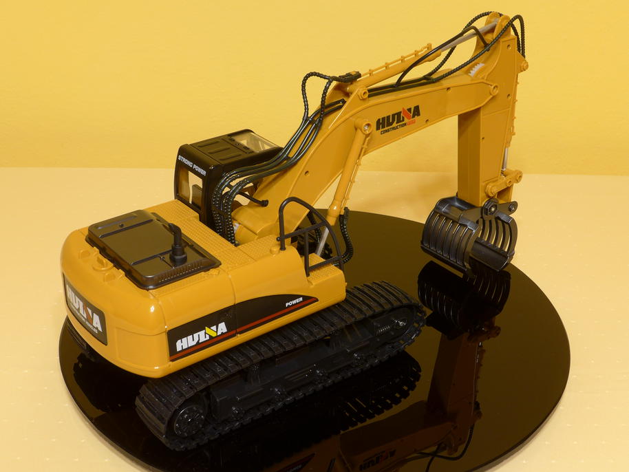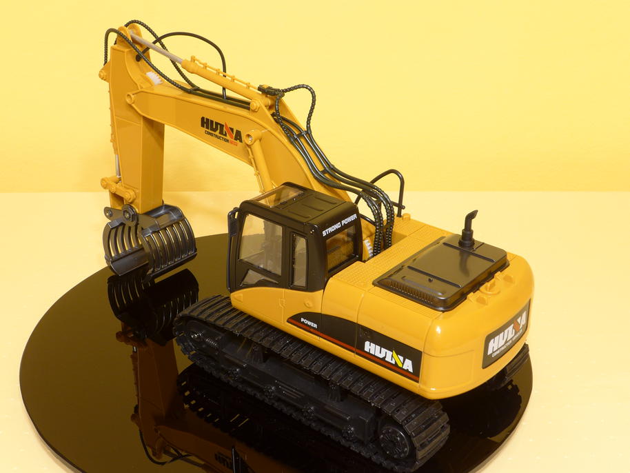 The whole bodywork is made of plastic and contains many cool details. It shall definitely mimic the look of a Caterpillar 320, but of course due to licensing issues the stickers just say "HUINA". On our presentation table it's colors even go very well with the surrounding environment :) . Only the log grabber is made of some metal alloy, in fact there are very few metal parts on the excavator.