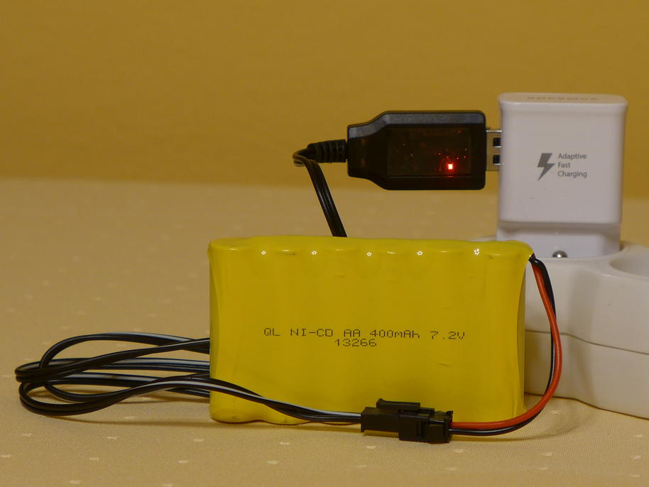 The battery is located in the back of the excavator and is accessible from the top (clearly shown in the video). The charger is a small thing with a USB-A plug on one side and a cable with a connector for the battery on the other one. You can stick it into a computer or a cell phone charger or anything else producing 5V and 1A (which, according to the USB standard, means you can only safely use USB3 or higher, because USB1.1 and USB2 are limited to 500mA per port). When I first saw the charger I really didn't believe it too much and looked for a compatible charging cable for my big trusty RC fast charger. But the charger seems to understand the behaviour of the 400mAh NiCd battery pack – it does not over-charge it and stops charging when the battery looks full. There is quite a large amount of space around the battery in the upper compartment of the excavator. It should be possible to fit some 8xAA-cell holder and fill it with higher capacity cells.