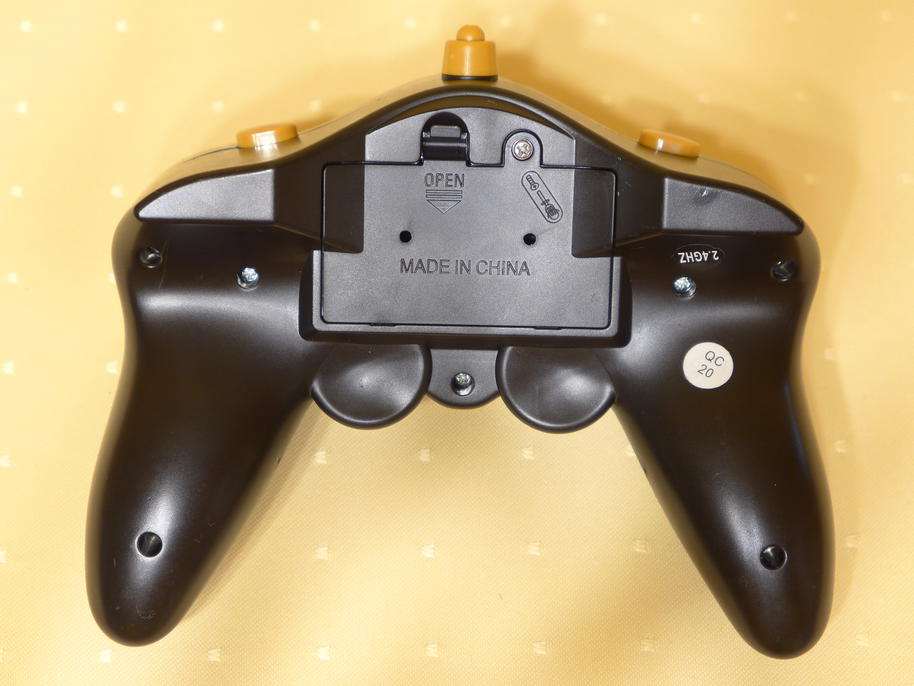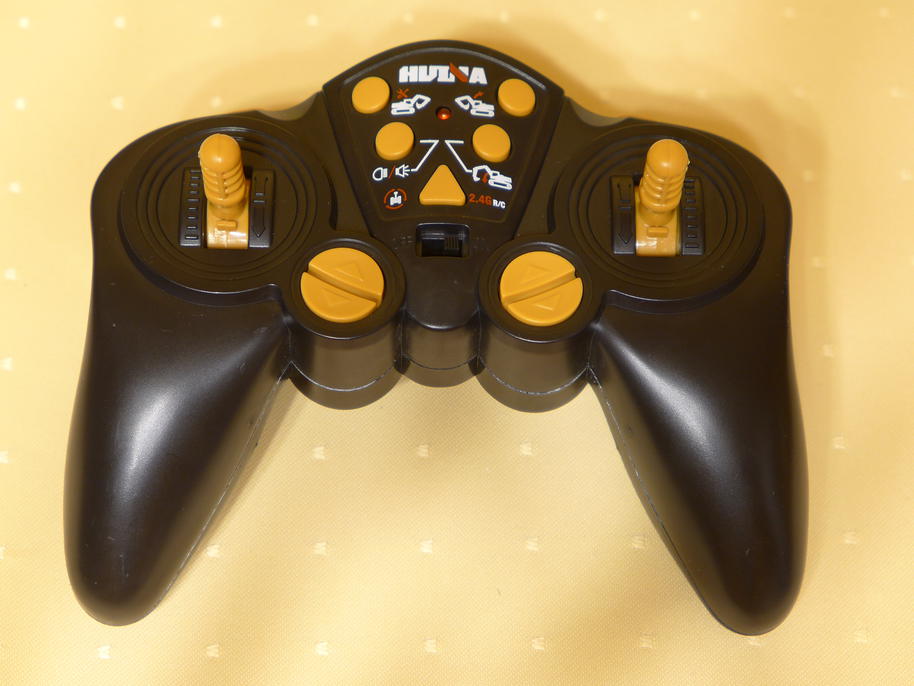 The RC transmitter is a simple plastic "toy" with many buttons. Every couple of buttons controls one servo of the excavator. The transmitter is powered by two AA-cells, which are not included in the package. Interestingly, the authors of the design didn't think too much about simultaneous usage of several functions – especially lifting the boom together with the dipper arm. Assuming both functions are to be operated by the right thumb ... it looks like I'm lacking one more right thumb :) . But again – Huina 1570 is just a toy, not a professional tool.