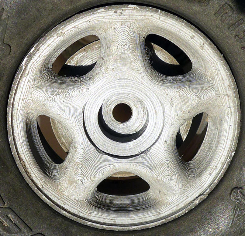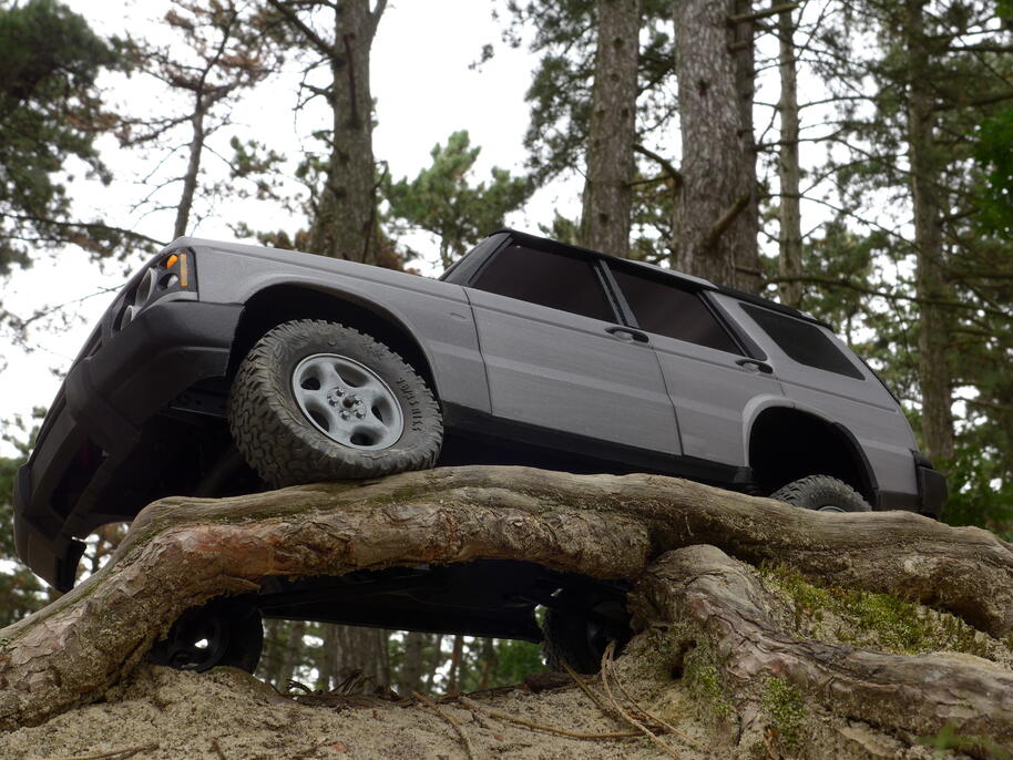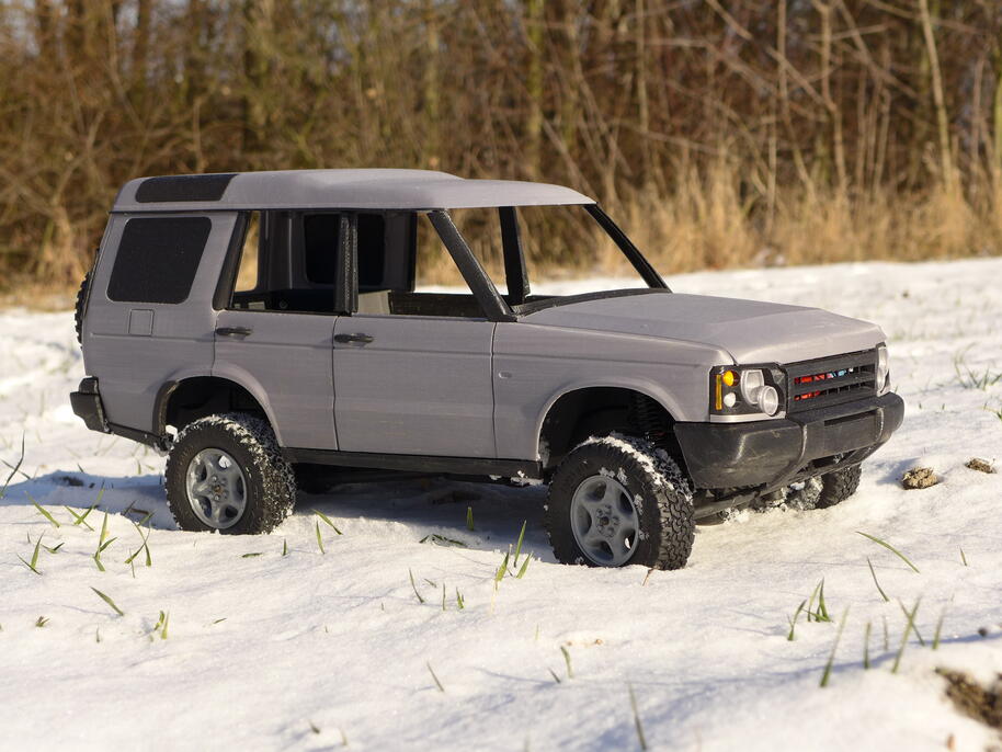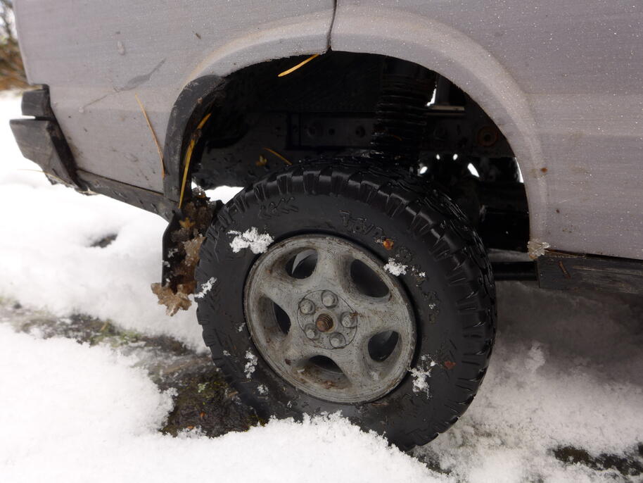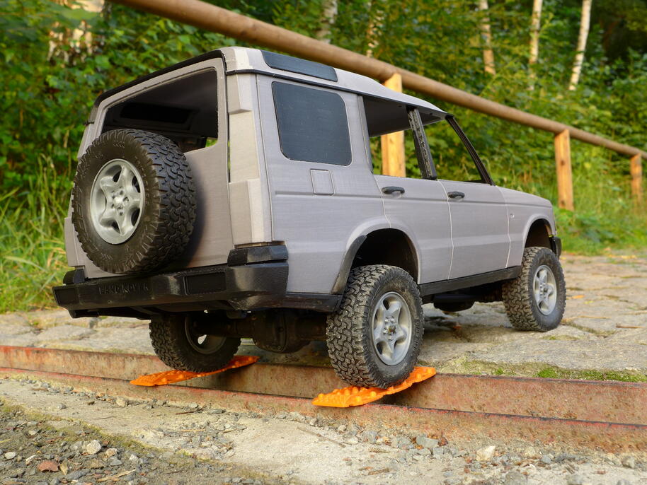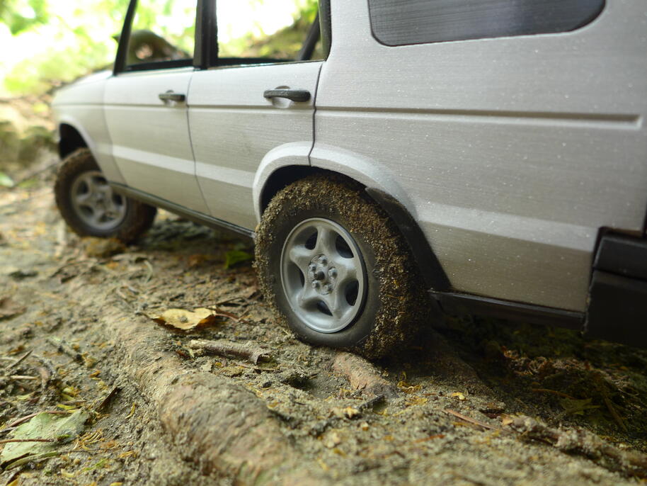 Velkým problémem se ukázaly být pneumatiky správného rozměru (tj. 255/65 R16), o 1cm v průměru užší, než byly na podvozku původně. O realistických diskách nemluvě, ovšem ty jsou řešitelné 3D scanem a 3D tiskem. Na expediční auto jsem chtěl extra měkké gumové pneumatiky (s dostatečnou měkkostí tištěného TPU je trochu problém). Nakonec jsem objevil pneumatiky s vnějším průměrem 76mm od firmy DJX.