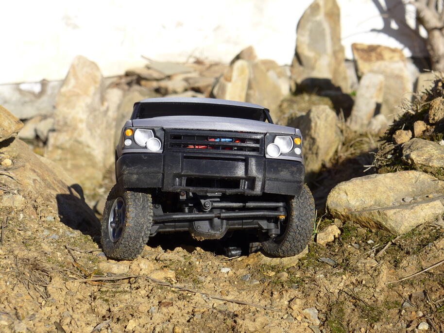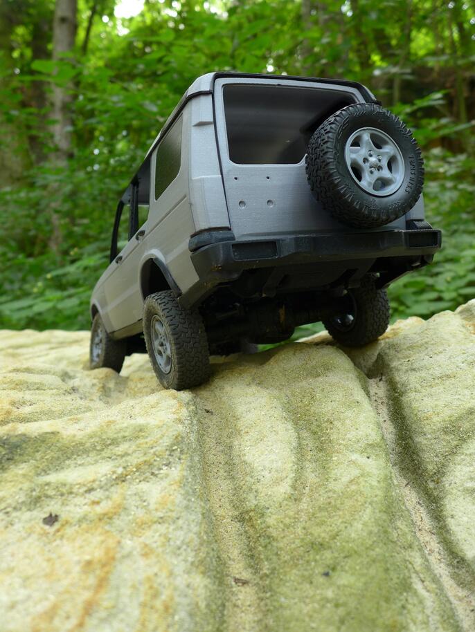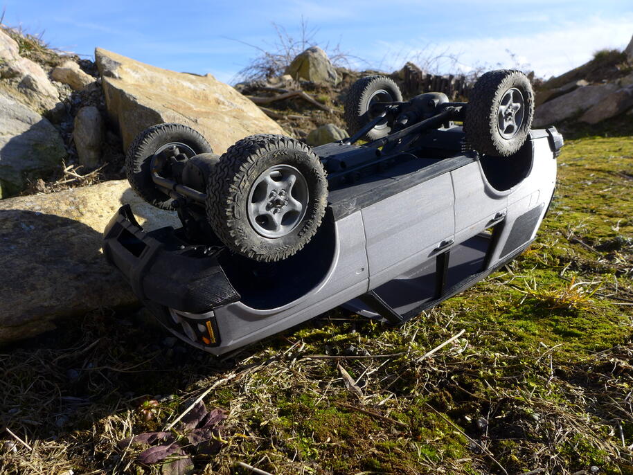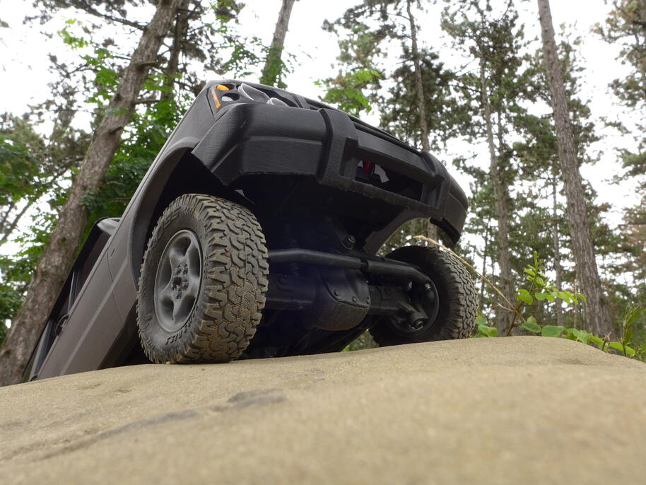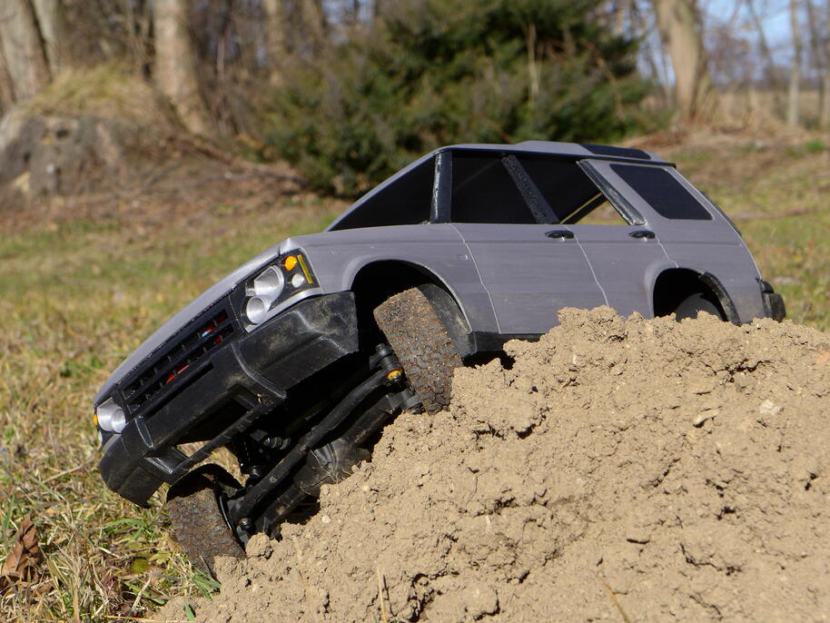 Hlavní omezením schopností vozu tak zůstávají nájezdové úhly, zejména ten zadní – ostatně jako ve skutečnosti. Nejvíce nových šrámů tak obdržel zadní nárazník. Ve skutečnosti bych tu plastovou věc s auta už dávno ulomil. Na modelu je záměrně zadní nárazník navržen odolnější, neboť jej nechci po každém výletu tisknout znova. Další poškrábanou částí modelu jsou kupodivu ráfky disků. Pečlivě jsem pozoroval, jak se kola pohybují v členitém terénu a hlavní příčinou šrámů na diskách byly prostě blízké kameny. Že se pneumatiky s disků nerealisticky ohýbají v podstatě nemělo žádný vliv.