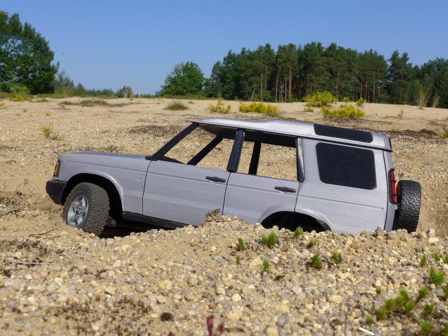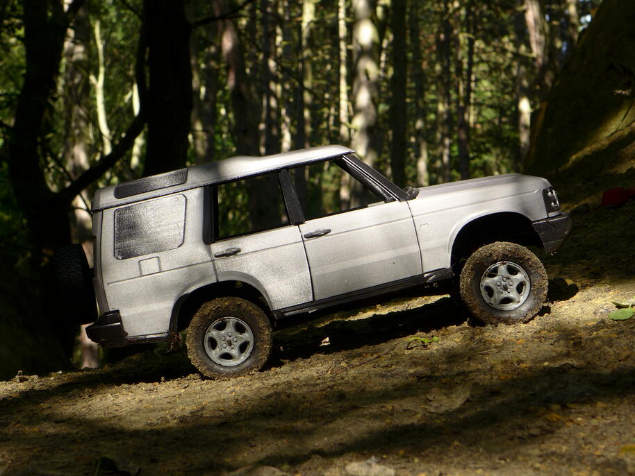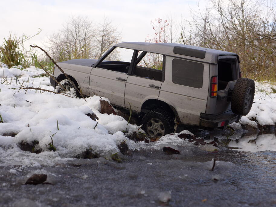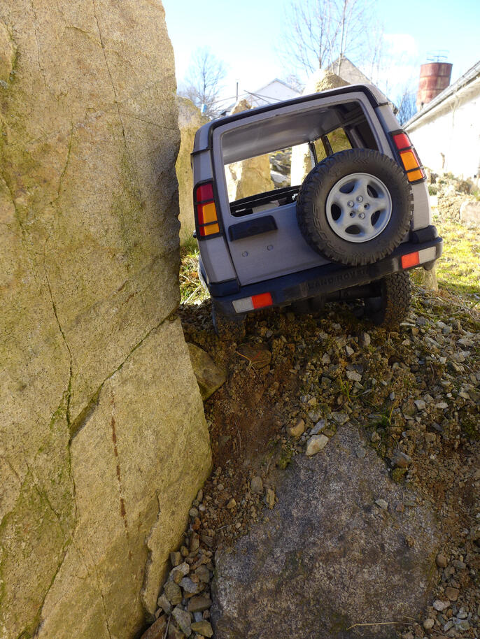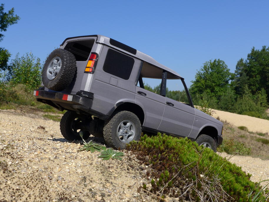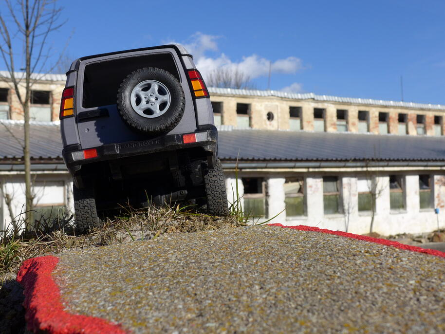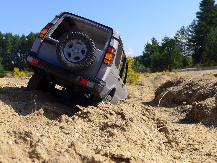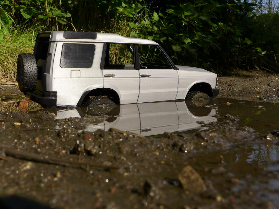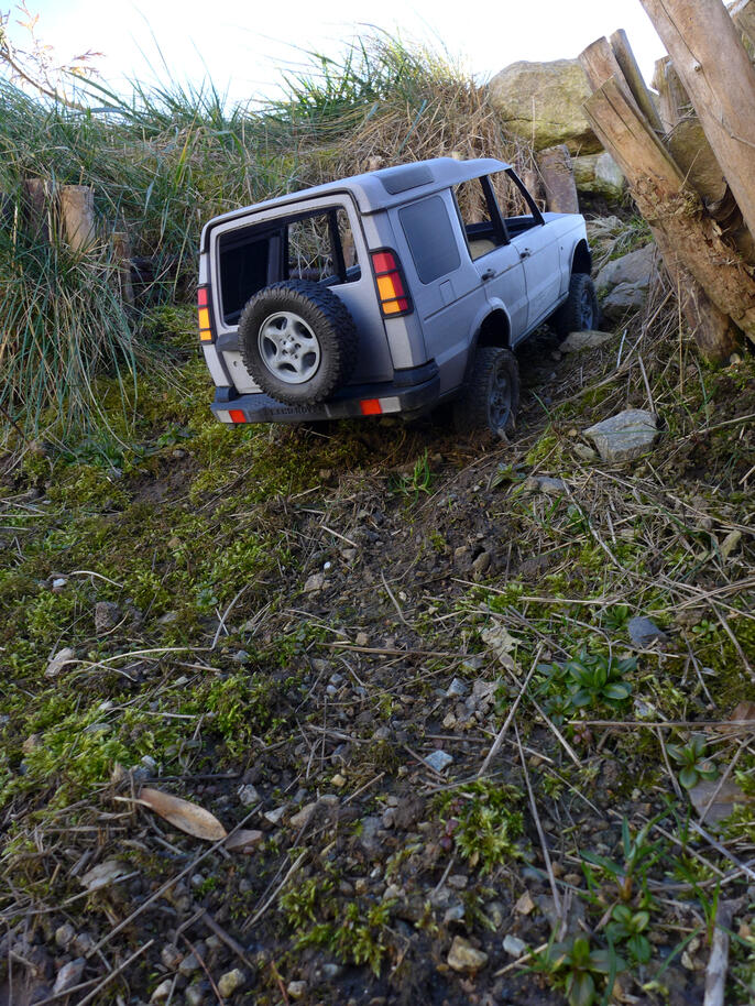 Dnes model v porovnání se skutečným vozem prokázal, že projede výrazně "více". Je to dáno i tím, že podvozek nemá žádné otevřené diferenciály – a taky odvahou řidiče – přeci jen model vyprostím dvěma prsty, zatímco skutečné Disco bude potřebovat minimálně traktor :) . Na těchto fotkách jsem si dal obzvláště záležet, abych fotoaparát držel opravdu vodorovně – a tudíž vynikl stále ještě stabilní boční náklon.