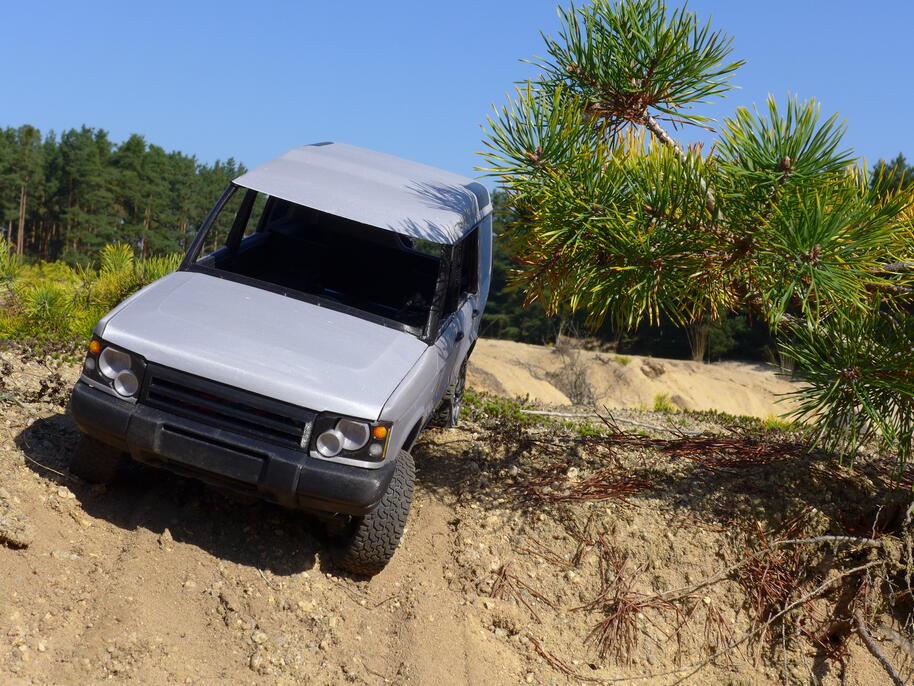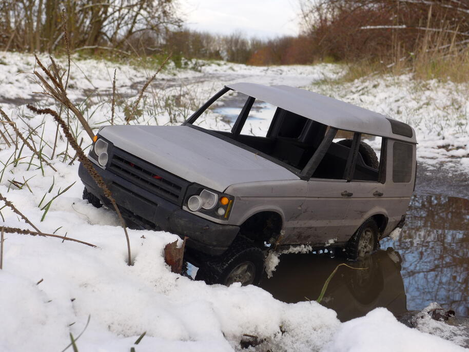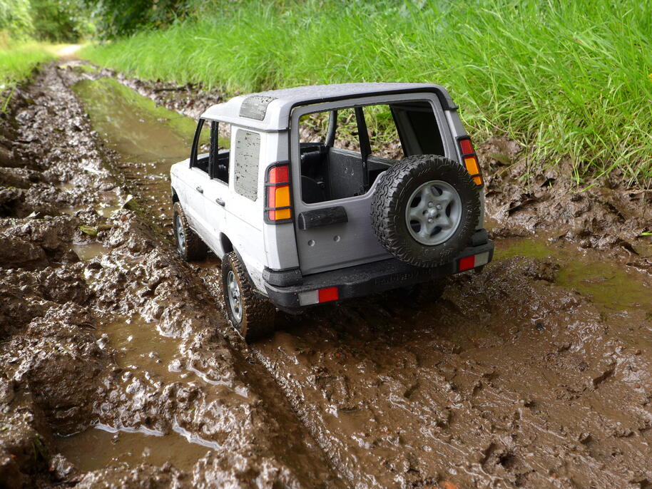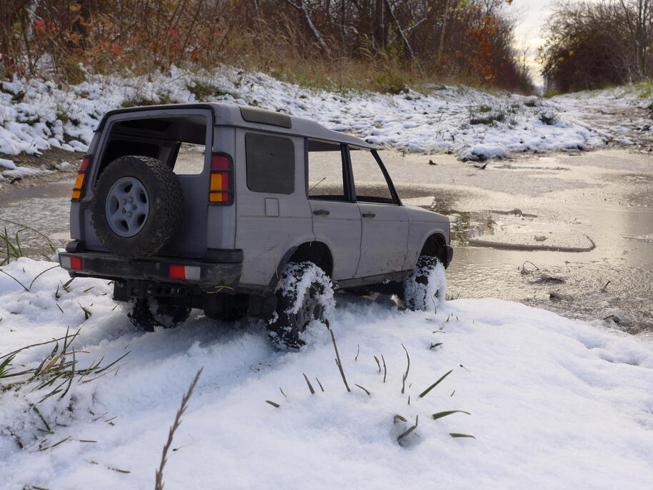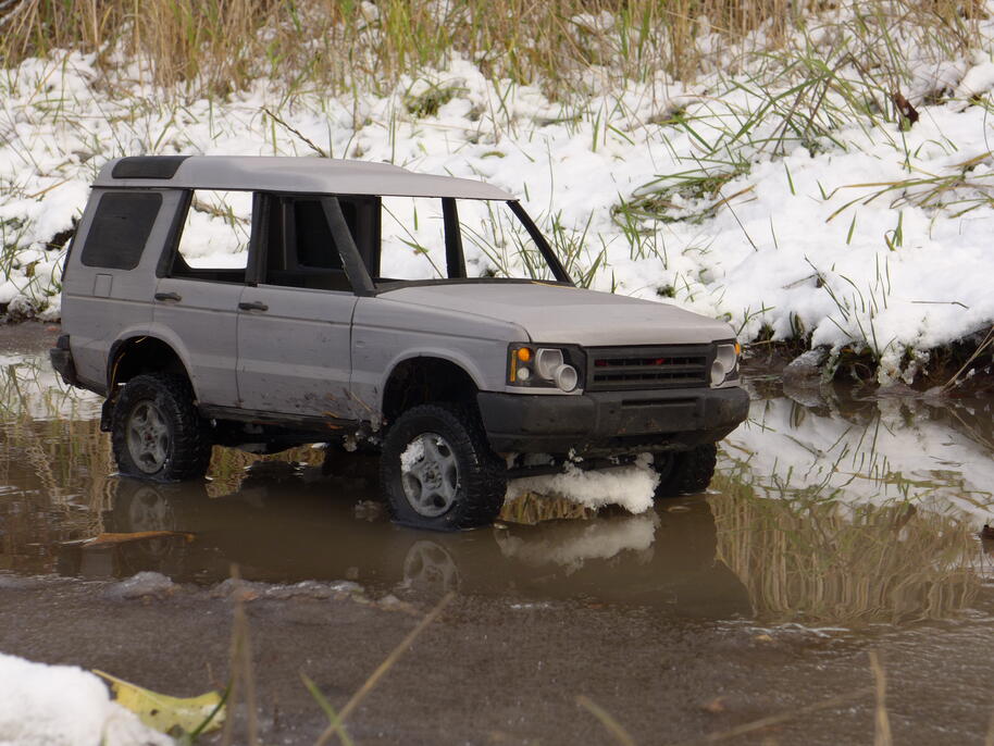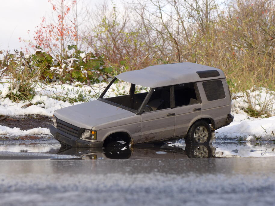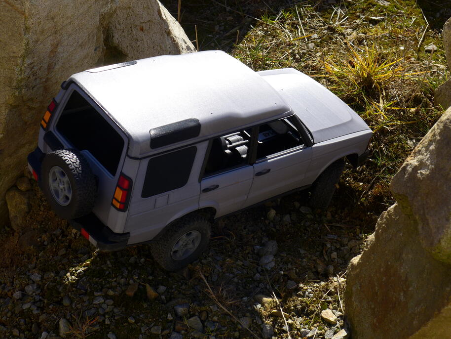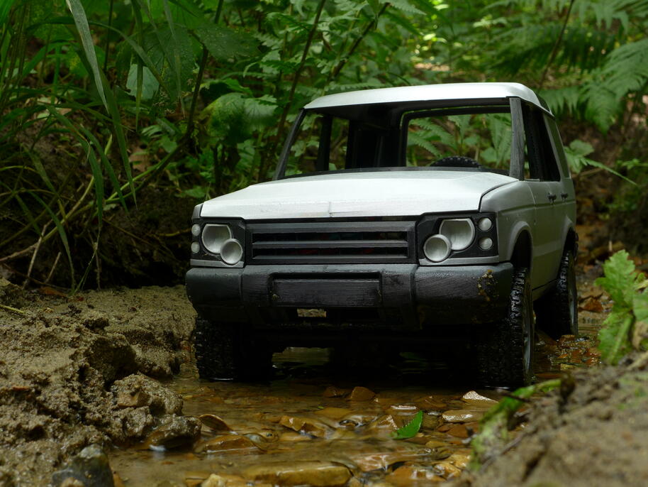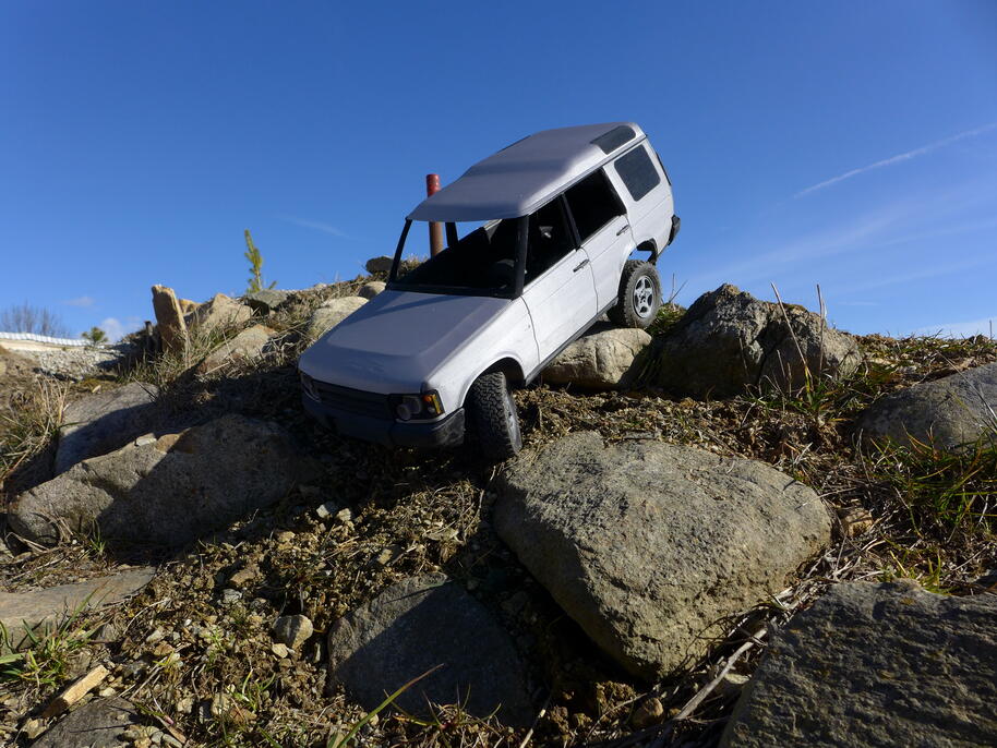 Dnes model v porovnání se skutečným vozem prokázal, že projede výrazně "více". Je to dáno i tím, že podvozek nemá žádné otevřené diferenciály – a taky odvahou řidiče – přeci jen model vyprostím dvěma prsty, zatímco skutečné Disco bude potřebovat minimálně traktor :) . Na těchto fotkách jsem si dal obzvláště záležet, abych fotoaparát držel opravdu vodorovně – a tudíž vynikl stále ještě stabilní boční náklon.