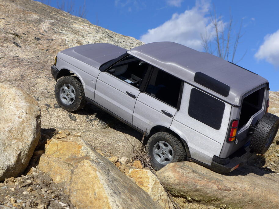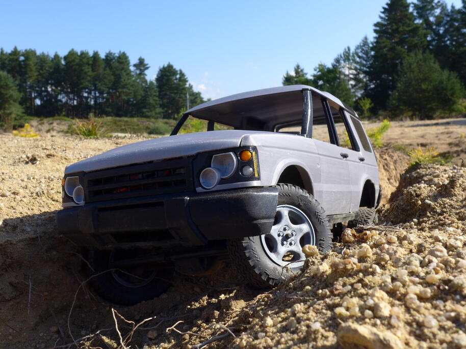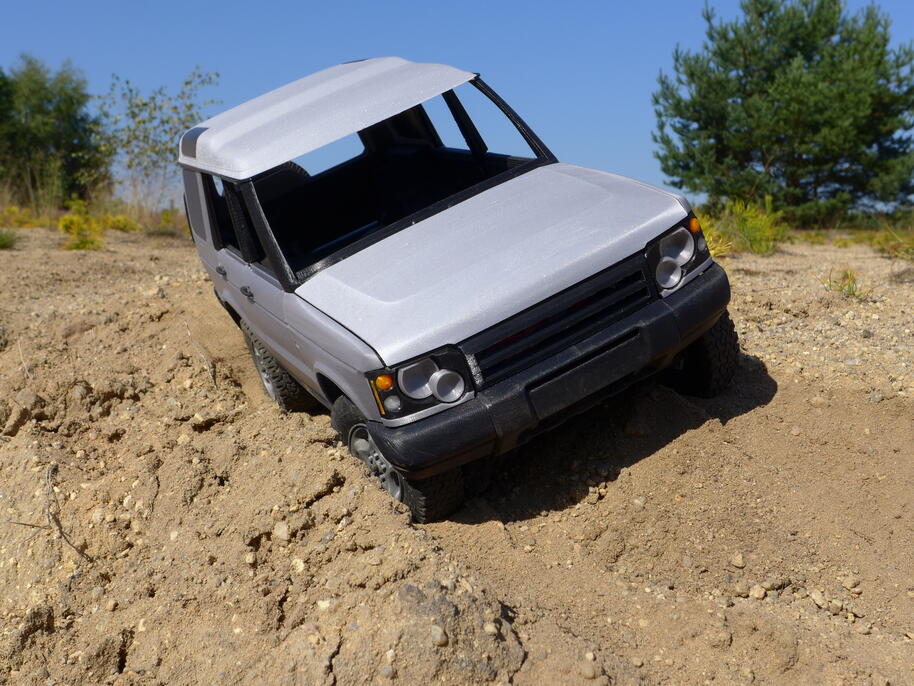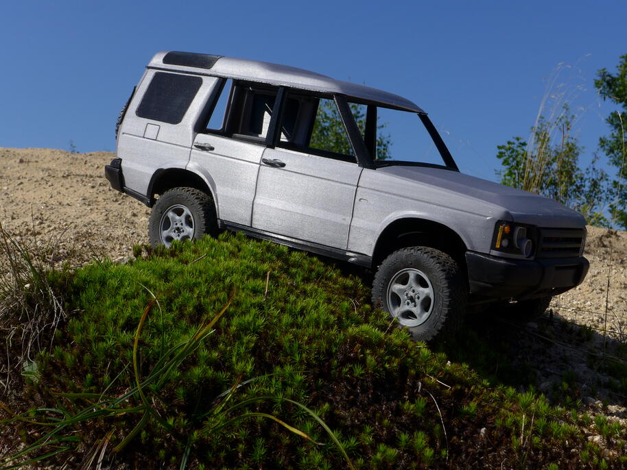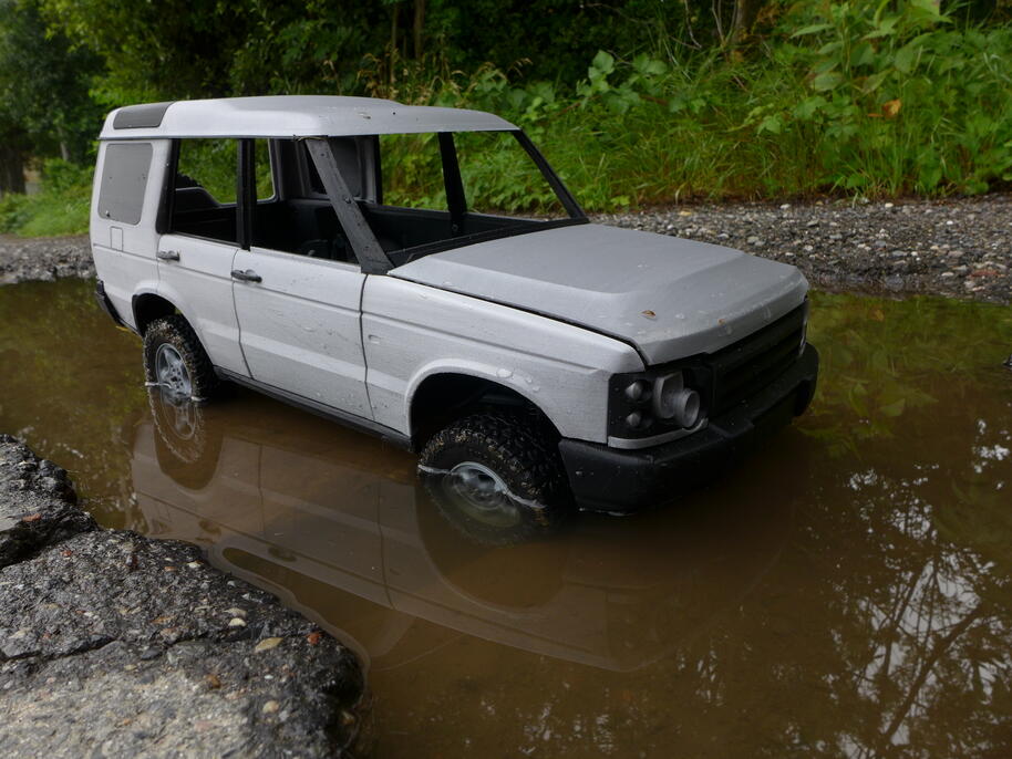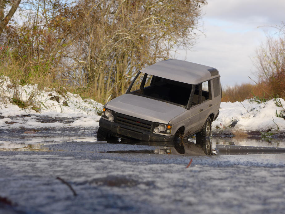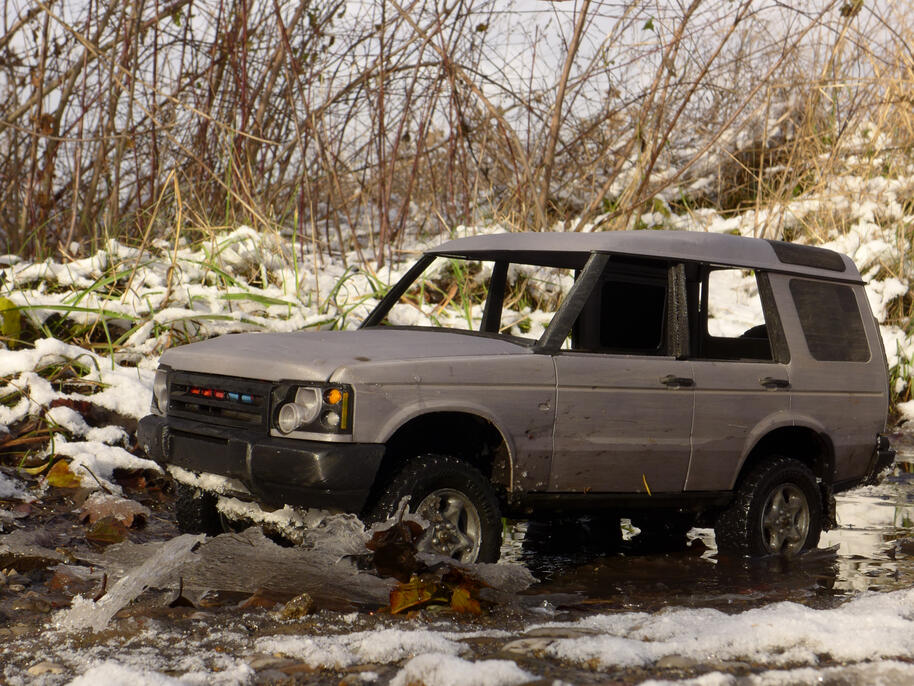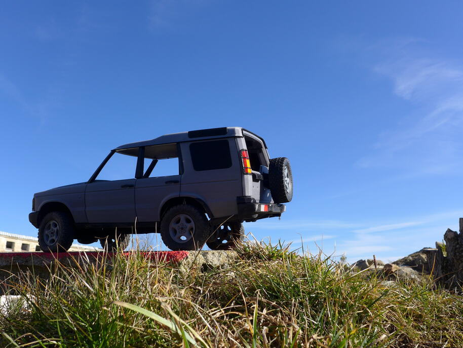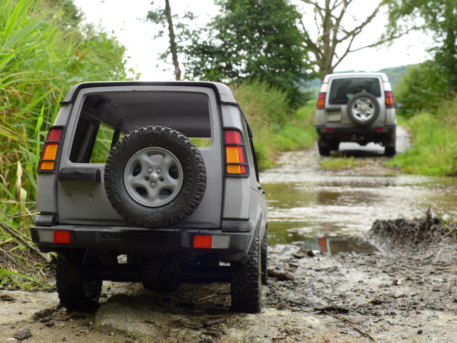 Dnes model v porovnání se skutečným vozem prokázal, že projede výrazně "více". Je to dáno i tím, že podvozek nemá žádné otevřené diferenciály – a taky odvahou řidiče – přeci jen model vyprostím dvěma prsty, zatímco skutečné Disco bude potřebovat minimálně traktor :) . Na těchto fotkách jsem si dal obzvláště záležet, abych fotoaparát držel opravdu vodorovně – a tudíž vynikl stále ještě stabilní boční náklon.