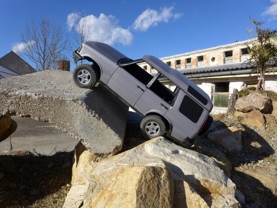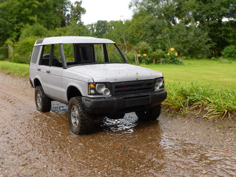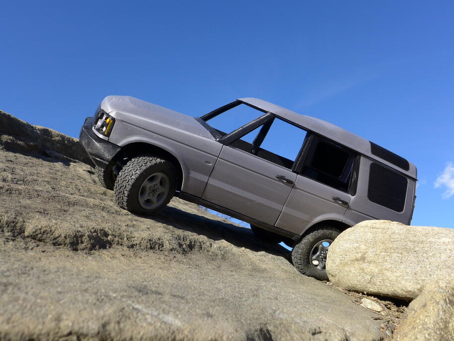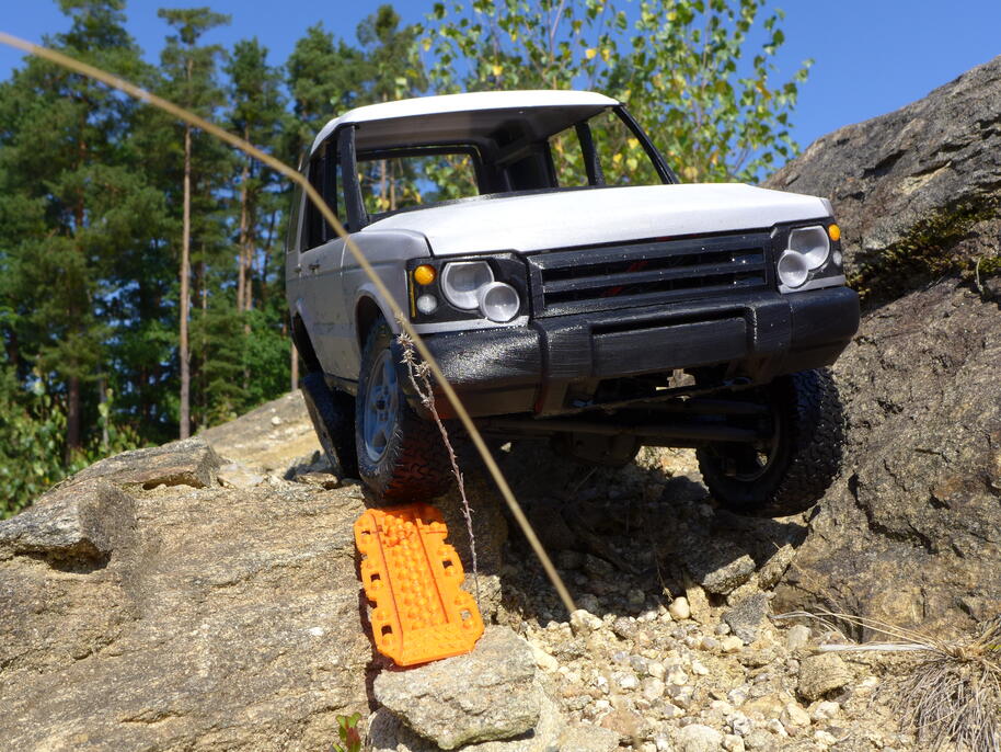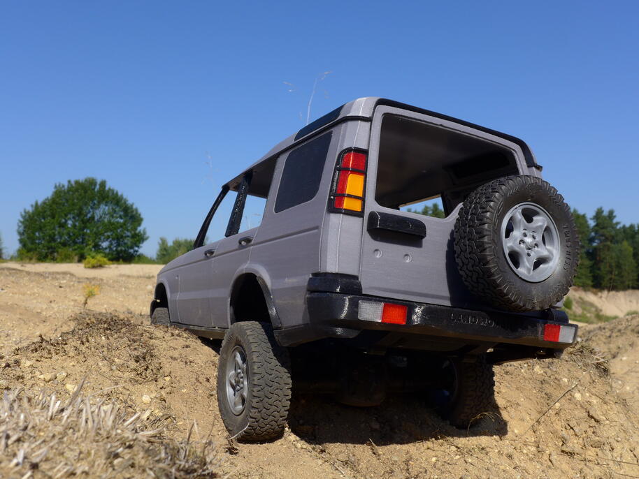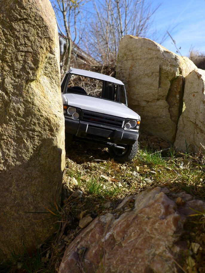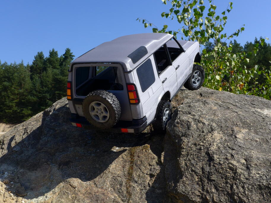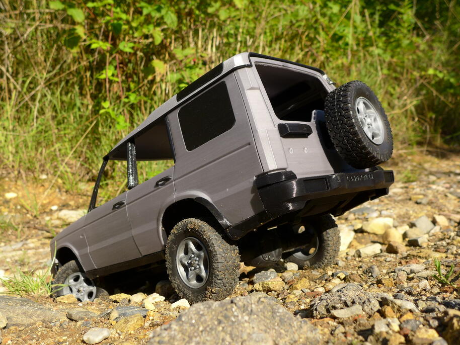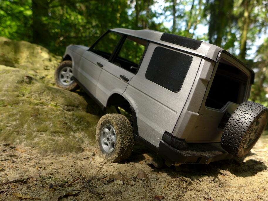 Dnes model v porovnání se skutečným vozem prokázal, že projede výrazně "více". Je to dáno i tím, že podvozek nemá žádné otevřené diferenciály – a taky odvahou řidiče – přeci jen model vyprostím dvěma prsty, zatímco skutečné Disco bude potřebovat minimálně traktor :) . Na těchto fotkách jsem si dal obzvláště záležet, abych fotoaparát držel opravdu vodorovně – a tudíž vynikl stále ještě stabilní boční náklon.
