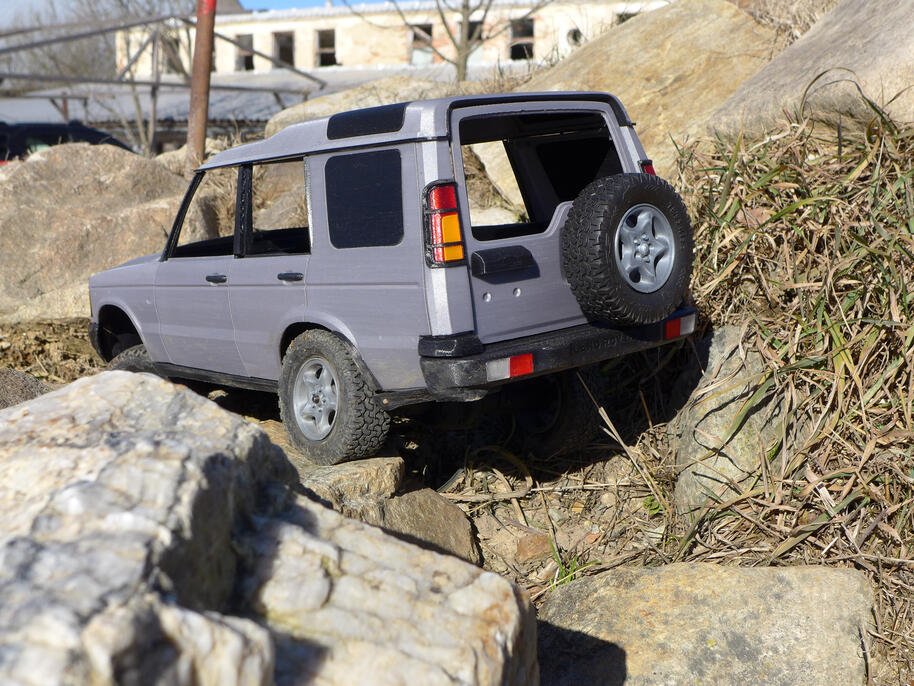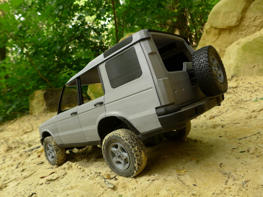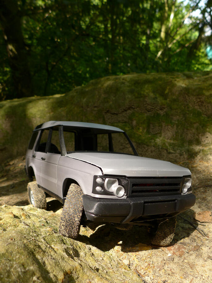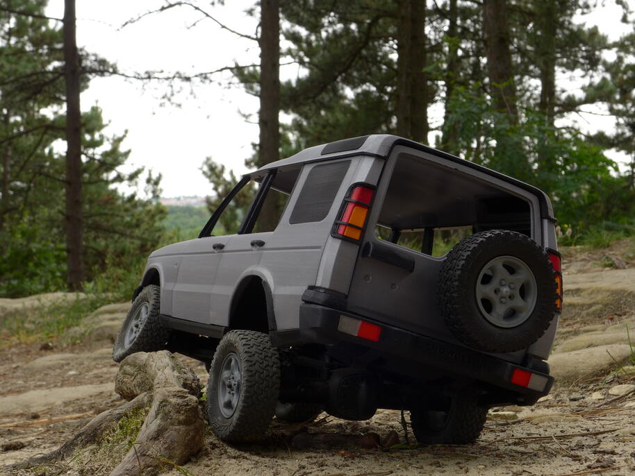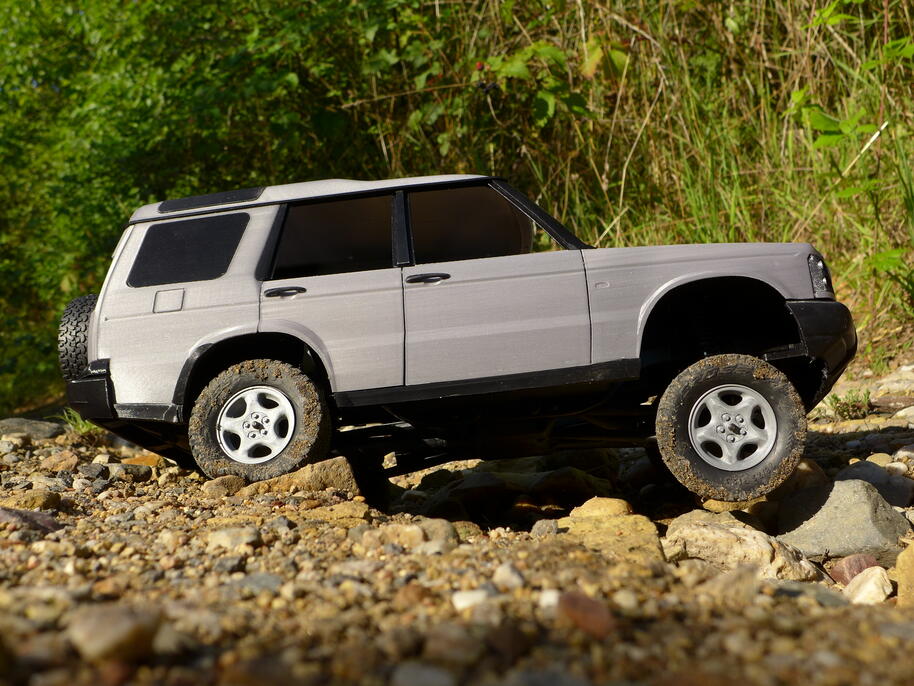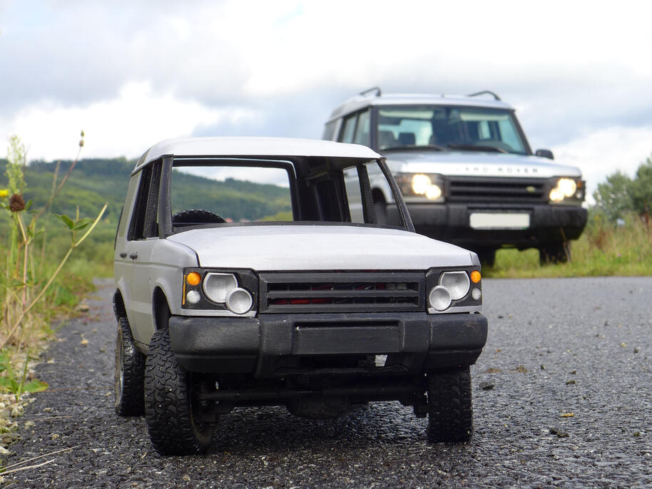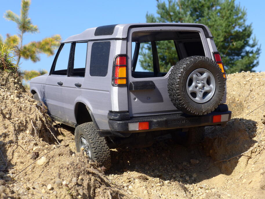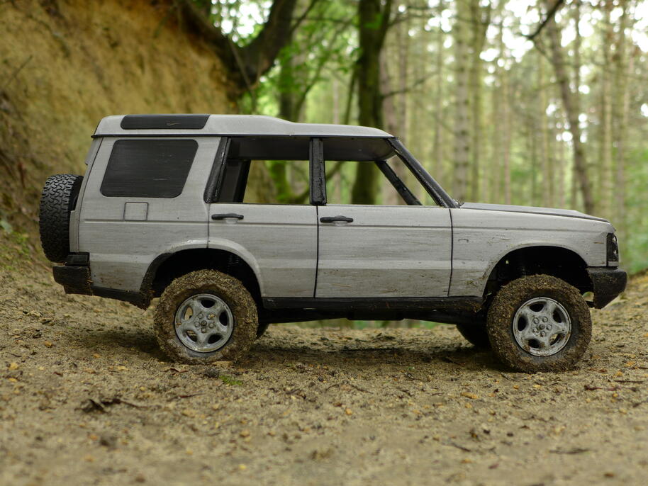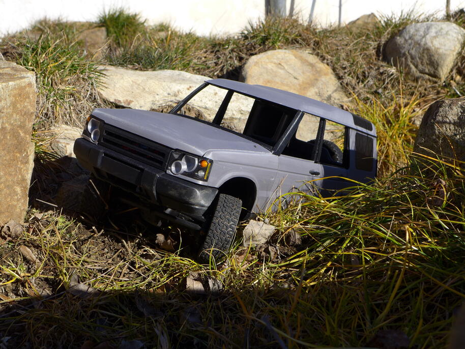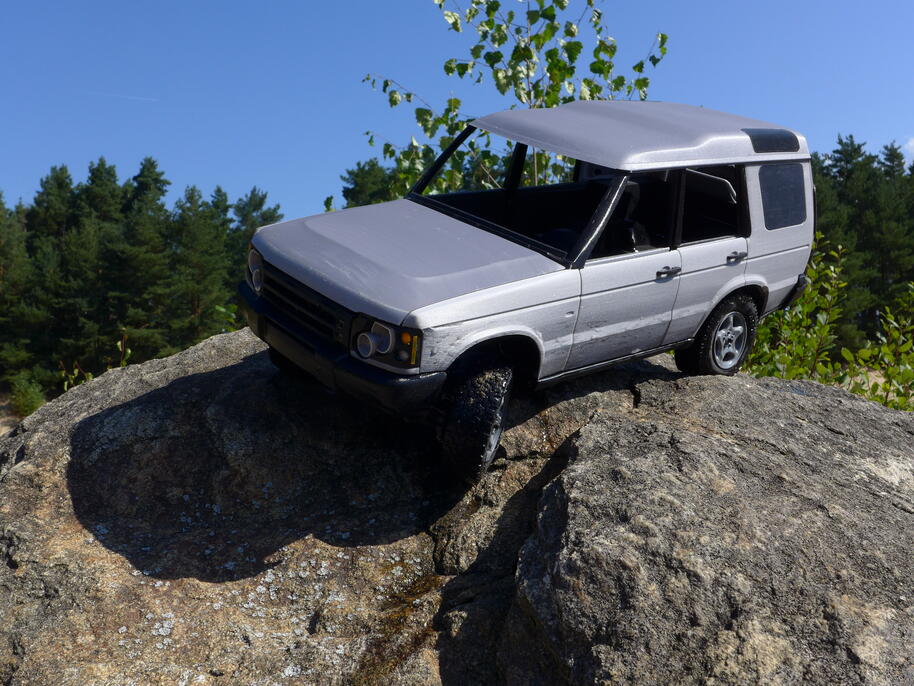 Dnes model v porovnání se skutečným vozem prokázal, že projede výrazně "více". Je to dáno i tím, že podvozek nemá žádné otevřené diferenciály – a taky odvahou řidiče – přeci jen model vyprostím dvěma prsty, zatímco skutečné Disco bude potřebovat minimálně traktor :) . Na těchto fotkách jsem si dal obzvláště záležet, abych fotoaparát držel opravdu vodorovně – a tudíž vynikl stále ještě stabilní boční náklon.