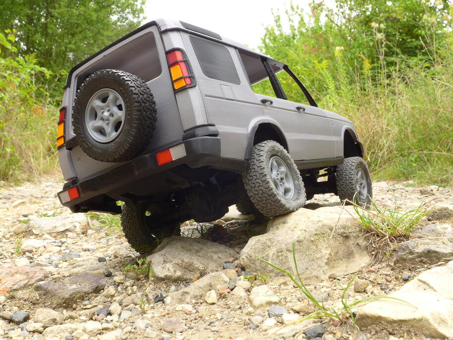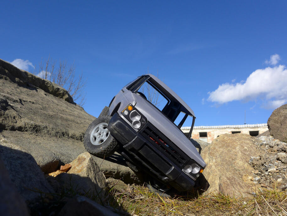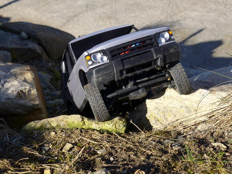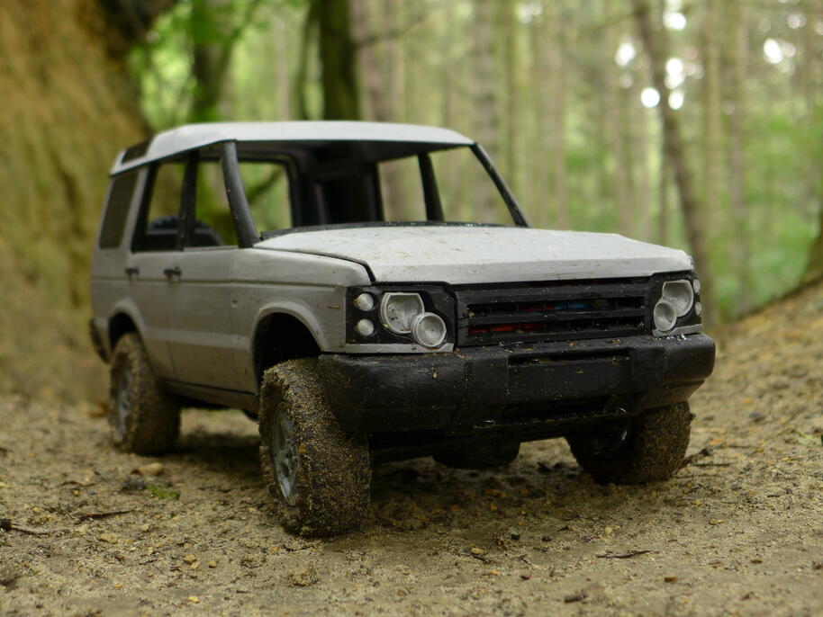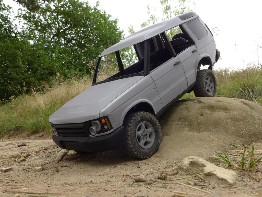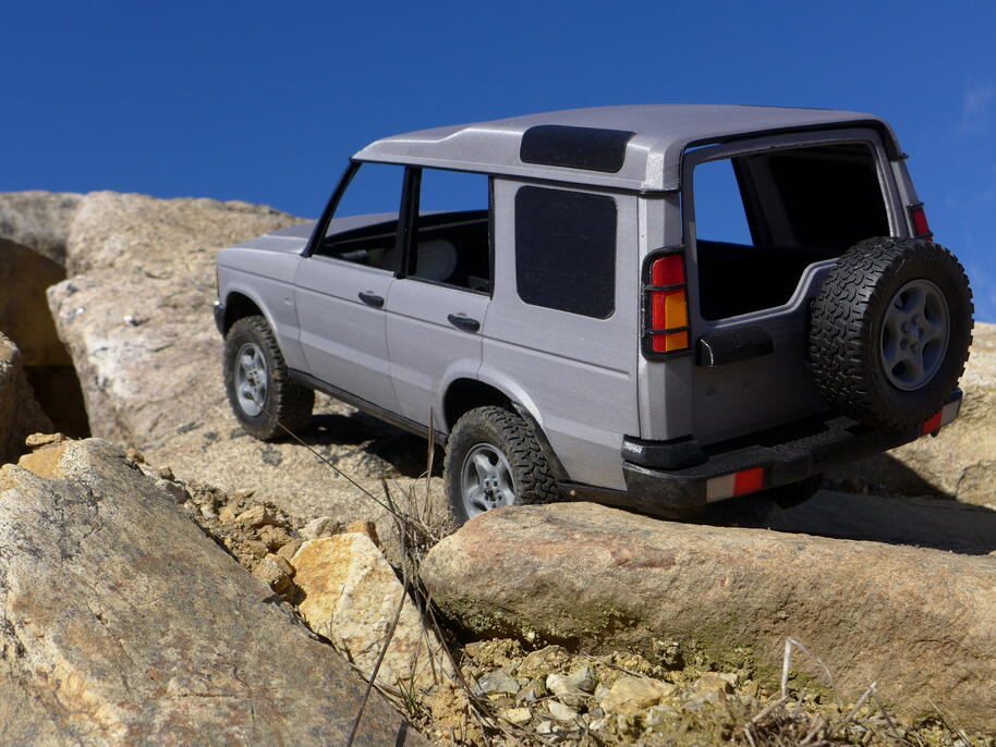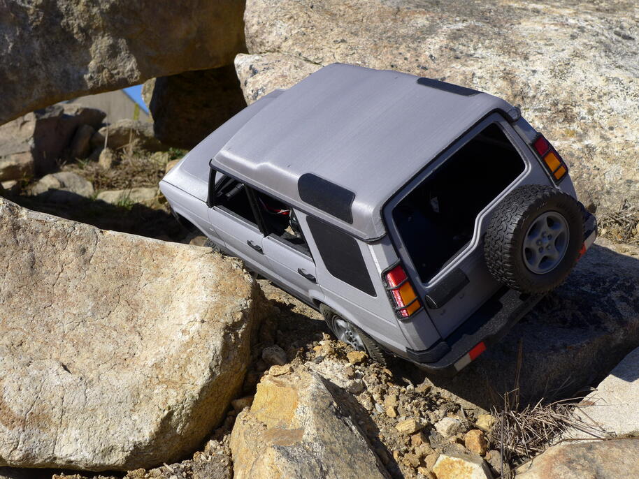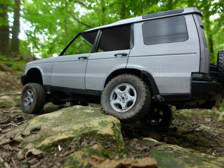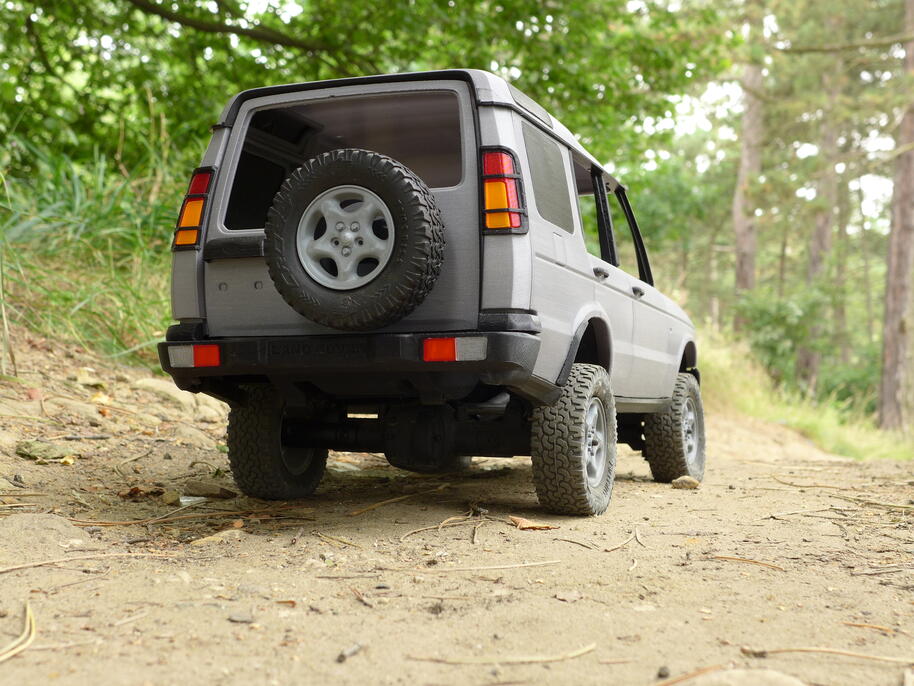 Dnes model v porovnání se skutečným vozem prokázal, že projede výrazně "více". Je to dáno i tím, že podvozek nemá žádné otevřené diferenciály – a taky odvahou řidiče – přeci jen model vyprostím dvěma prsty, zatímco skutečné Disco bude potřebovat minimálně traktor :) . Na těchto fotkách jsem si dal obzvláště záležet, abych fotoaparát držel opravdu vodorovně – a tudíž vynikl stále ještě stabilní boční náklon.