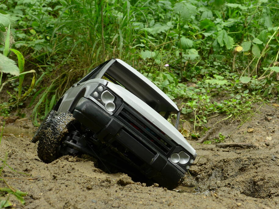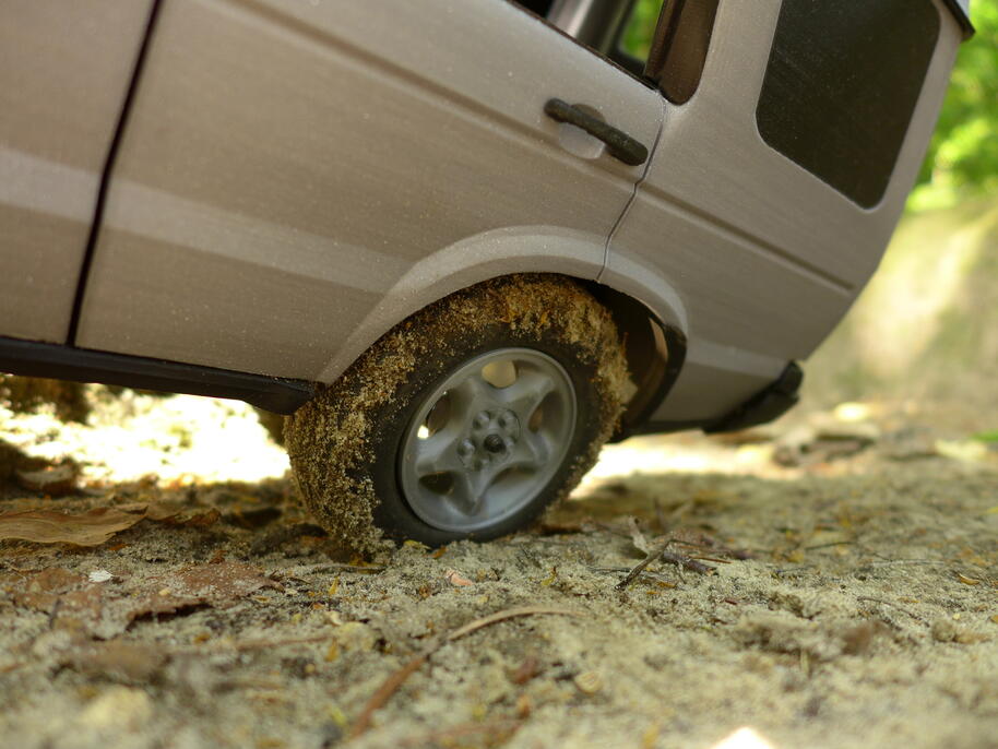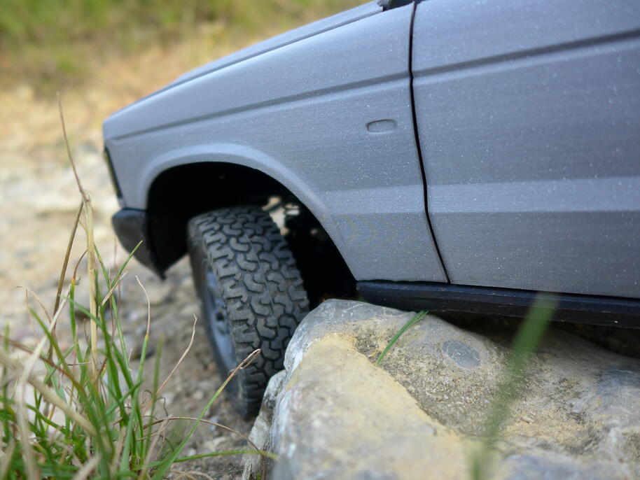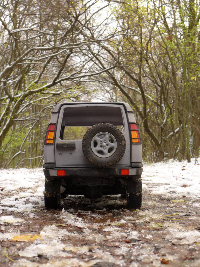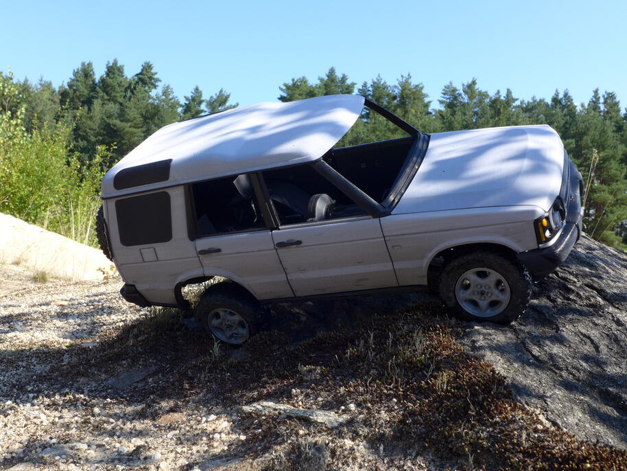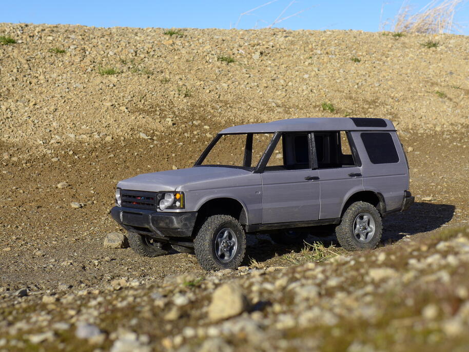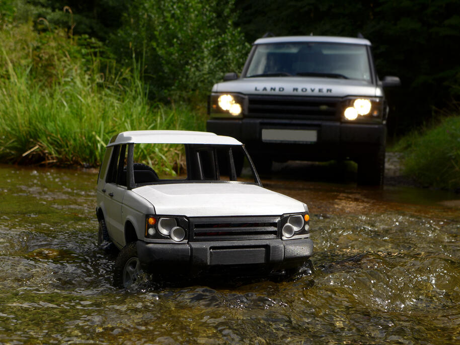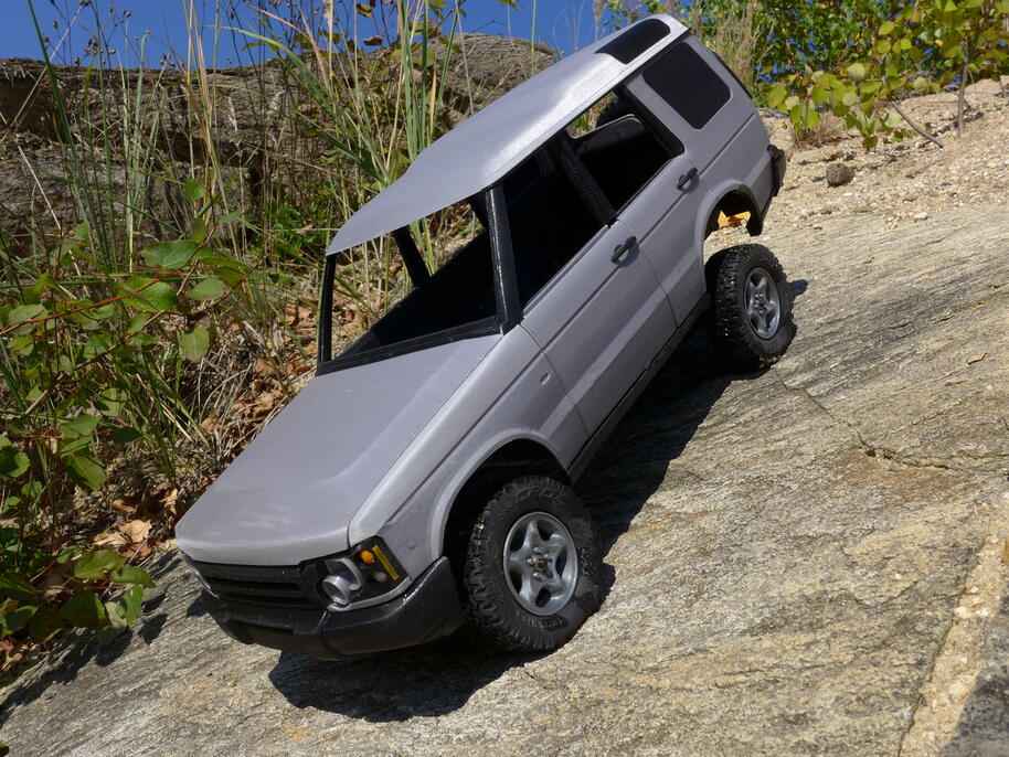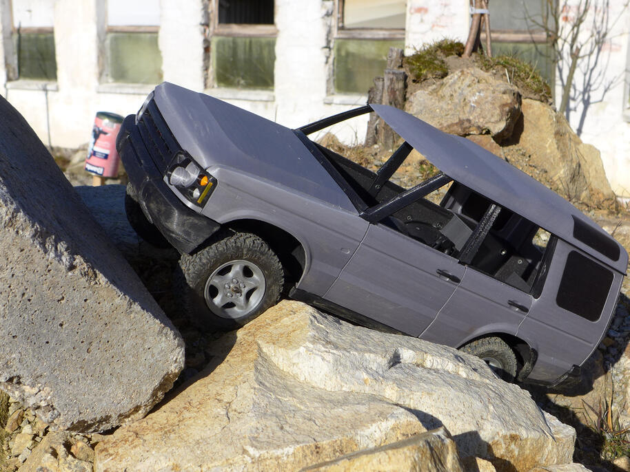 Dnes model v porovnání se skutečným vozem prokázal, že projede výrazně "více". Je to dáno i tím, že podvozek nemá žádné otevřené diferenciály – a taky odvahou řidiče – přeci jen model vyprostím dvěma prsty, zatímco skutečné Disco bude potřebovat minimálně traktor :) . Na těchto fotkách jsem si dal obzvláště záležet, abych fotoaparát držel opravdu vodorovně – a tudíž vynikl stále ještě stabilní boční náklon.