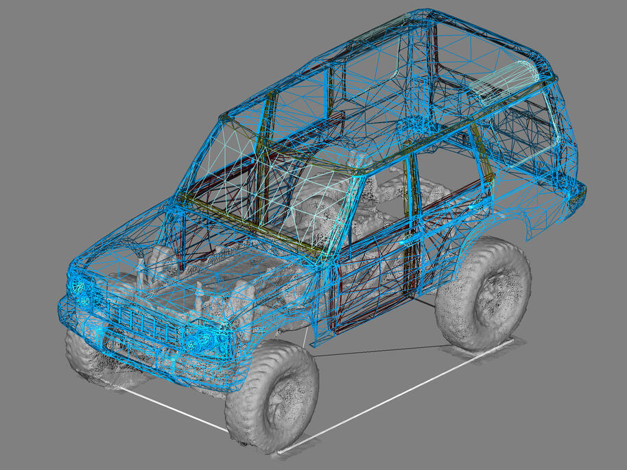 A jak získat tvary podvozku pro modelování karoserie? Jak jinak než 3D scanem – byla to docela zábava a výsledek mě nadmíru překvapil. Jako základ pro modelování dokonalé, člověk má hned přehled, co kam může a nemůže dát. Přesnost řádově ±1mm, to na hrubé modelování stačí. Detaily lze doměřit šuplerou, pokud je třeba ... upřímně, naměřil jsem na podvozku jen jediný rozměr, abych se ujistil, že mám 3D rekonstrukci správně. Mimochodem se ukázalo, že nový nejetý podvozek je mírně do vrtule – holt není to Tatra, je to za jen a pouze žebřiňák, který se kroutit z principu musí.