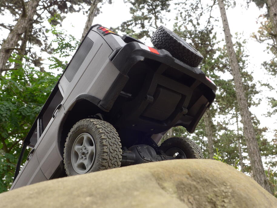 Dále – při expedicích pak bude potřeba dávat pozor na kameny – je lepší je přejet jedním kolem, než se snažit je "schovat" mezi koly, protože velmi pravděpodobně dojde k nárazu do diferenciálu. Naštěstí plast obou diferenciálů je masivní a výrobce podvozku zřejmě s něčím takovým počítá. Ve skutečnosti by podobný náraz znamenal závažné poškození celé tuhé nápravy, obzvláště ve vyšších rychlostech. Obezřetnost a správná volba stopy je pak na místě při překovávání kořenů stromů ze stejného důvodu – ideálně najíždět skoro kolmo na kořen a spoléhat na přechodový úhel modelu. Ta pravá výzva však nastane v okamžiku, kdy namontuji modelové tažné zařízení. Sice bude z polykarbonátu, ale bude výrazně omezovat zadní nájezdový úhel. Překvapivě boční prahy se zatím prakticky nedotkly terénu, přestože jsem očekával opak. Stejně tak přední nájezdový úhel omezený předním nárazníkem už dokážu vcelku pěkně odhadnout.