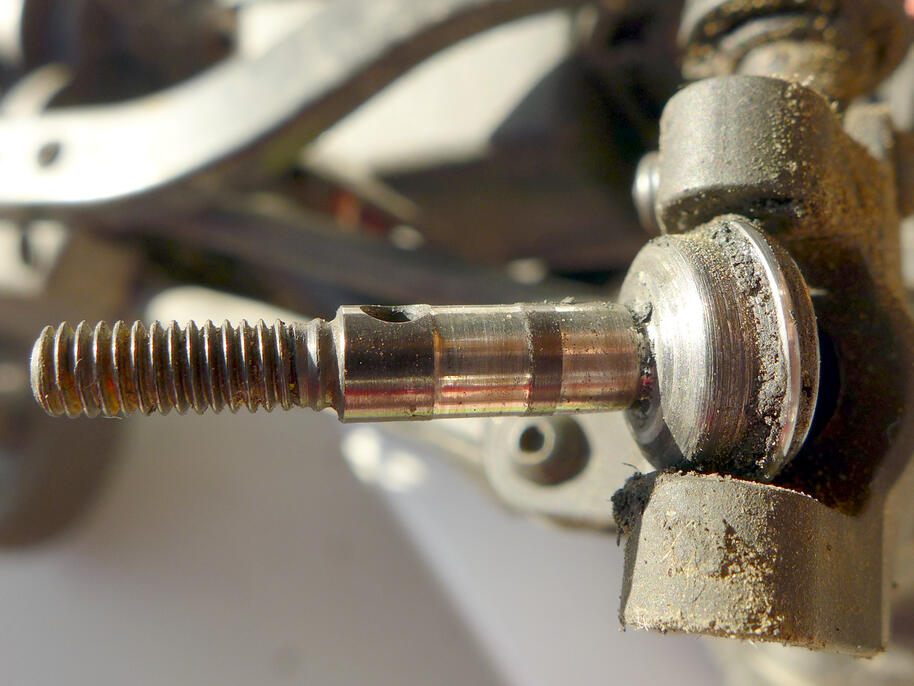 Jednoznačně největším konstrukčním nedostatkem podvozku je absence ložisek v nosných třmenech předních kol. Základní varianta podvozku MST CMX obsahuje pouze železná (umí to rezatět, tak asi železná) pouzdra, která se postupně jízdou vyklepou, takže přední kola začnou šmatlat. A je úplně jedno, zda pouzdra mažete (čímž se dovnitř dostane prach a spolu s mazivem vytvoří brusnou pastu, která pouzdro začne soustružit) nebo nemažete (čímž se náprava a pouzdro vzájemně třou na sucho, což má pro změnu úplně stejné důsledky). Už jako nový měl podvozek zemědělské vůle takové, že by přes STK prošel pouze s přiloženou tučnou obálkou. Přestože se asi dají koupit ložiska do předních třmenů kol, přemýšlím o 3D tištěné variantě z nějakého plněného polyamidu – prostě něco, co budu moci jednou za čas vyměnit. Bohužel, s ohledem na stav kloubu a osy ale možná bude potřeba výměna.