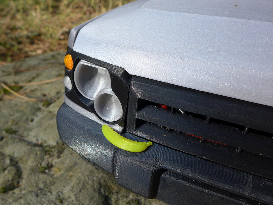 Couvačky a mlhovky v nárazníku už byly v pohodě, tištěné na plocho a tvar infillu simuluje vnitřní kresbu obou barevných sklíček.