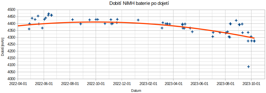 Dosud jsem provedl 66 jízd s NiMH baterií. Po každé jízdě jsem baterii vybil na 5.4 V (zpočátku proudem 0.5 A, posledních pár měsíců snižuji vybíjecí proud až na 0.1 A). Poté jsem baterii nabil proudem 2 A a zaznamenal novou kapacitu, kterou nahlásila nabíječka. Z hlediska skladování určitě není dobře, že baterie občas zůstala dlouho nabitá. Nejsem si jist, zda toto je příčinou rostoucího vnitřního odporu.