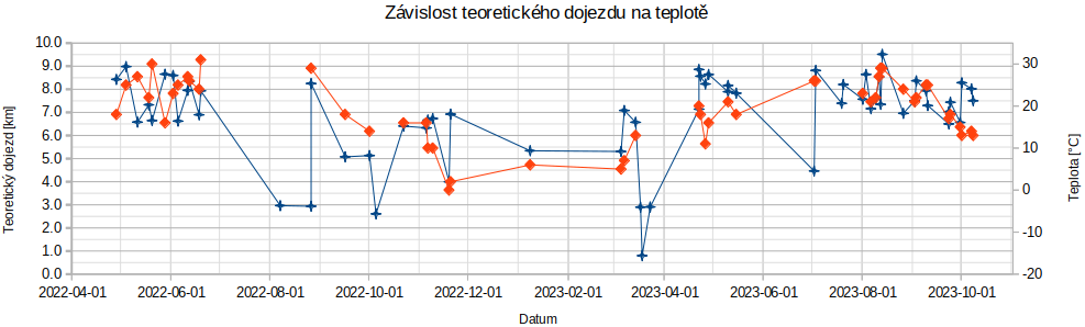 Přikládám 2 grafy – vývoj úrovně dobití baterie a závislost teoretického dojezdu na teplotě.