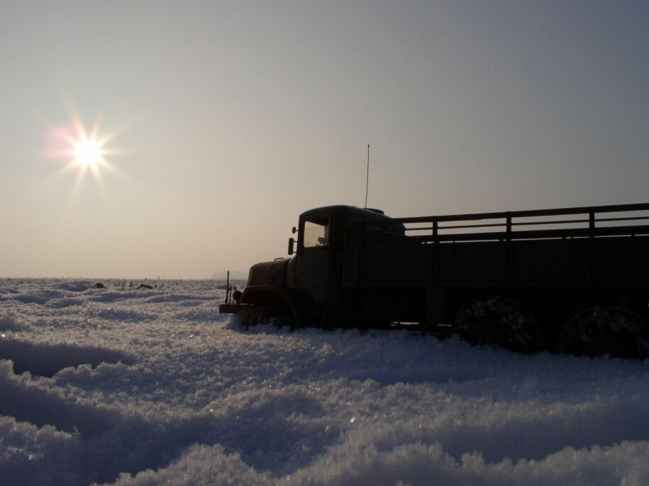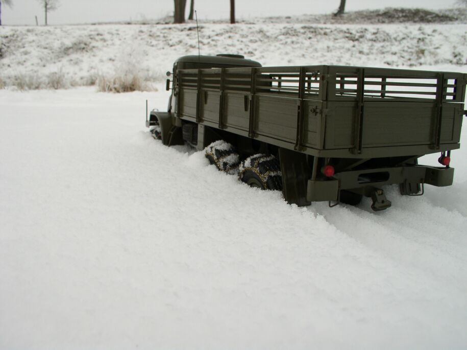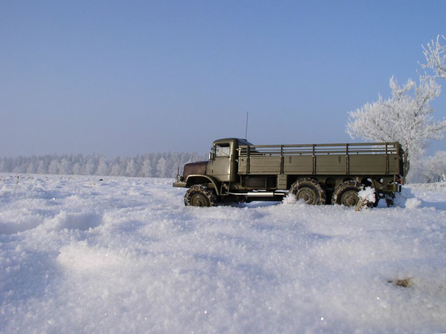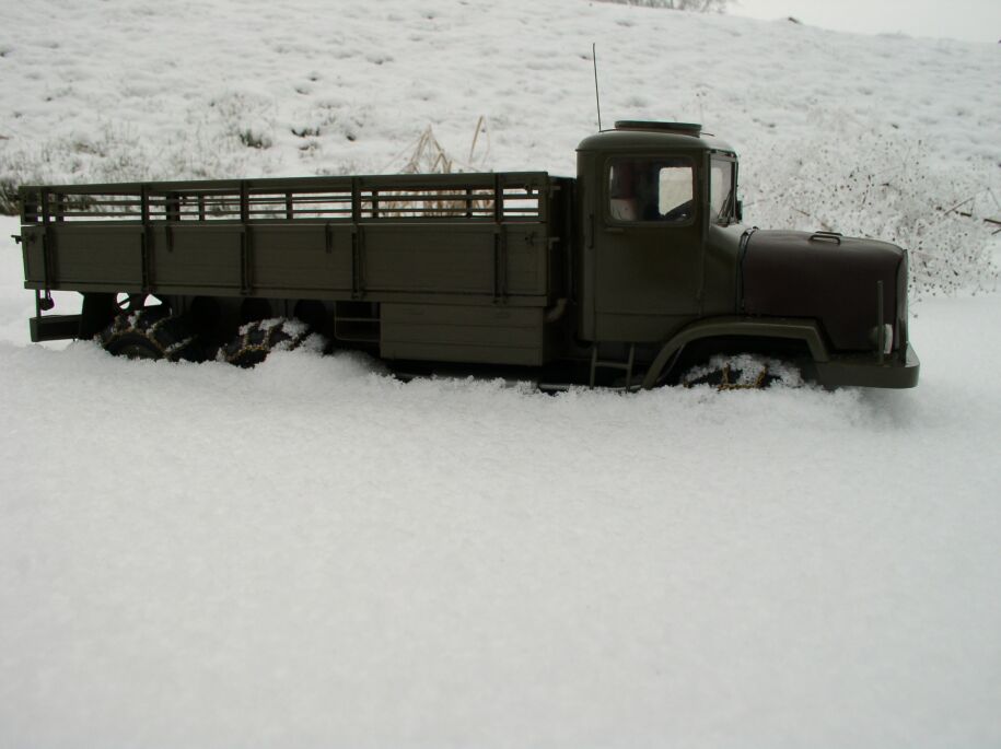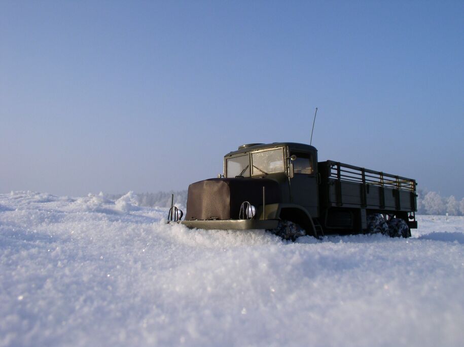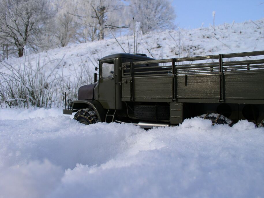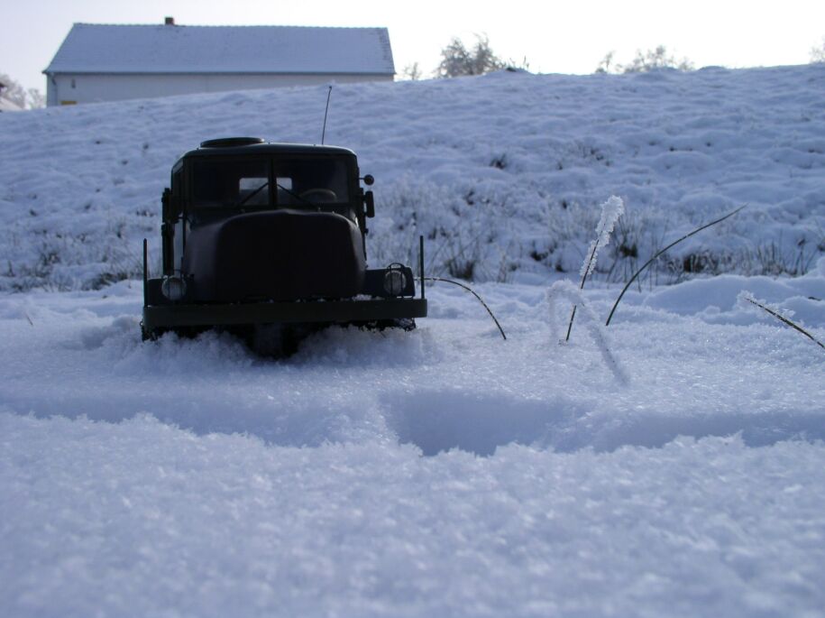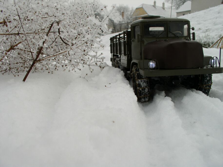 Odpoledni bitva s hlubokym snehem. Misty dosahovala snehova pokryvka az po predni naraznik, coz je z pohledu Tatry necely metr snehu (a pak ze u nas v zime byva malo snehu :) ). Tatra se do nej statecne zakusovala. Velmi se osvedcila jednoducha montaz pneumatik na zadnich kolech – predni kola rozrazeji a uslapavaji cestu pro zadni kola, ktera snaze zenou auto vpred. Toto konstrukcni reseni je primarne urceno prave pro tyto situace – hluboky snih, bahno, pisek atd. Misty vsak bylo snehu tolik, ze ani vysoka svetla vyska nepomohla a Tatra nekolikrat uvizla na roure. Pak prisly ke slovu lopaty a navijak ;) .