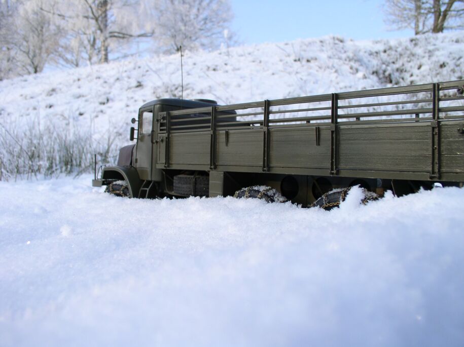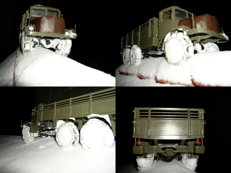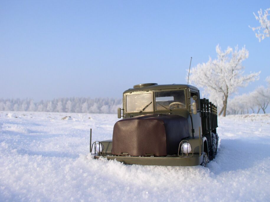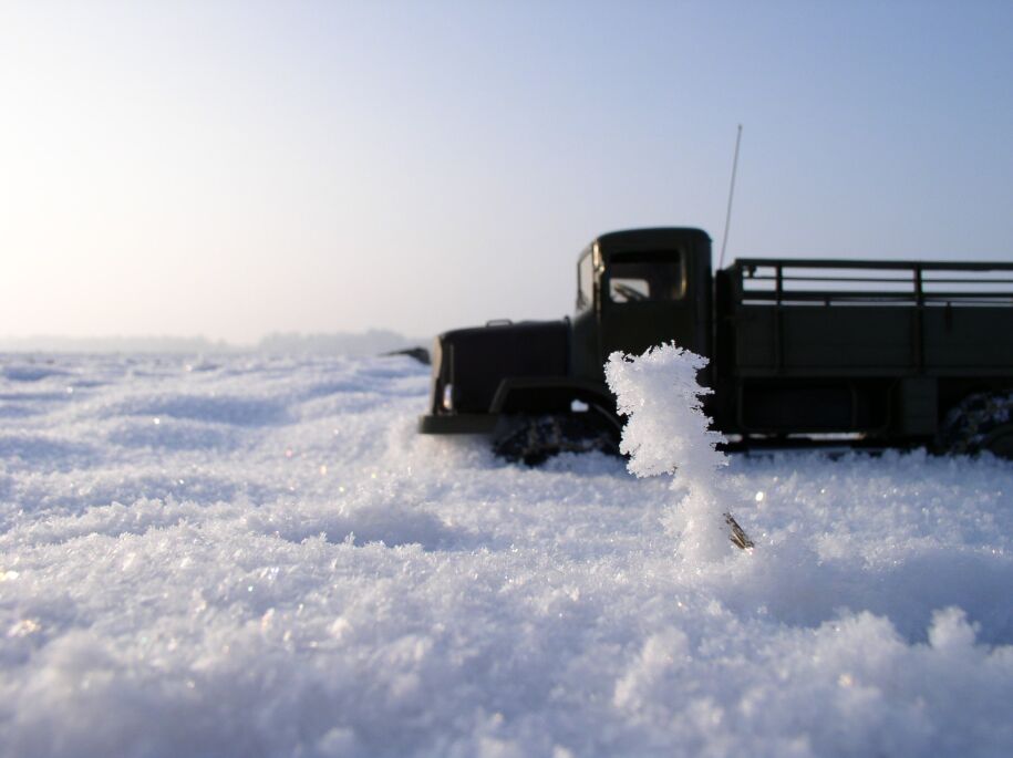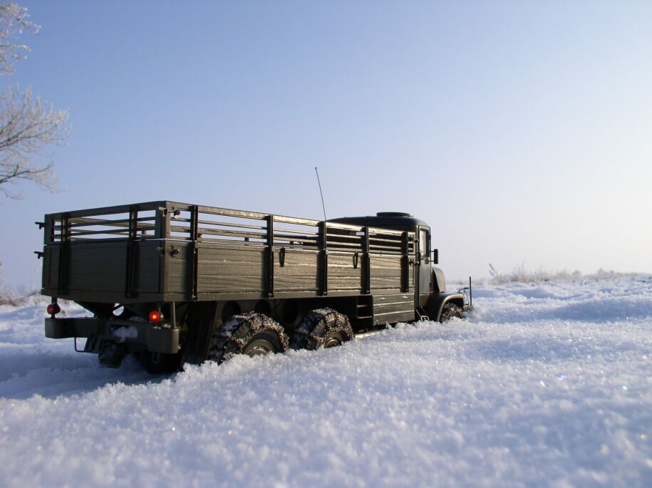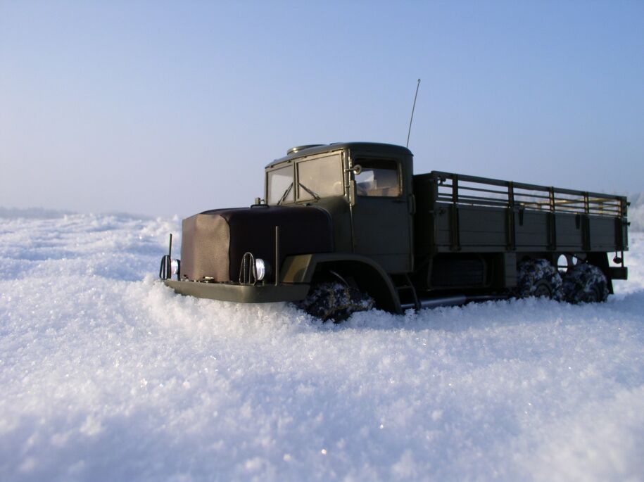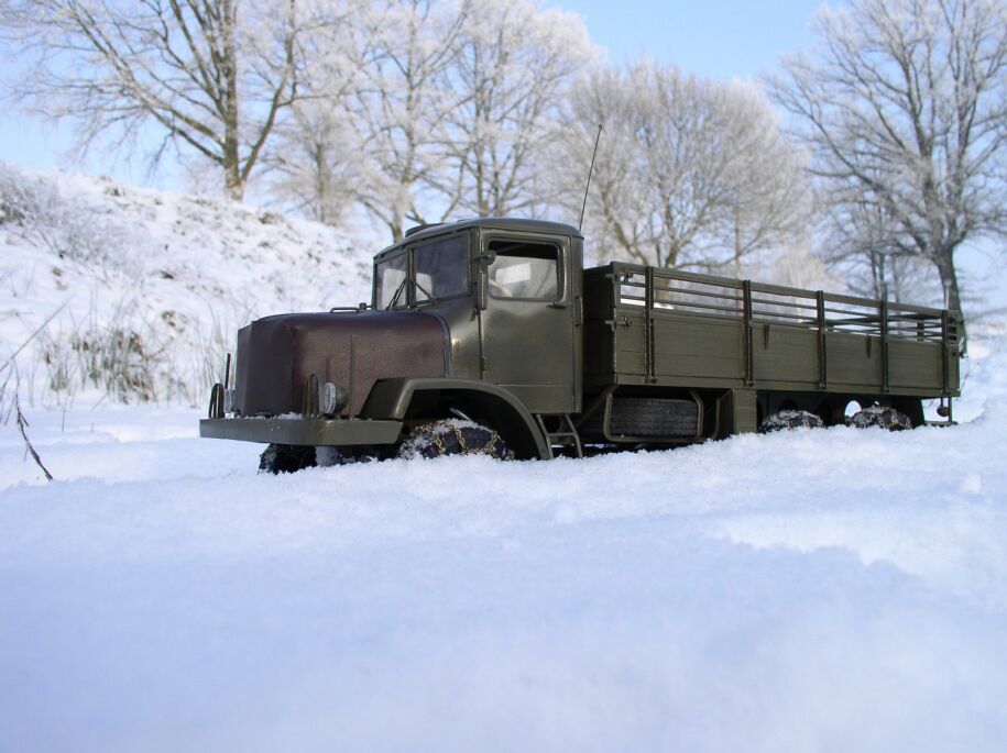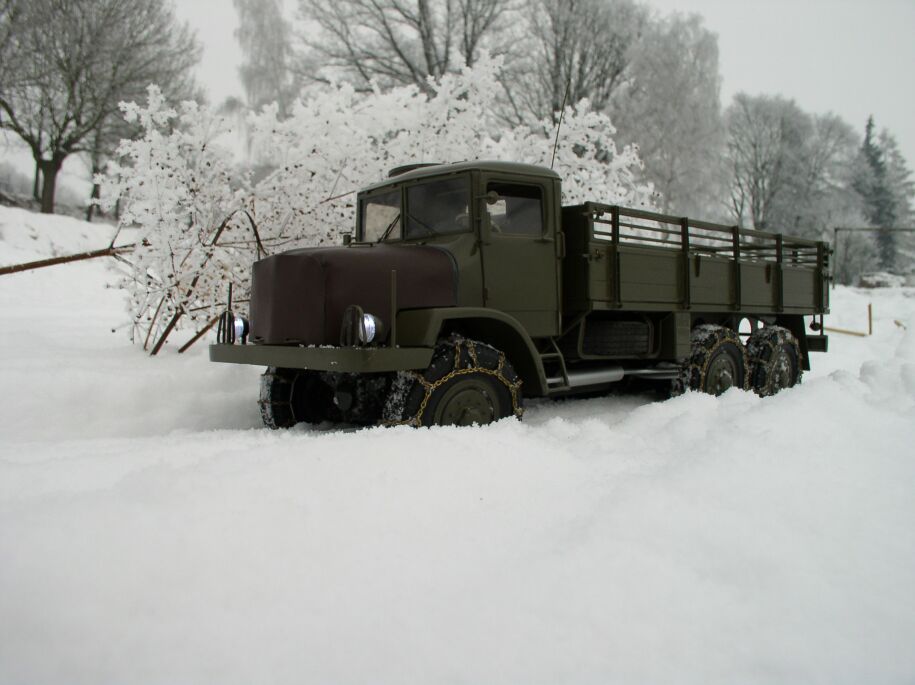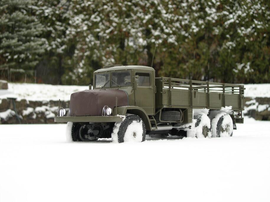 Odpoledni bitva s hlubokym snehem. Misty dosahovala snehova pokryvka az po predni naraznik, coz je z pohledu Tatry necely metr snehu (a pak ze u nas v zime byva malo snehu :) ). Tatra se do nej statecne zakusovala. Velmi se osvedcila jednoducha montaz pneumatik na zadnich kolech – predni kola rozrazeji a uslapavaji cestu pro zadni kola, ktera snaze zenou auto vpred. Toto konstrukcni reseni je primarne urceno prave pro tyto situace – hluboky snih, bahno, pisek atd. Misty vsak bylo snehu tolik, ze ani vysoka svetla vyska nepomohla a Tatra nekolikrat uvizla na roure. Pak prisly ke slovu lopaty a navijak ;) .