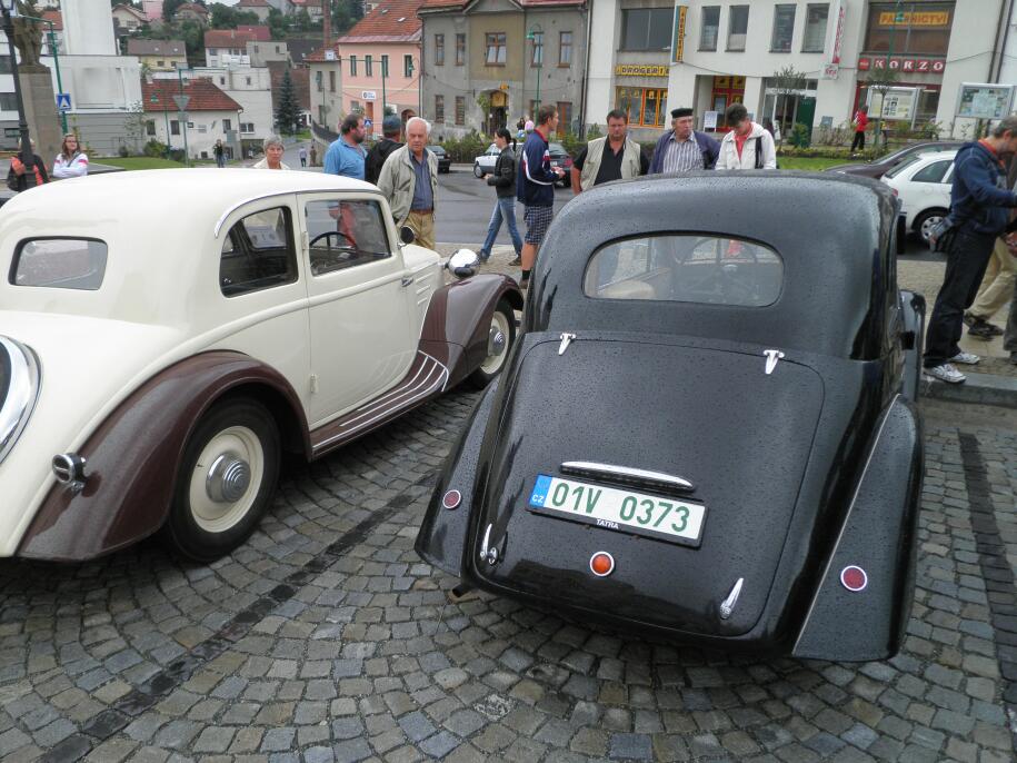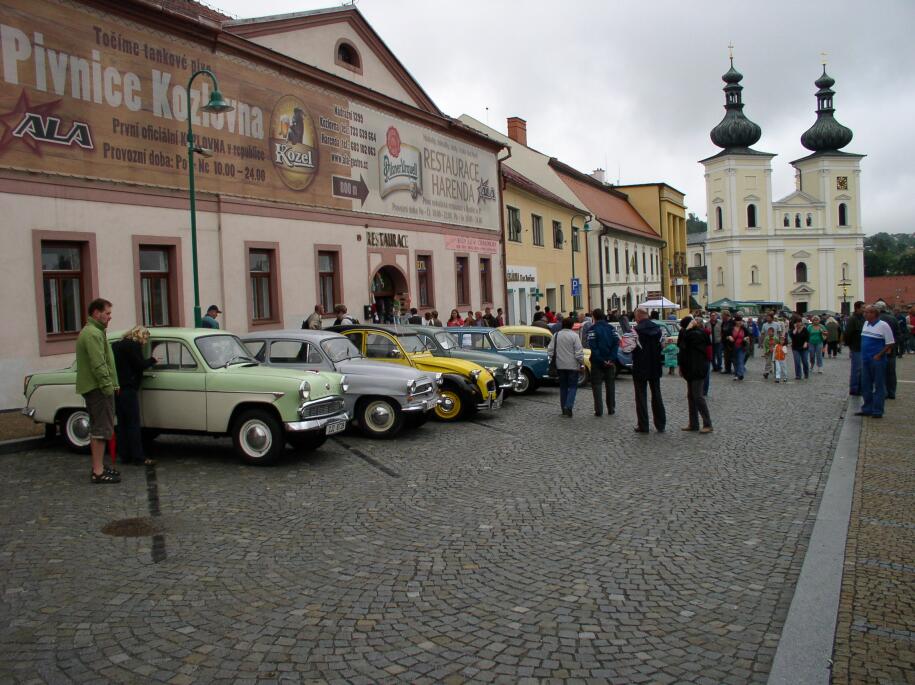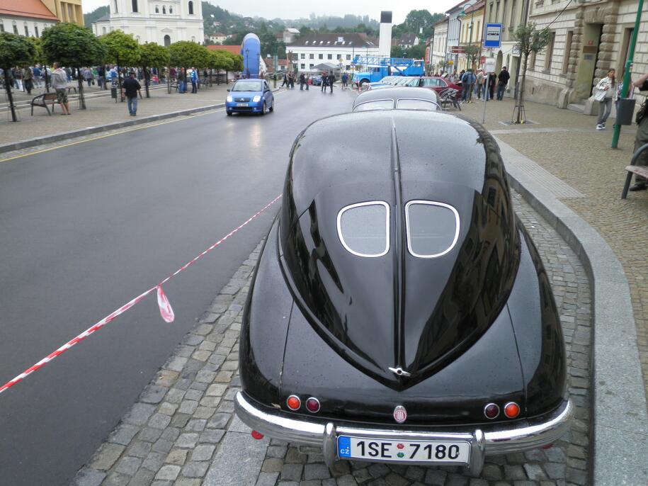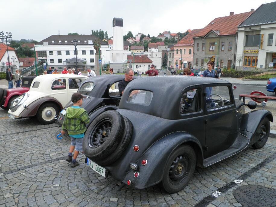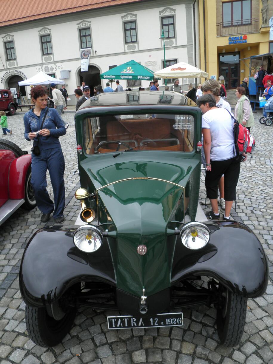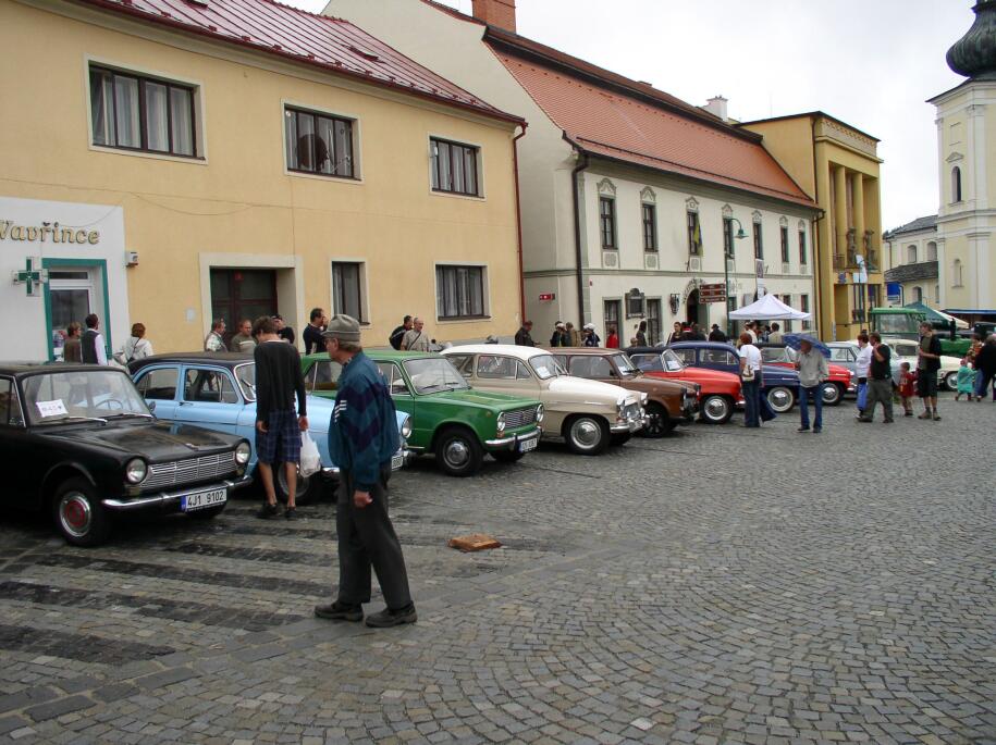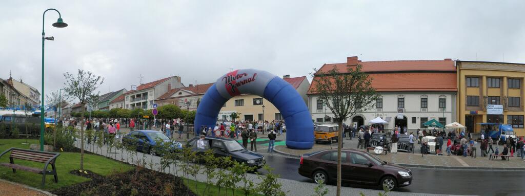 Našeho Renaultíka jsme zaparkovali do řady a šli jsme se zaregistrovat. Nad náměstím se tyčil mohutný modrý nafukovací oblouk MotorJournalu. Hlavního organizátora, pana Proseckého, jsem objevil právě tady. Představování jménem netřeba, stačila dvojice klíčových slov "Tatra 130" – a hned bylo jasno :) . Obdržel jsem registrační kartičku a vydal jsem se na obhlídku skvostů, se kterými přijeli další účastníci. Náměstí se postupně téměř zaplnilo.