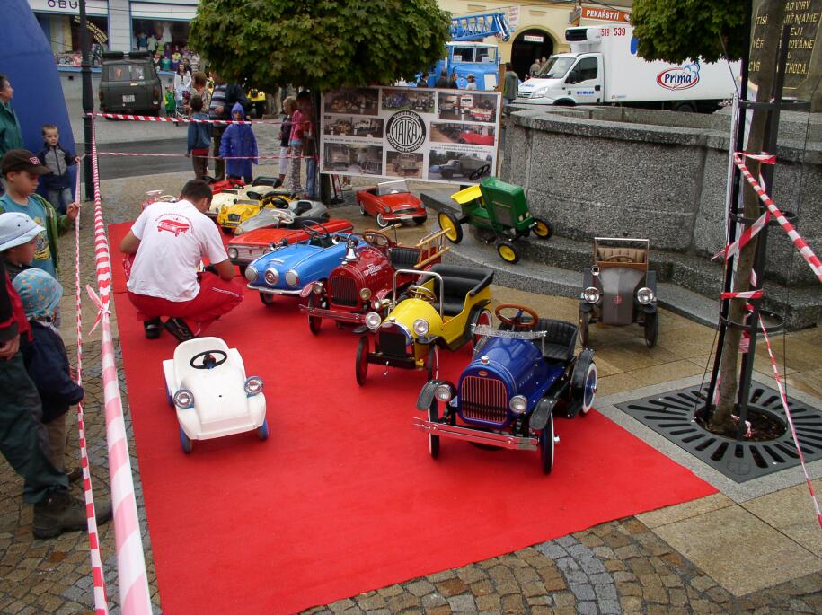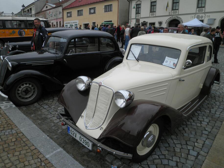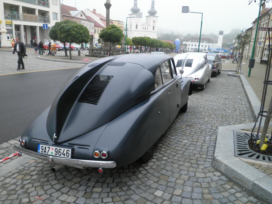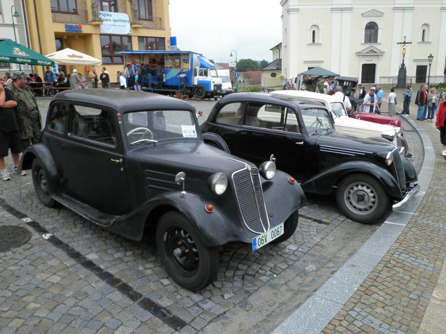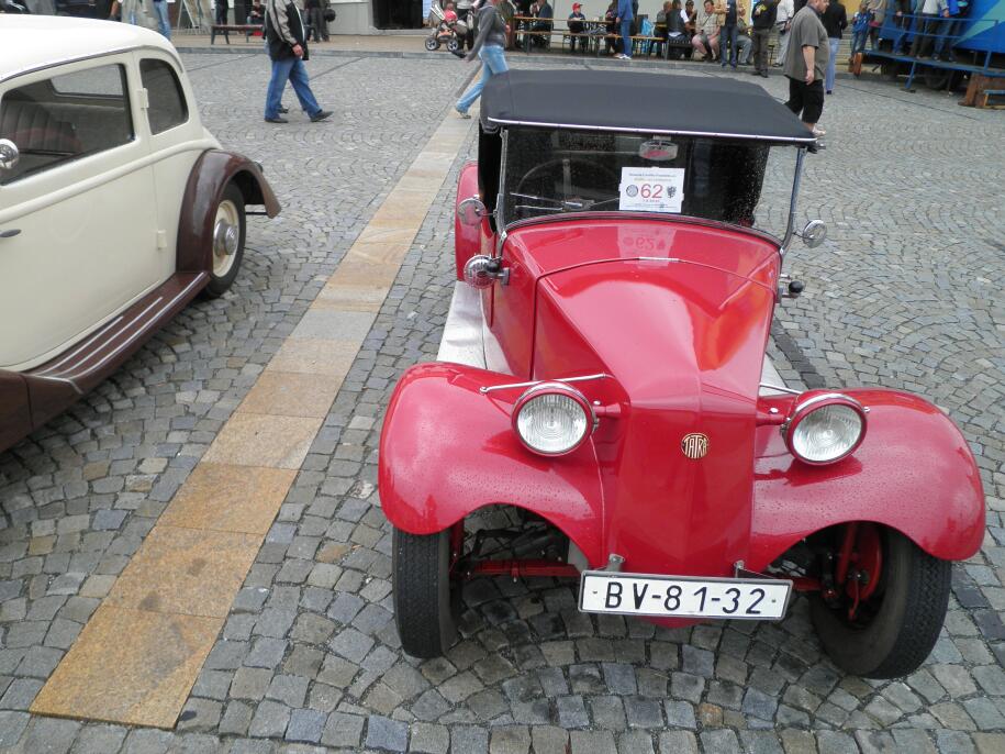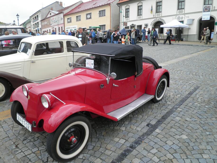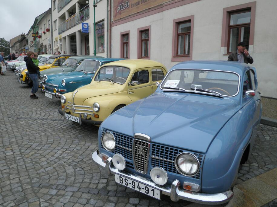 Našeho Renaultíka jsme zaparkovali do řady a šli jsme se zaregistrovat. Nad náměstím se tyčil mohutný modrý nafukovací oblouk MotorJournalu. Hlavního organizátora, pana Proseckého, jsem objevil právě tady. Představování jménem netřeba, stačila dvojice klíčových slov "Tatra 130" – a hned bylo jasno :) . Obdržel jsem registrační kartičku a vydal jsem se na obhlídku skvostů, se kterými přijeli další účastníci. Náměstí se postupně téměř zaplnilo.
