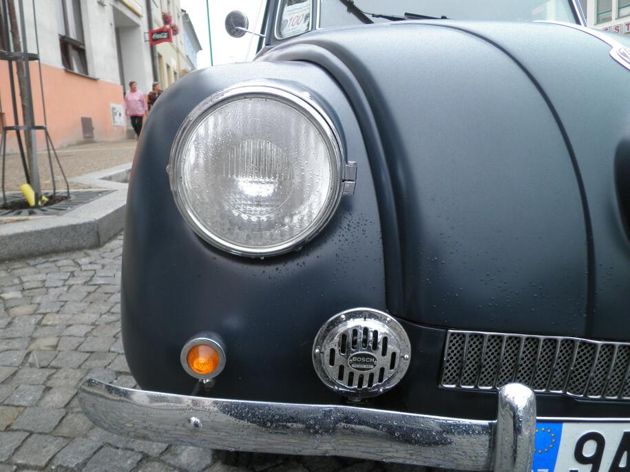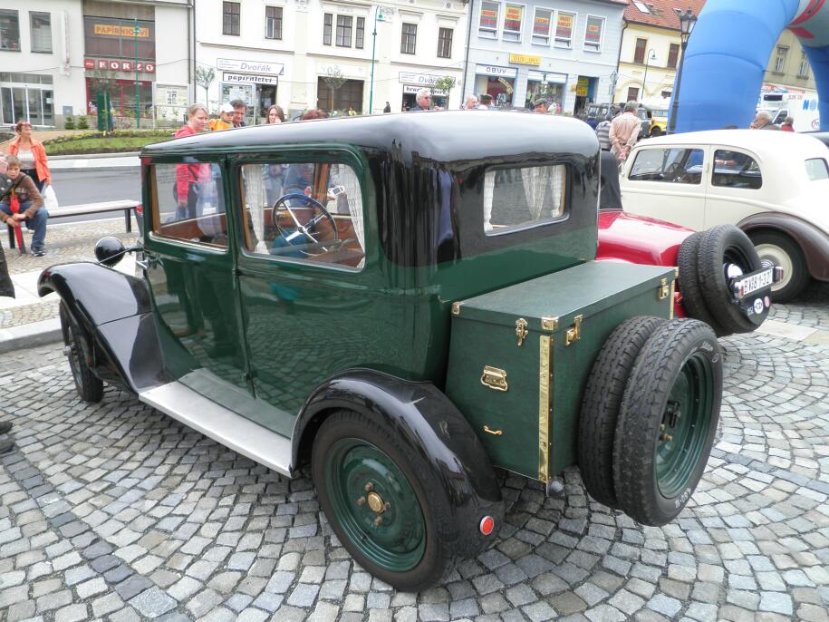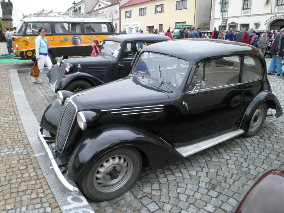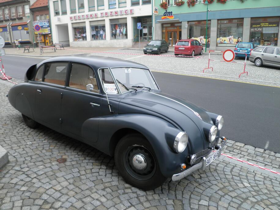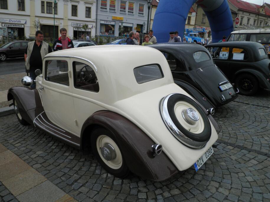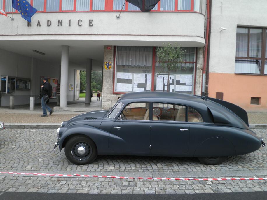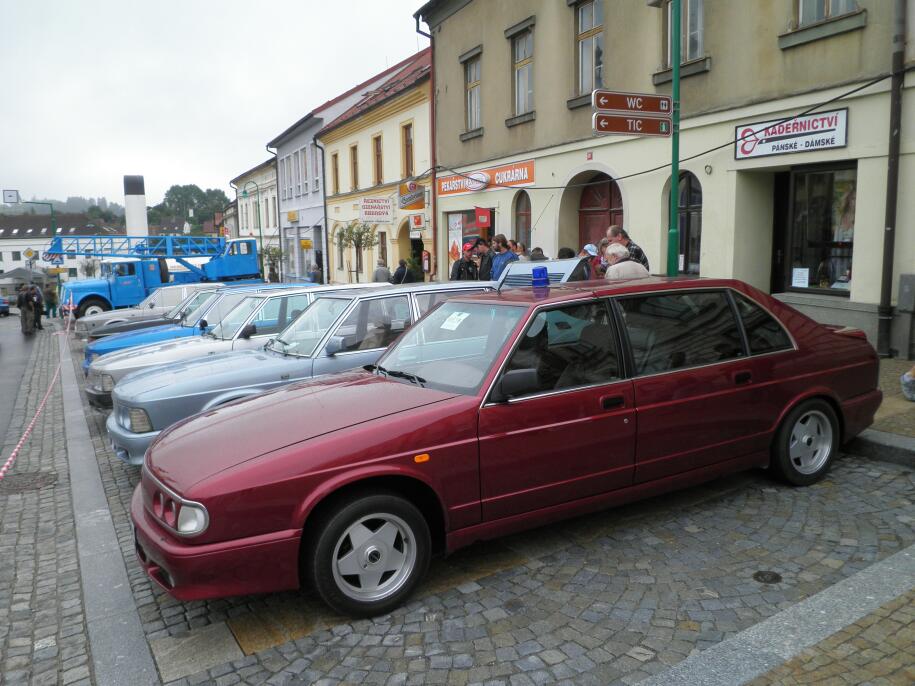 Našeho Renaultíka jsme zaparkovali do řady a šli jsme se zaregistrovat. Nad náměstím se tyčil mohutný modrý nafukovací oblouk MotorJournalu. Hlavního organizátora, pana Proseckého, jsem objevil právě tady. Představování jménem netřeba, stačila dvojice klíčových slov "Tatra 130" – a hned bylo jasno :) . Obdržel jsem registrační kartičku a vydal jsem se na obhlídku skvostů, se kterými přijeli další účastníci. Náměstí se postupně téměř zaplnilo.