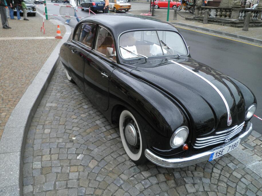 Zřejmě o jedinou výjimku v plynulosti startu se postarala moje Tatra 130. Najel jsem s Renaultíkem na start a krátce jej představil divákům. Na to šéforganizátor s mikrofonem v ruce prohlásil, že "jak mne tak zná, tak ve svém malém voze ukrývám velký náklaďák" a zda může poporosit o ukázku. Původně jsem nechtěl narušovat organizaci startu vzhledem k velkému množství účastníků, ale tohle prostě nešlo odmítnout. Vypnul jsem motor a z auta vyndal velkou tašku. Dav zhoustl, evidentně něco takového nečekali. Z tašky jsem vytáhl Tatru a postavil ji na dlažbu. Spustilo se zběsilé cvakání foťáků ... Představil jsem tedy i Tatru, nejprve krátce historii její skutečné předlohy, něco málo o dokonalém řešení modelového podvozku a šéforganizátor celé představení ukončil s tím, že se moc těší, až si v neděli spolu zajezdíme :) .