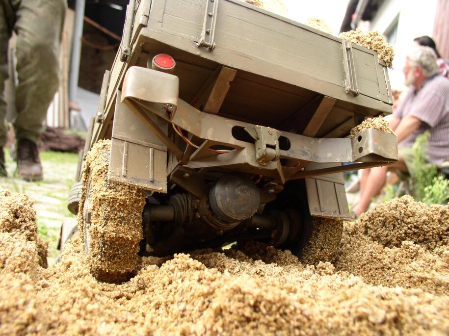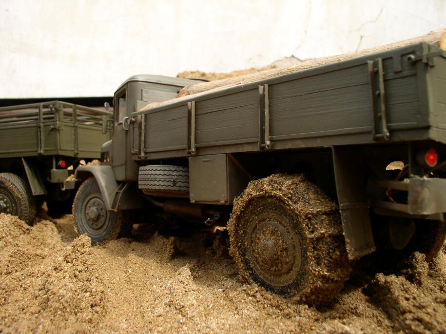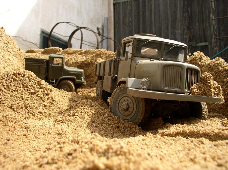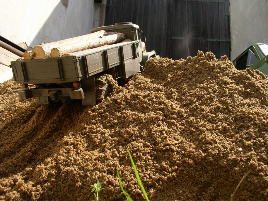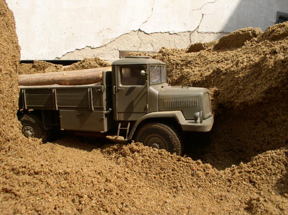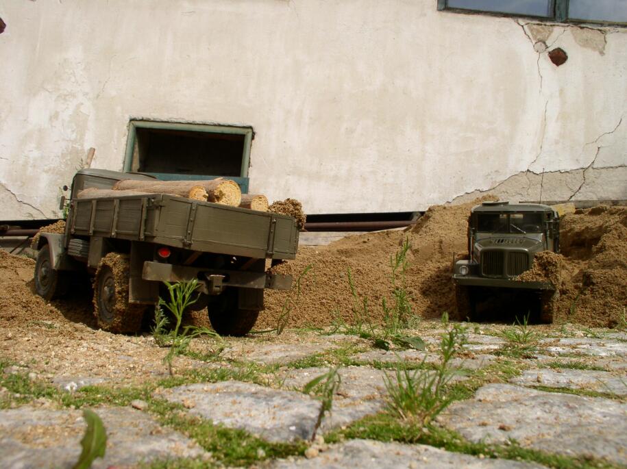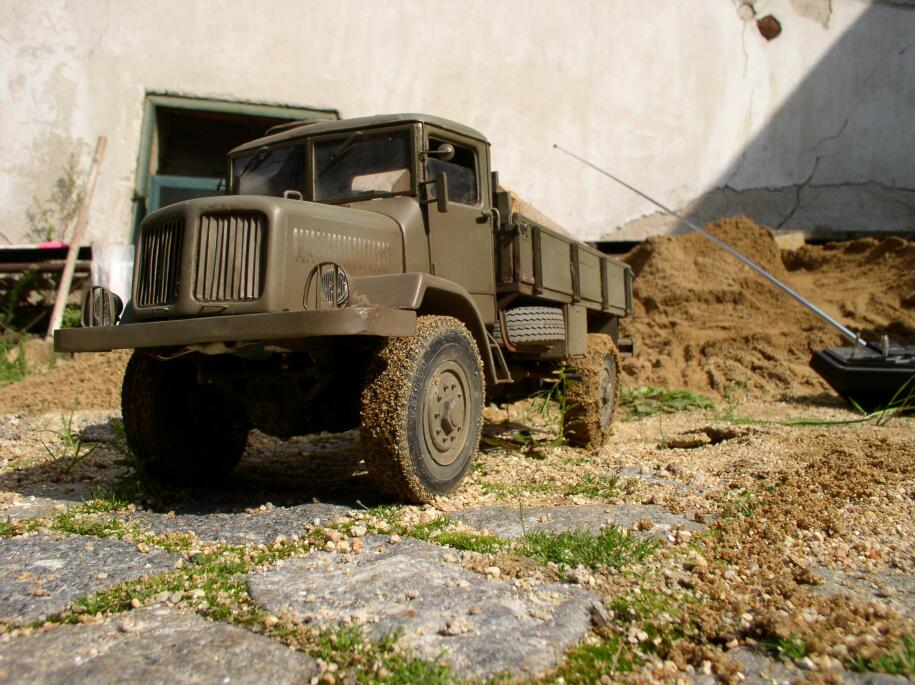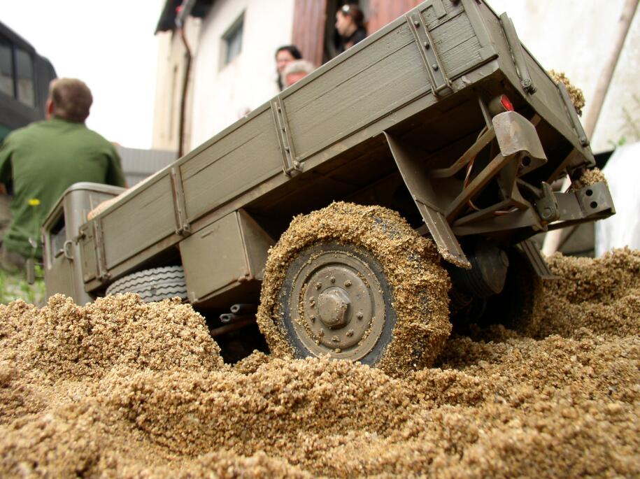 Hrozící dešťové mraky s rozbřeskem zmizely a nás překvapilo slunečné ráno – jako stvořené pro malou projížďku po hromádce písku ... jak taky jinak. Od počátku jsem měl v úmyslu vyzkoušet, jak se bude chovat T128 s řetězy :) . . Až na to, že se z jednoho kola řetěz neustále svlékal, se její "zeměvrtné" schopnosti výrazně zlepšily. Na přední kola jsem to raději neriskoval, majitel tam ještě nemá dorazy (připrav se Pepo, dostal jsem za úkol řetězy vyrobit :) ).