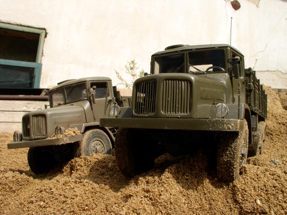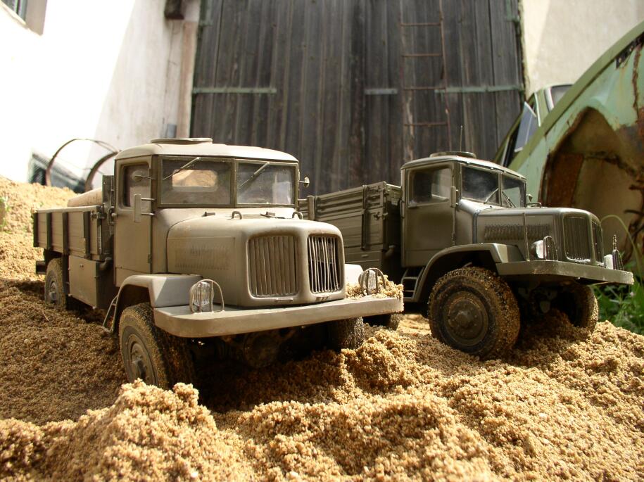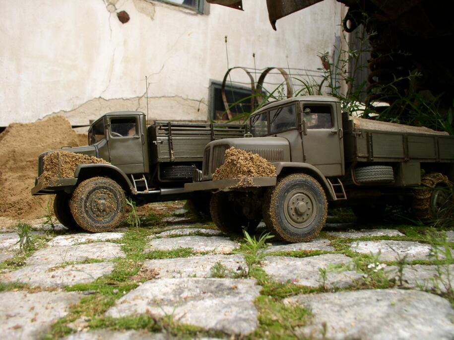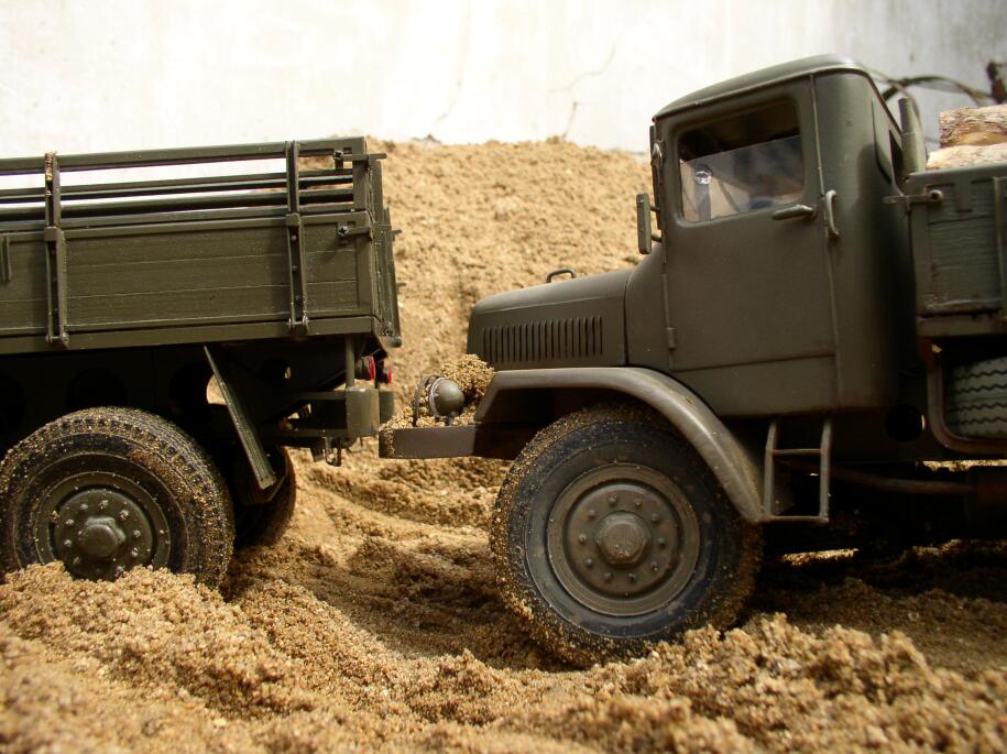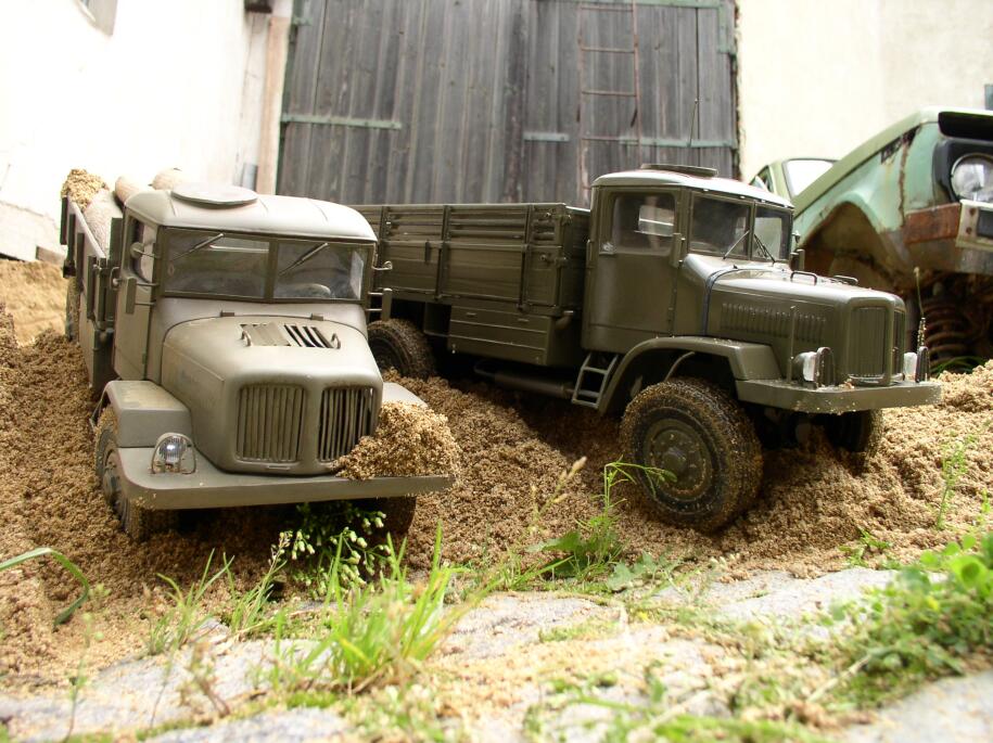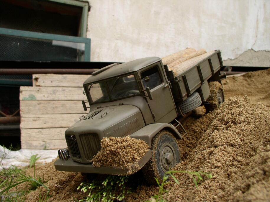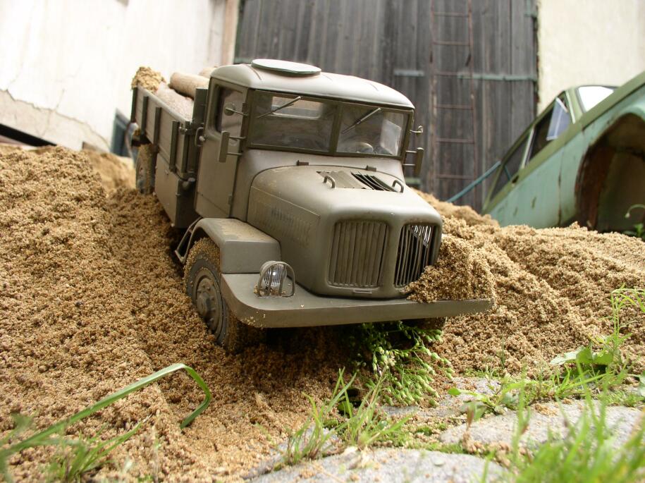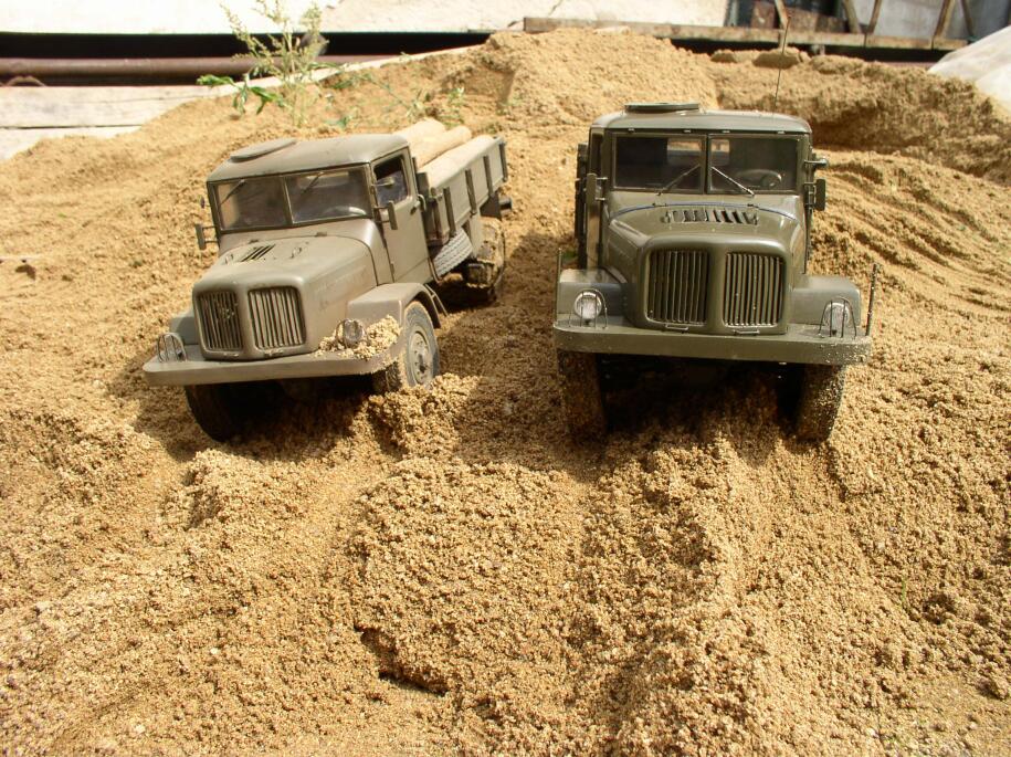 Hrozící dešťové mraky s rozbřeskem zmizely a nás překvapilo slunečné ráno – jako stvořené pro malou projížďku po hromádce písku ... jak taky jinak. Od počátku jsem měl v úmyslu vyzkoušet, jak se bude chovat T128 s řetězy :) . . Až na to, že se z jednoho kola řetěz neustále svlékal, se její "zeměvrtné" schopnosti výrazně zlepšily. Na přední kola jsem to raději neriskoval, majitel tam ještě nemá dorazy (připrav se Pepo, dostal jsem za úkol řetězy vyrobit :) ).