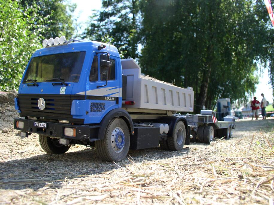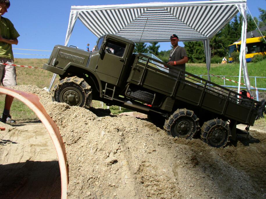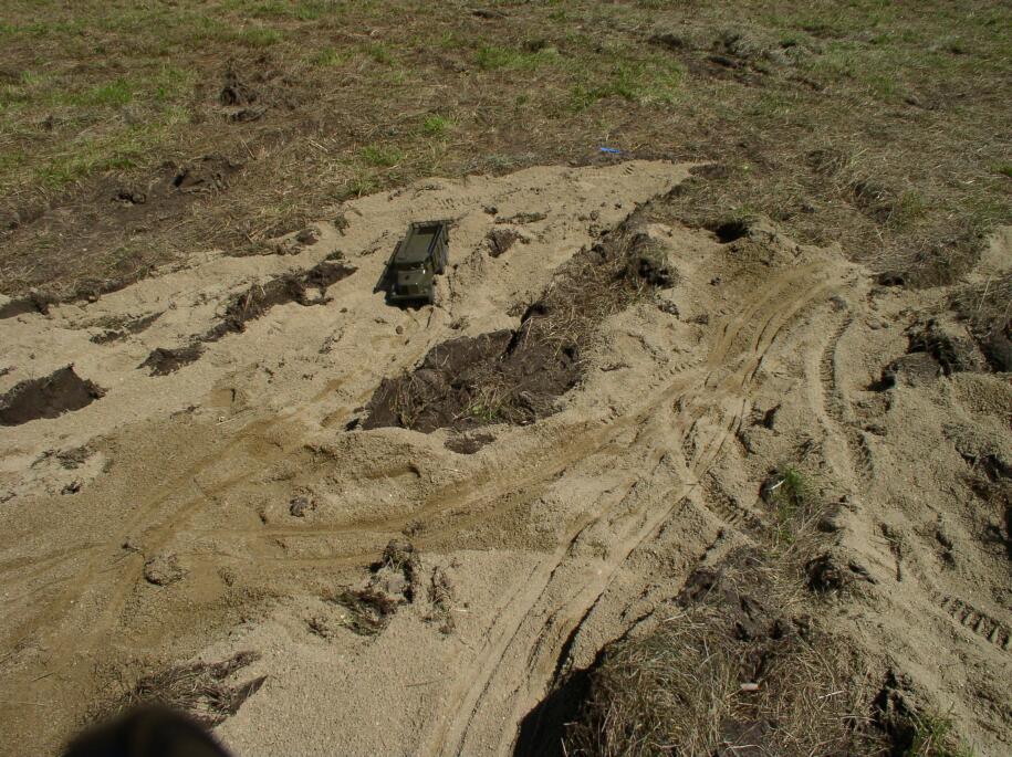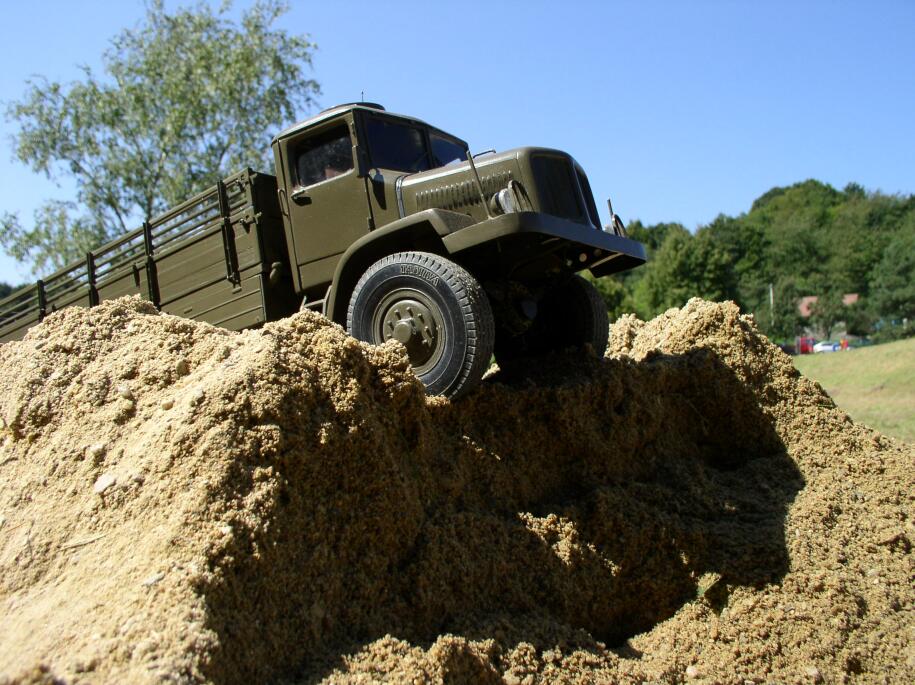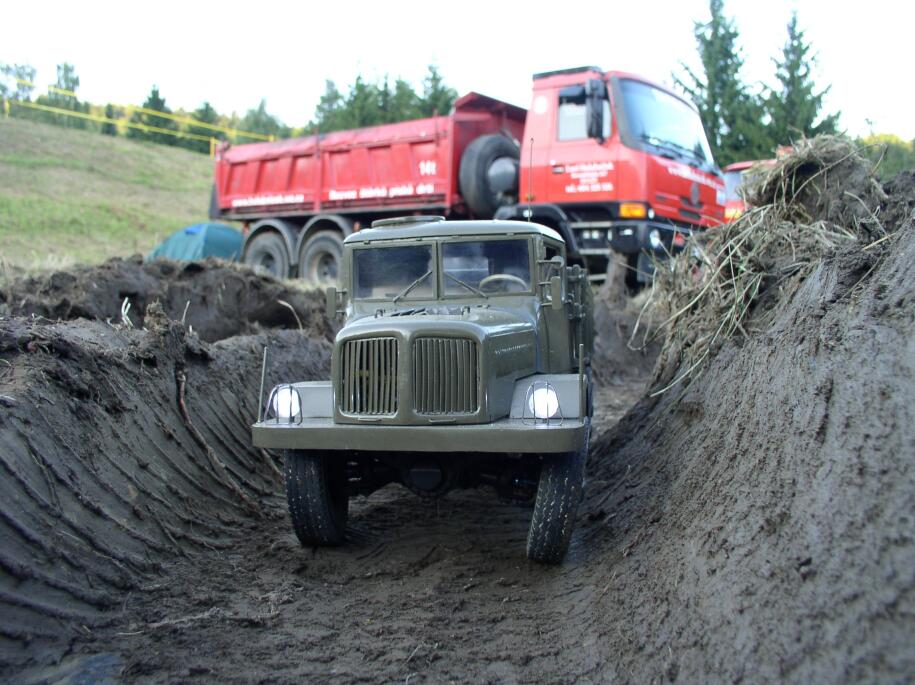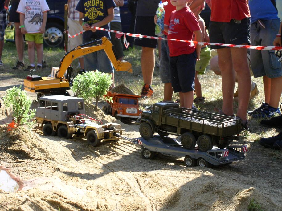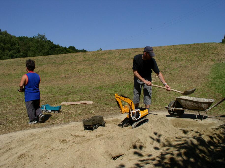 Hromádku písku jsme měli připravenou v travnatém svahu na tenké igelitové podložce. Ihned jsme ji přemístili na asfaltový chodník, aby se dalo jezdit i okolo, protože jízda ve vysoké trávě není pro modely nic moc. Z písku jsme vymodelovali krajinu lehkého terénního rázu se zakomponovaným brodem a základem tunelu. Nejhojnější hemžení modelů nastalo hned poté – to jezdilo snad všechno, co mělo kola. Dva bagry měly za úkol plnit tři sklápěčky a ty měly nasypávat druhý svah tunelu. Bohužel tento záměr vzal záhy za své – pro technické problémy začaly odpadat Tatry jedna za druhou. Nejdřív modrá T815 8x8 S1, v zápětí tahač Jamal přišel o pohon všech zadních kol a totéž postihlo dokonce i jindy zcela spolehlivou a léty prověřenou T148 S1 (v neděli před odjezdem už měla v záběru pouze tři kola ze šesti). Asi nějaká špatná konstelace hvězd nebo co. Jen jsem čekal, až postihne nějaký defekt i T130. Nestalo se, naštěstí. Spolehlivě jezdila v sobotu i v neděli.