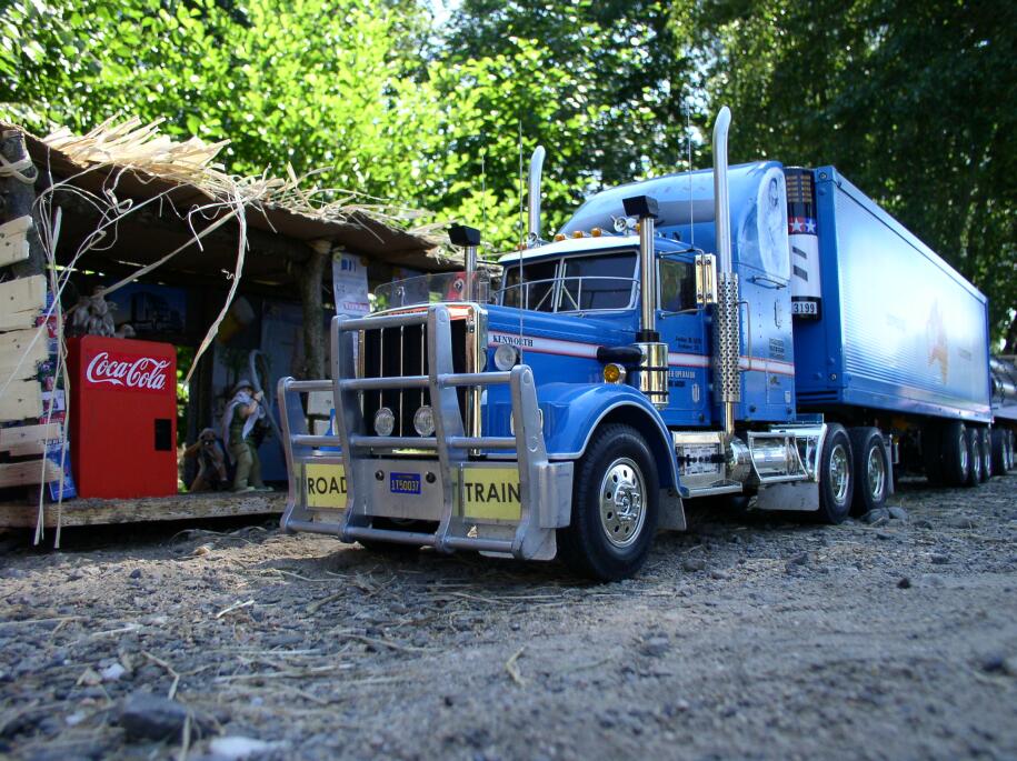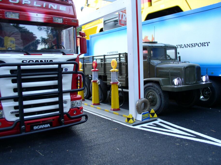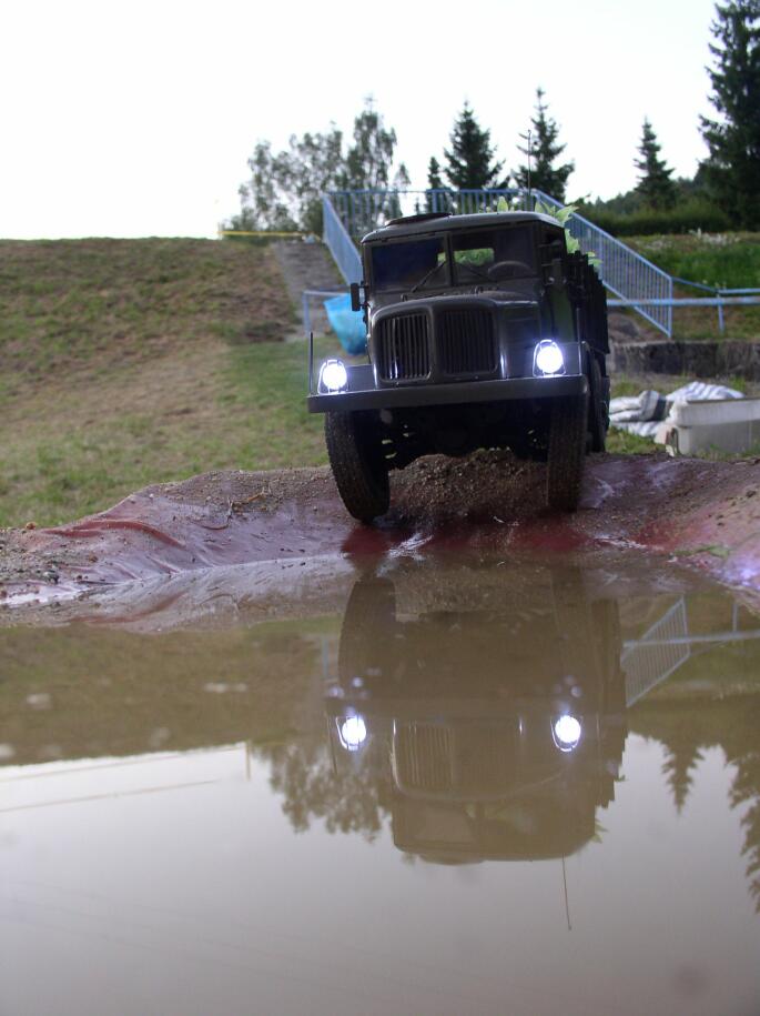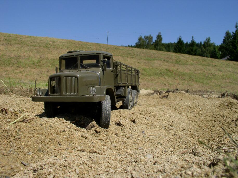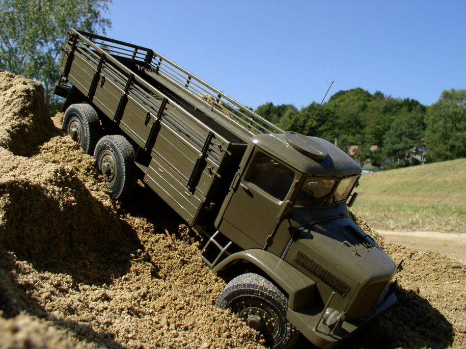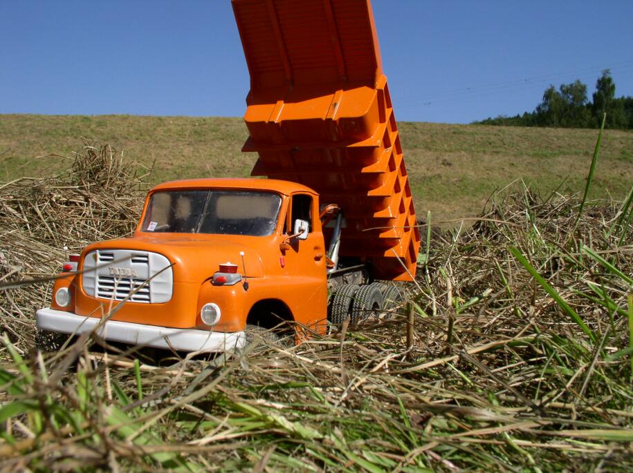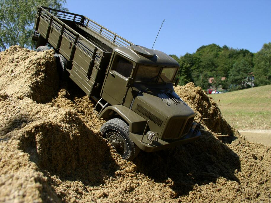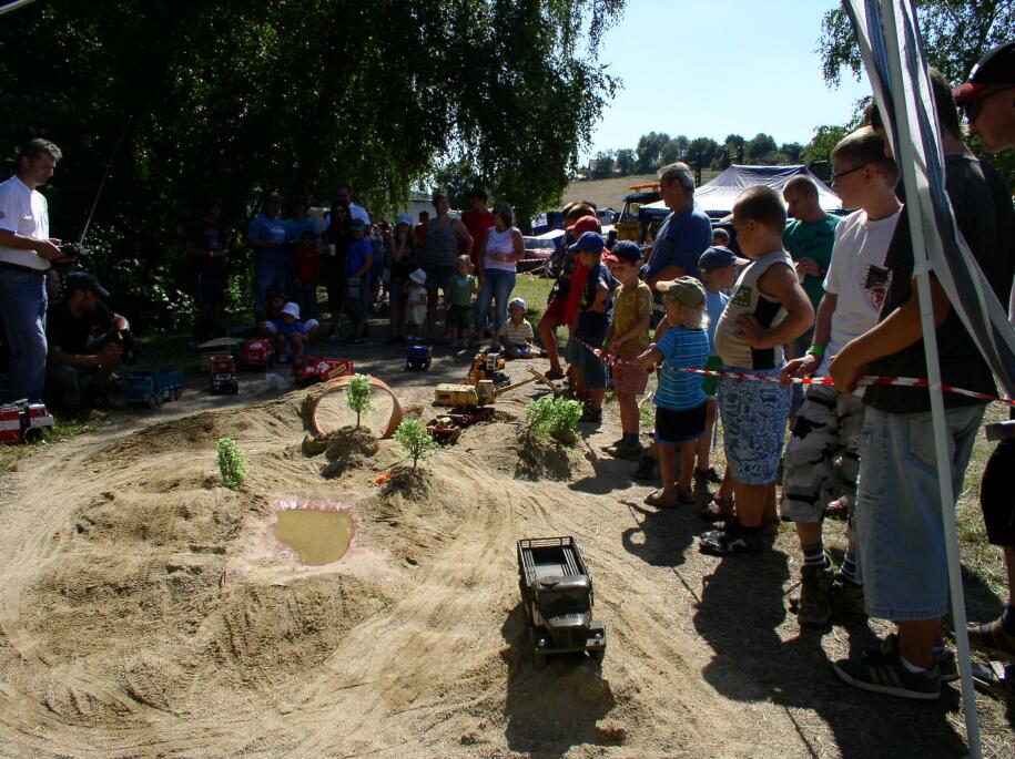 Hromádku písku jsme měli připravenou v travnatém svahu na tenké igelitové podložce. Ihned jsme ji přemístili na asfaltový chodník, aby se dalo jezdit i okolo, protože jízda ve vysoké trávě není pro modely nic moc. Z písku jsme vymodelovali krajinu lehkého terénního rázu se zakomponovaným brodem a základem tunelu. Nejhojnější hemžení modelů nastalo hned poté – to jezdilo snad všechno, co mělo kola. Dva bagry měly za úkol plnit tři sklápěčky a ty měly nasypávat druhý svah tunelu. Bohužel tento záměr vzal záhy za své – pro technické problémy začaly odpadat Tatry jedna za druhou. Nejdřív modrá T815 8x8 S1, v zápětí tahač Jamal přišel o pohon všech zadních kol a totéž postihlo dokonce i jindy zcela spolehlivou a léty prověřenou T148 S1 (v neděli před odjezdem už měla v záběru pouze tři kola ze šesti). Asi nějaká špatná konstelace hvězd nebo co. Jen jsem čekal, až postihne nějaký defekt i T130. Nestalo se, naštěstí. Spolehlivě jezdila v sobotu i v neděli.