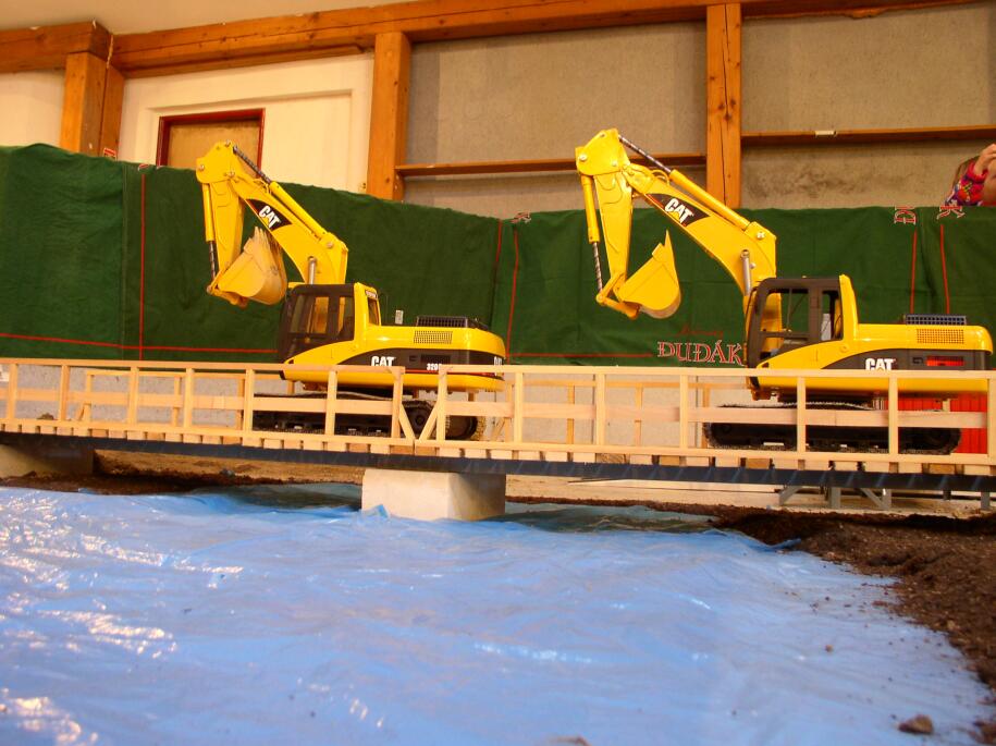 Bagry měly předem připraveny své hromádky materiálu. Sypké materiály byly vůbec kapitola sama pro sebe – použity byly 2 druhy: vlhká písko-hlína, sypká tak akorát a po uježdění i poměrně pevná. Ideální pro stavbu nájezdů k mostu. Dále pak suchá rašelina pro snadné nakládání dlouhých návěsů.