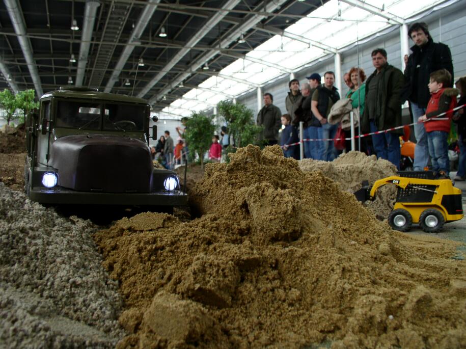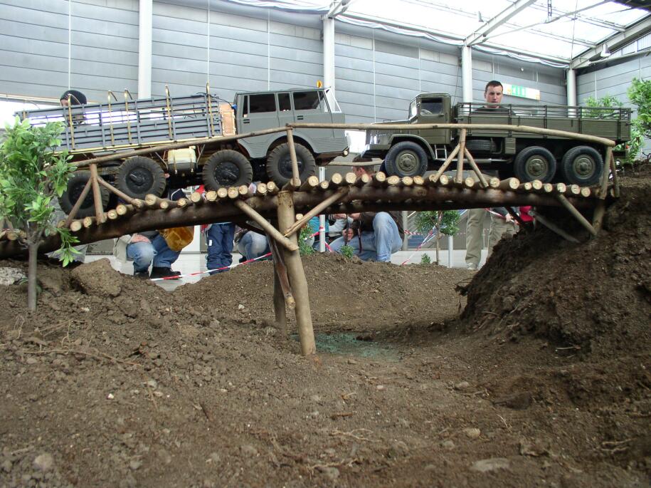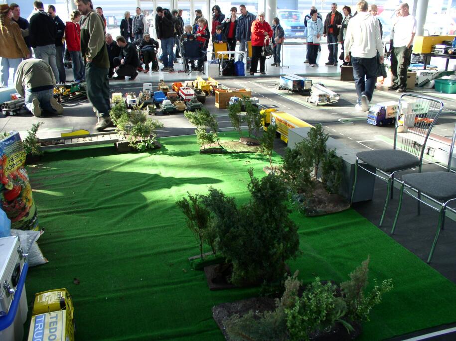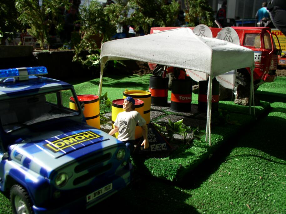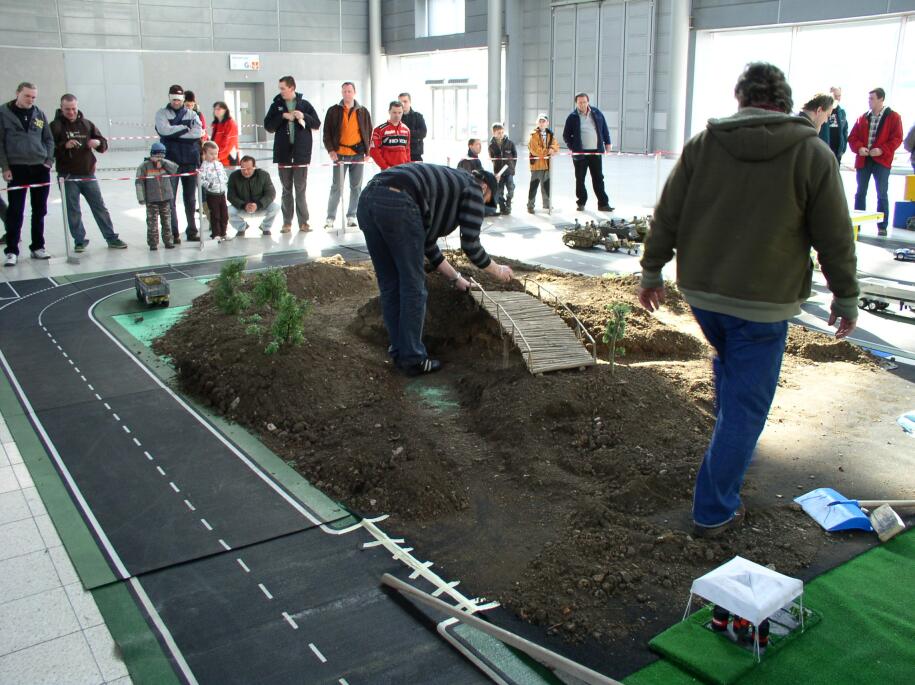 Modelová trať byla relativně velká plocha s asfaltovým okruhem a dvěma terénními oblastmi. Nechyběla benzínka, sklad stavebního materiálu a parkoviště TIR. Jedna terénní oblast byla tvořena tvrdou hlínou, která se postupem času začala drolit. Náročnost jízdy v takového terénu asi nemusím blíže popisovat. Druhá byla tvořena jednoduchými polystyrénovými stavebními bloky, mezi nimiž byl prostor vysypán měkkou rašelinou. Větve jehličnanů zapíchané v polystyrénu působily velice realisticky, jak ostatně uvidíte na videu. Milda za tuto jednoduchou ale velmi nápaditou a fotogenickou trať má ode mne velkou jedničku s hvězdičkou.