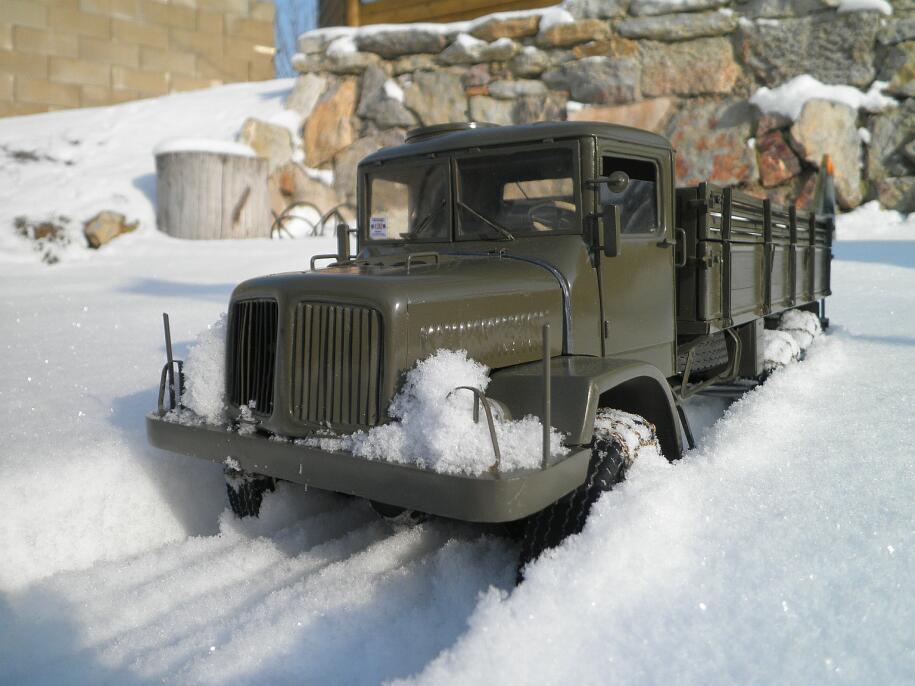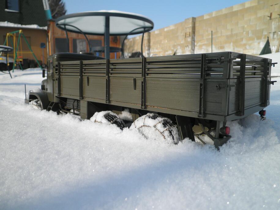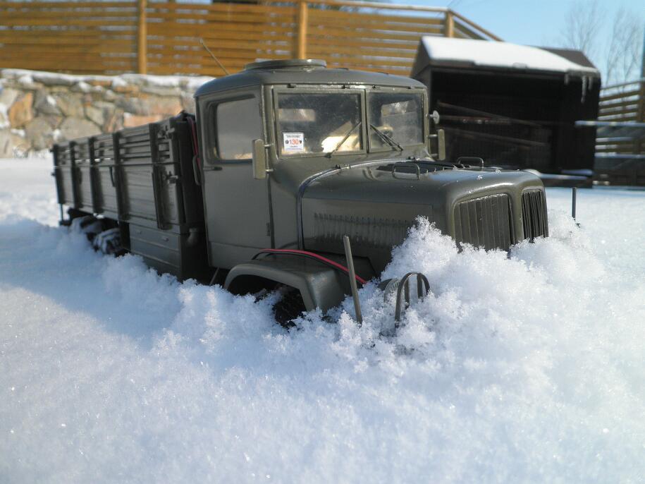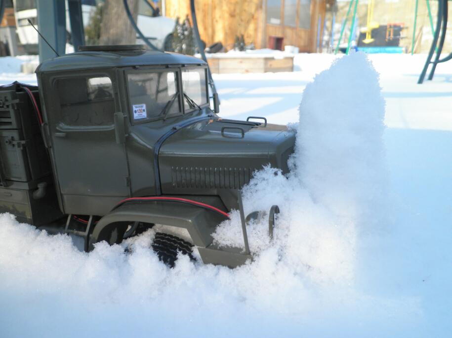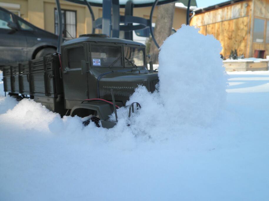 Sníh byl krásně přemrzlý, tudíž hodně sypký, nedalo se ani pořádně vyjet na chodník. Nepomáhaly ani řetězy, ani posyp ;) . Tatry bez řetězů stály bezmocně před nájezdem, sto-třicítka se statečně zavrtávala do něj. Nakonec se tam s vypětím všech sil přeci jen vyškrábala, ovšem zle při tom poničila jeden z předních řetězů (právě o obrubník). Při zdolávání tohoto výjezdu jsem si plně uvědomil, že se budu muset naučit nové techniky jízdy. Už neexistuje, abych si točil elektromotorem, jak se mi zlíbí – když je zařazená dvojka, tak to dává pouze určitý velmi omezený rozsah rychlosti otáčení kol. Stejně tak rozjet se do kopce znamená dát jedničku, plný plyn, přeřadit na dvojku, plný plyn, přeřadit na trojku ... to samozřejmě vyžaduje čas i prostor – stejně jako ve skutečném náklaďáku. A pokud chci udržet určitou míru realističnosti, nelze si pod plynem ve stoupání jen tak podřadit. Prostě to chce zvolit pod kopcem správný kvalt ;)